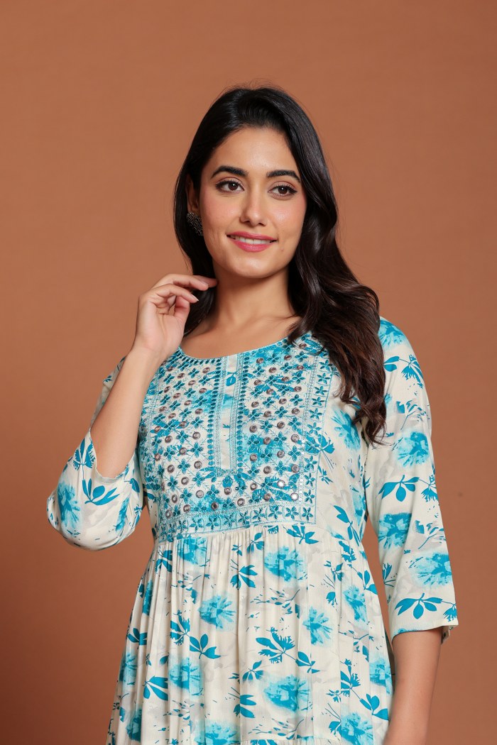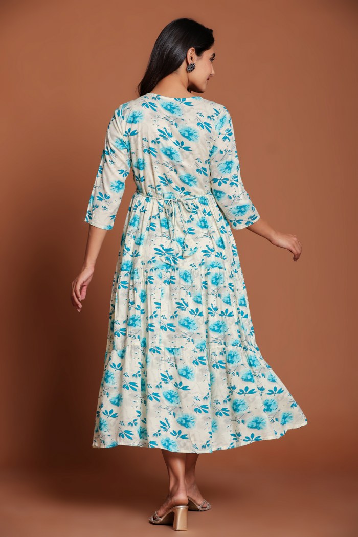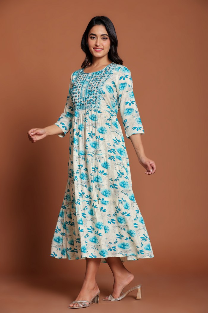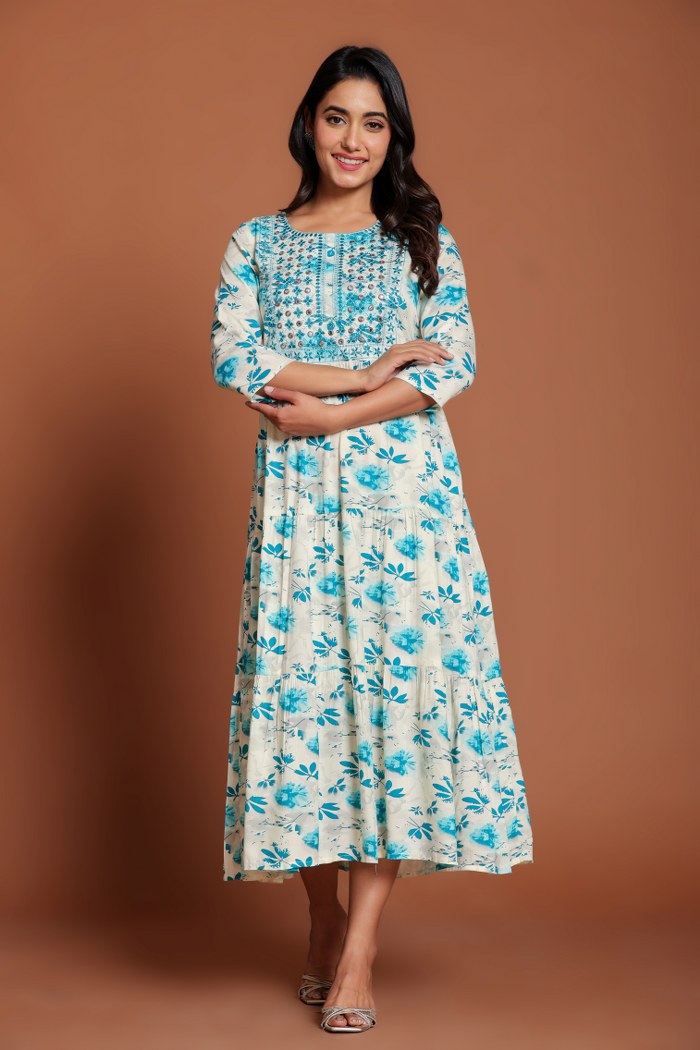 Bring a refreshing charm to your everyday and occasion wear with this elegant beige Anarkali-style midi dress featuring beautiful blue floral prints. Crafted in soft cotton, this midi showcases intricate thread embroidery with mirror work on the yoke, lending a sophisticated and festive appeal. The round neckline, three-quarter sleeves, and flowy tiered silhouette ensure both comfort and style. Ideal for brunches, festive gatherings, or casual outings, this dress pairs perfectly with statement earrings and block heels for a graceful finish.