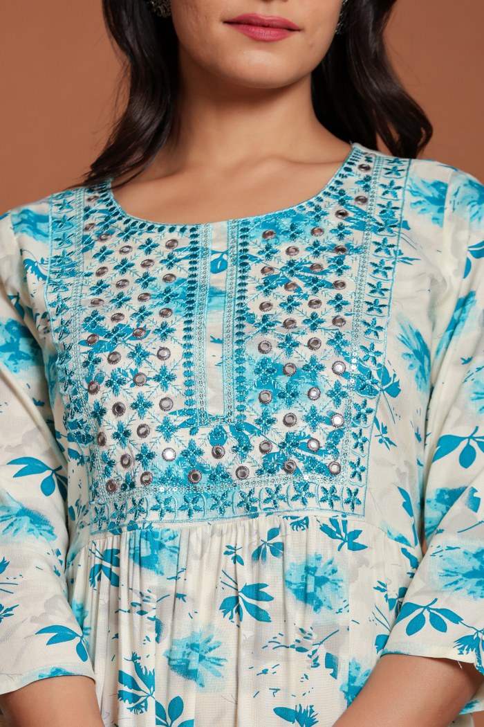Beige & Blue Floral Printed Anarkali Midi with Embroidered Yoke