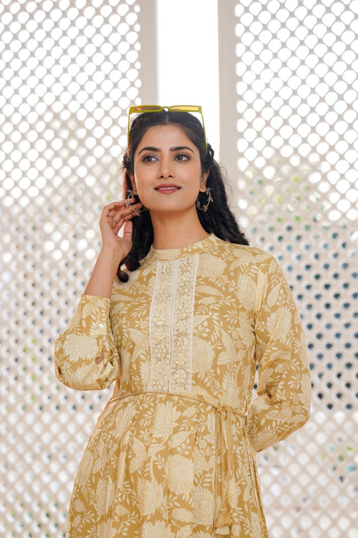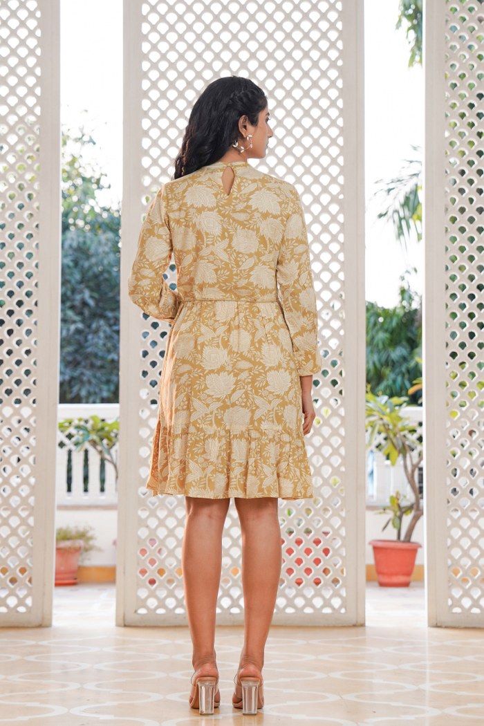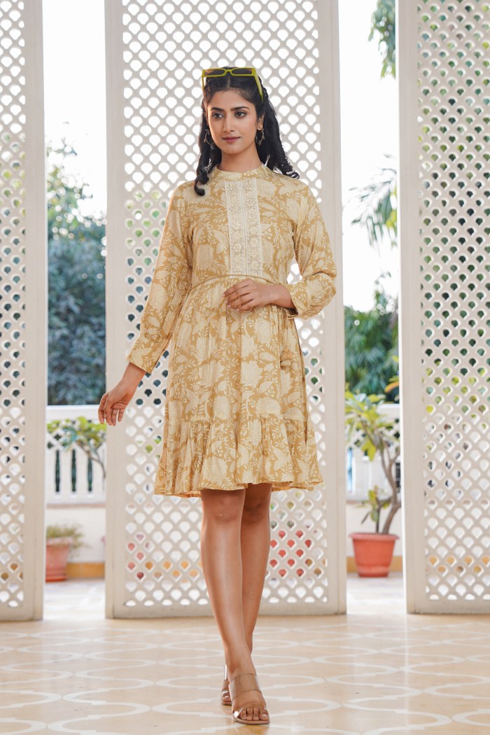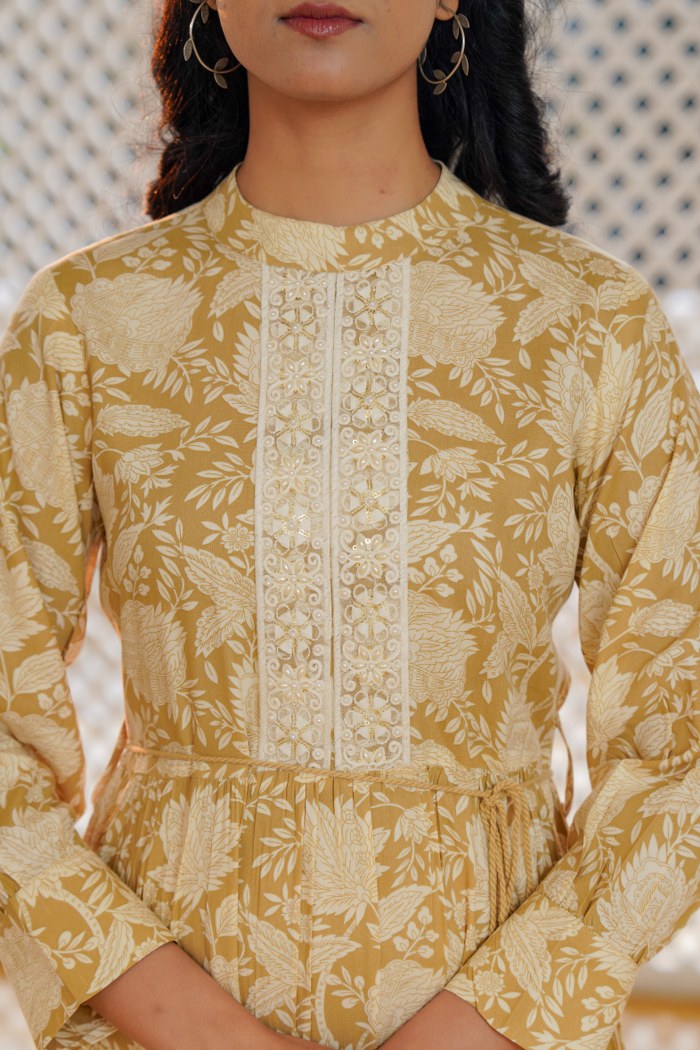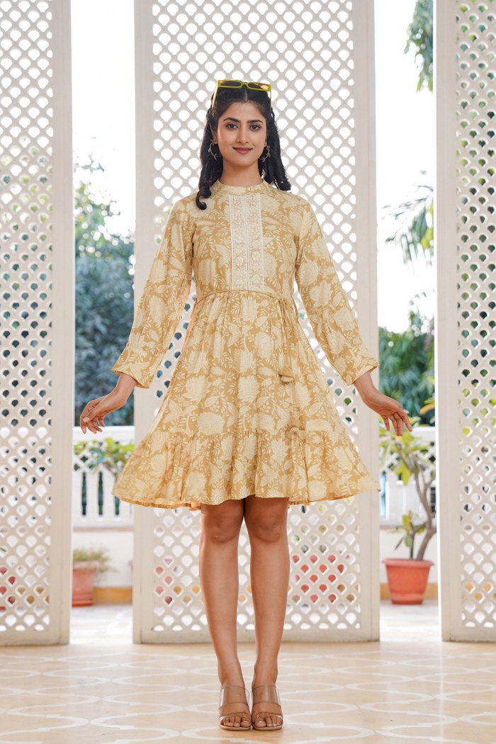 Add a touch of elegance and freshness to your wardrobe with this beautiful beige yellow A-line short dress. Featuring an intricate off-white floral print, this dress is enhanced with delicate lacework on the front placket, charming fabric buttons, and an adjustable drawstring waist with tassels. The relaxed fit and flared hem create a playful yet graceful silhouette, making it ideal for casual outings, brunch dates, and holiday wear. Crafted in lightweight cotton blend fabric, it offers comfort along with style.