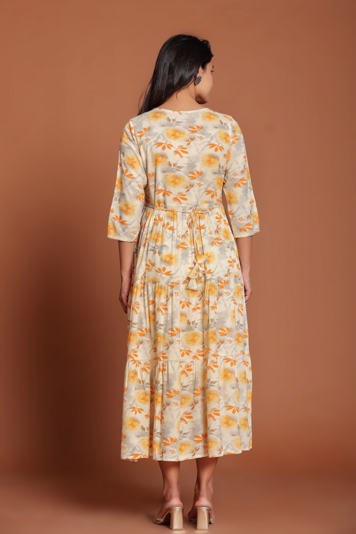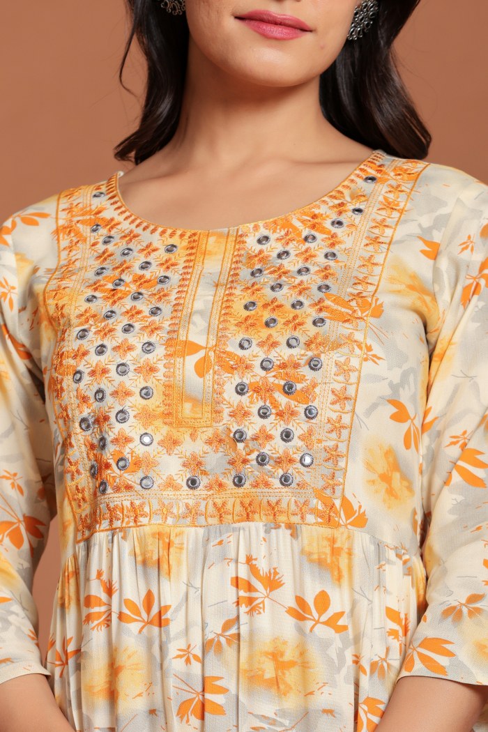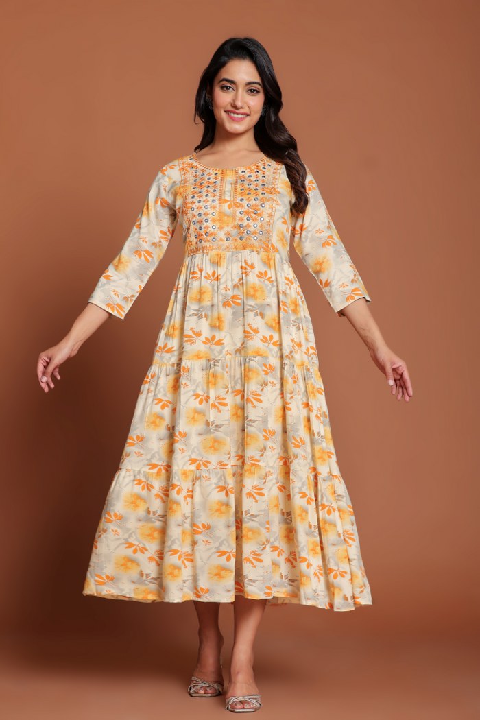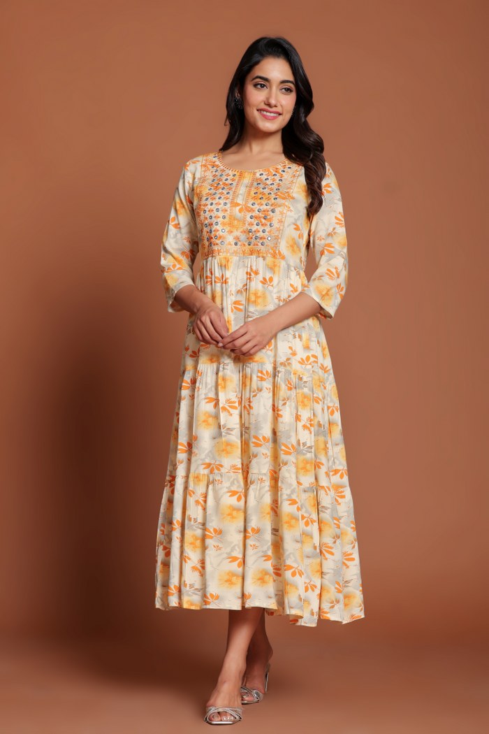 Beige & Yellow Floral Printed Anarkali Midi with Mirror Embellished Yoke