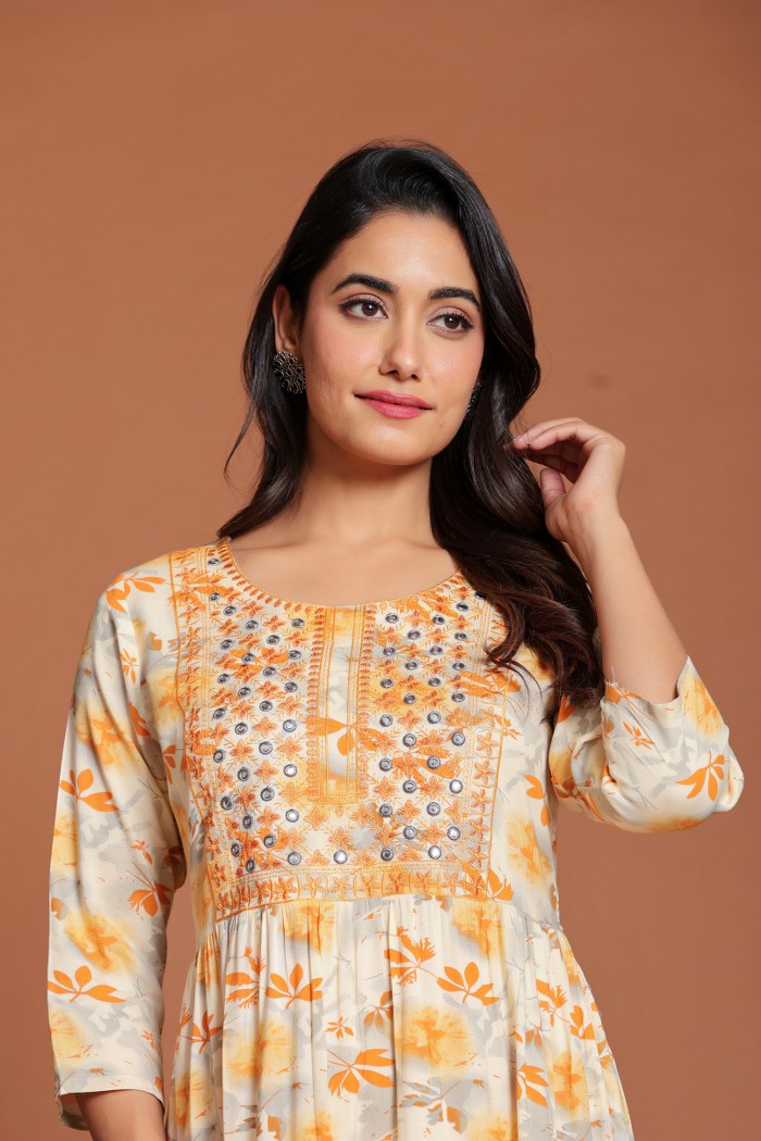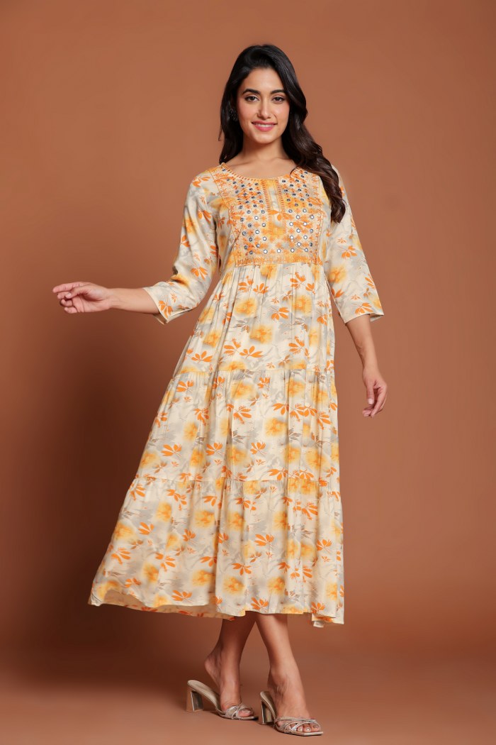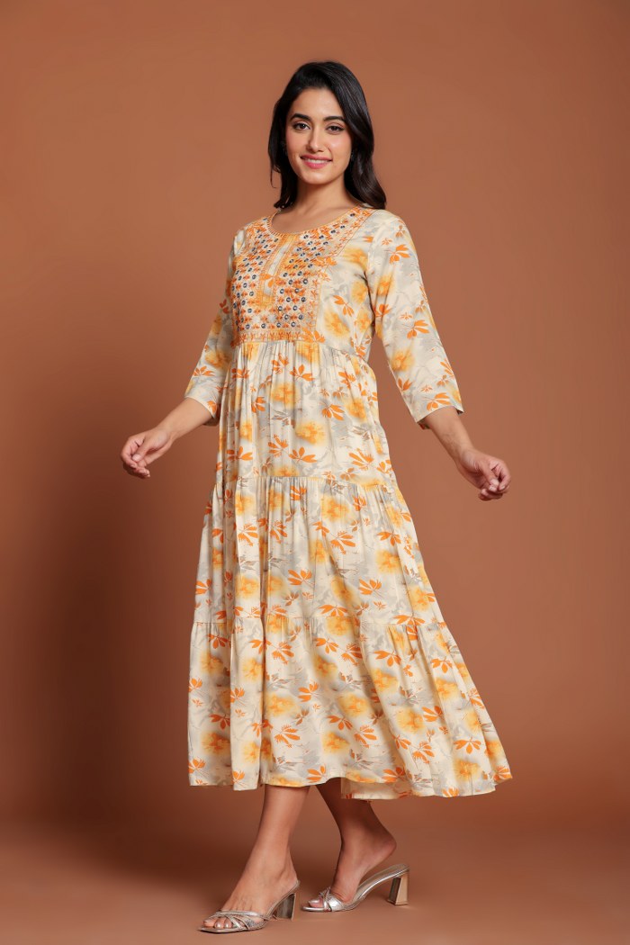 Refresh your wardrobe with this elegant beige Anarkali-style midi dress, featuring cheerful yellow floral prints for a soft, feminine touch. The highlight of this midi is its intricately hand-embroidered yoke adorned with mirror embellishments and detailed thread work, adding festive charm and elegance. Designed with a flattering round neckline, three-quarter sleeves, and a tiered flared silhouette, this piece ensures both comfort and grace. Crafted from soft, breathable cotton, it’s perfect for festive luncheons, casual outings, or daytime celebrations. Style it with delicate jewelry and strappy heels for a graceful look.