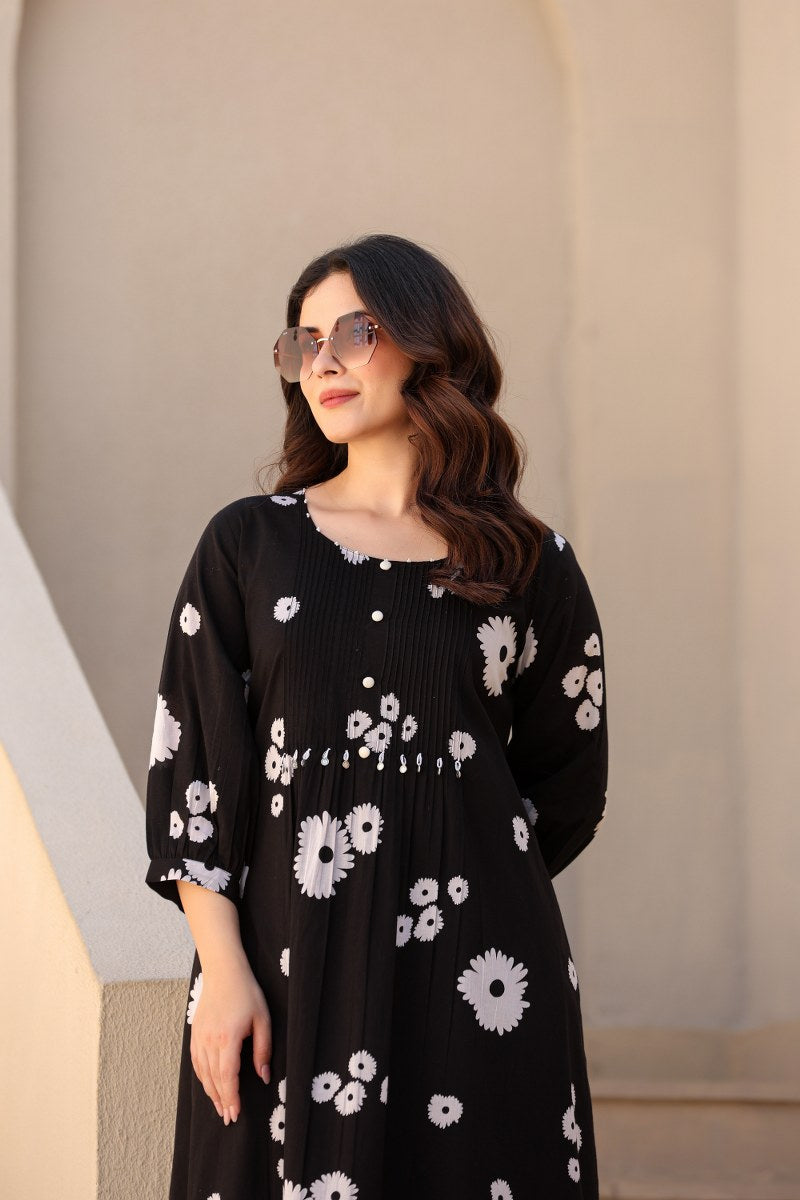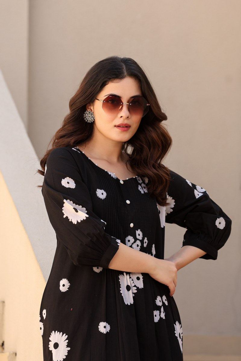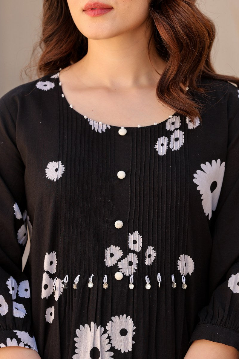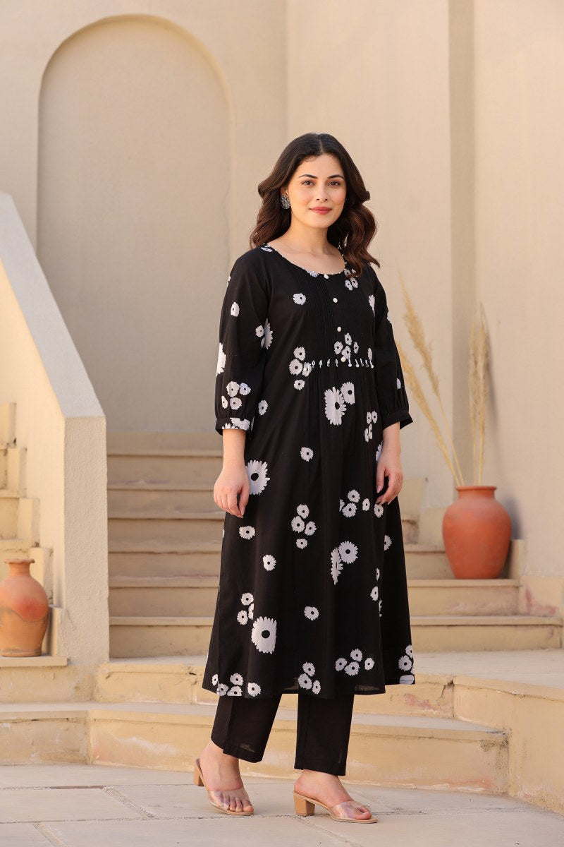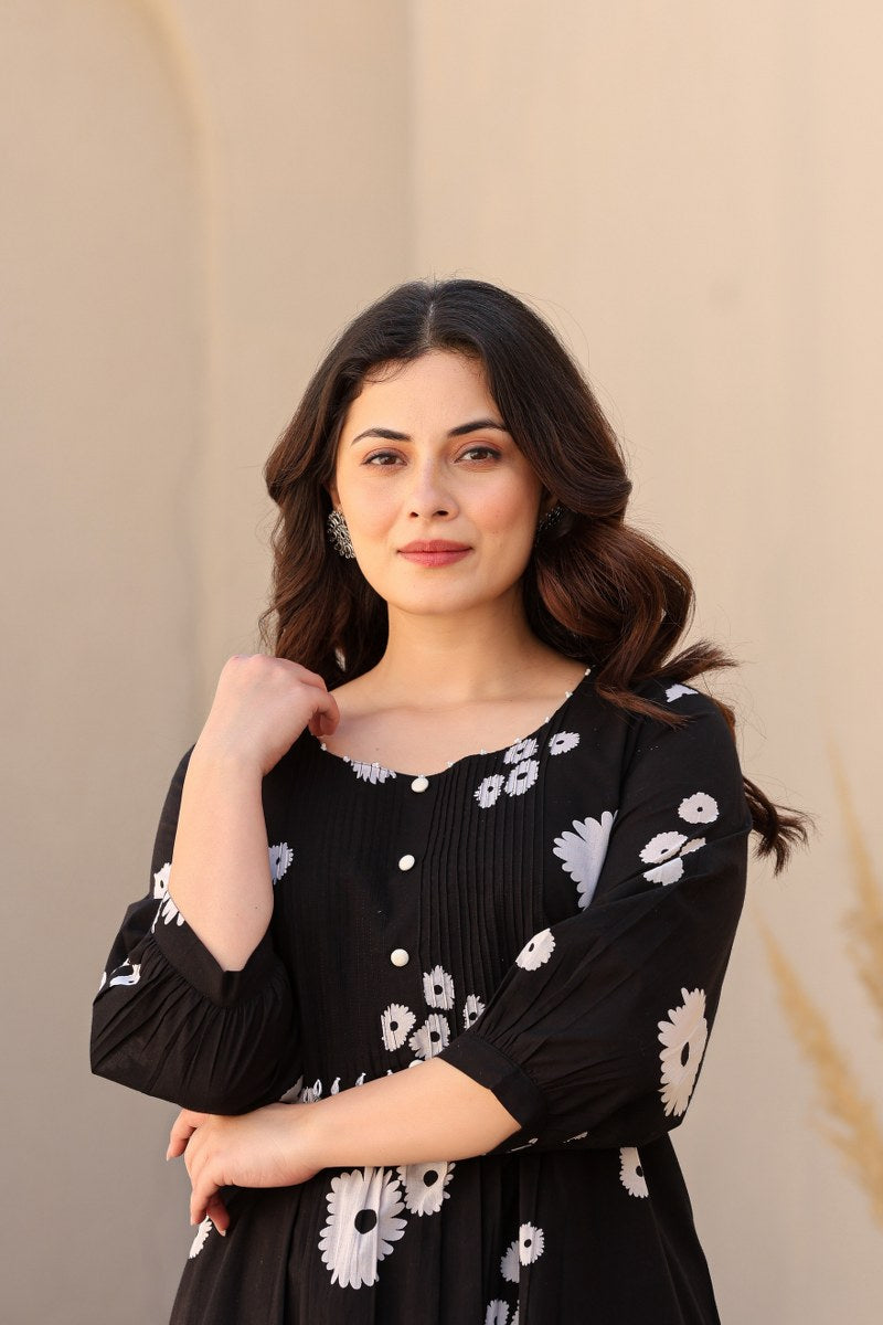 Elevate your everyday style with this elegant black floral printed cord set. Featuring a flowy, A-line kurta with delicate white floral prints and subtle front pleats, this set combines timeless charm with modern comfort. The 3/4th sleeves and round neckline add a touch of sophistication, while the straight-fit solid black trousers ensure a balanced, streamlined look. Perfect for casual outings, work-from-home attire, or relaxed gatherings, this set embodies effortless grace and all-day comfort.