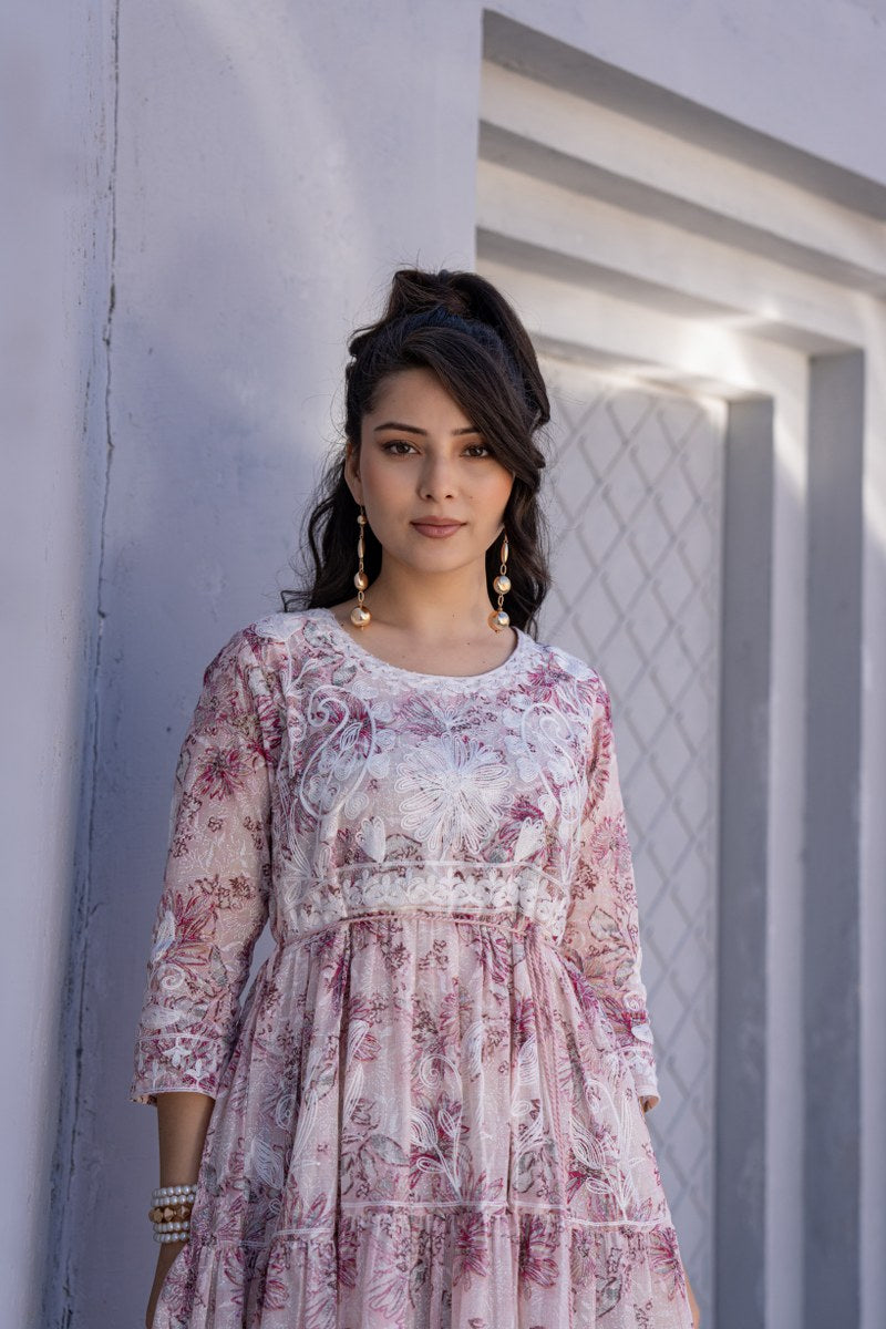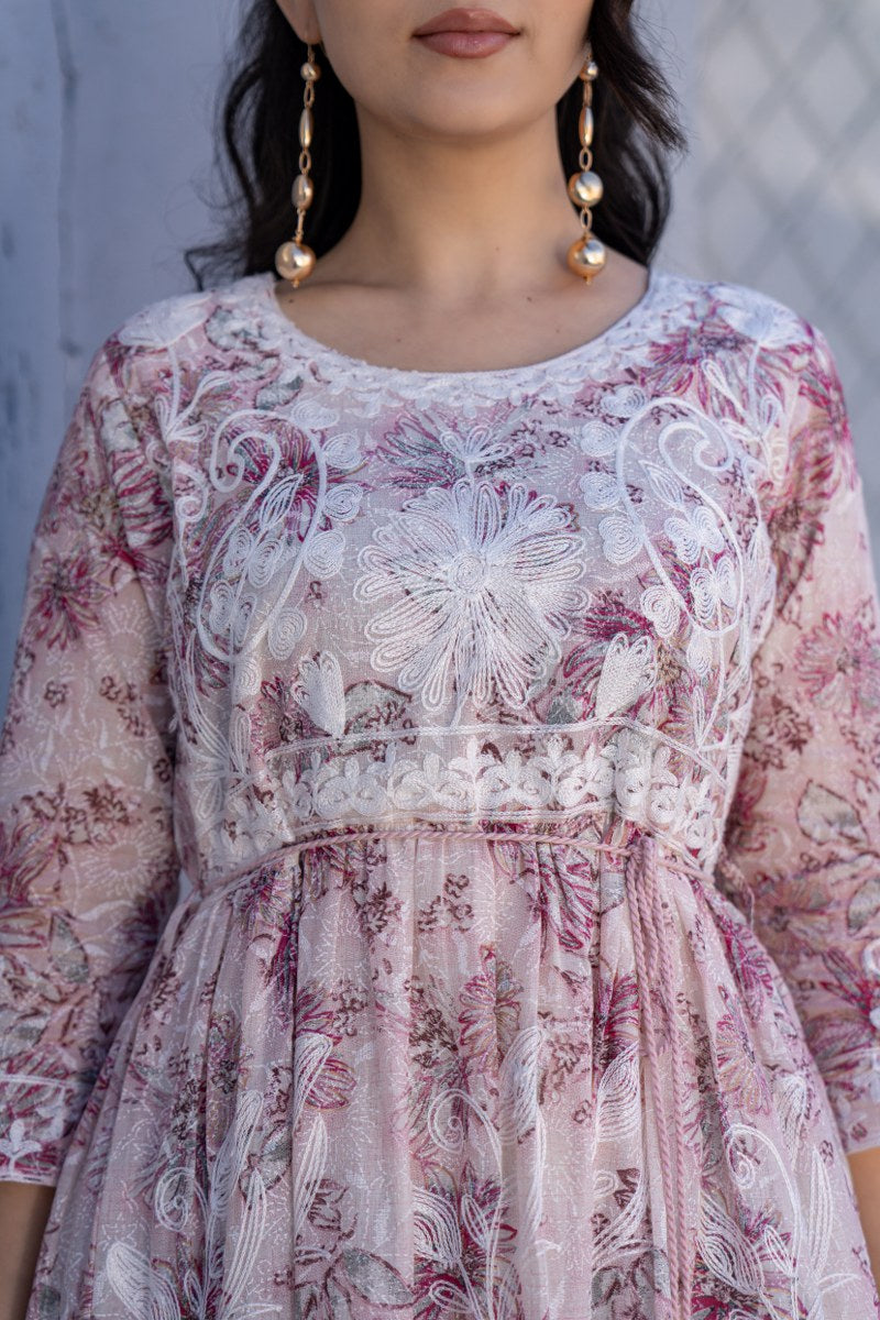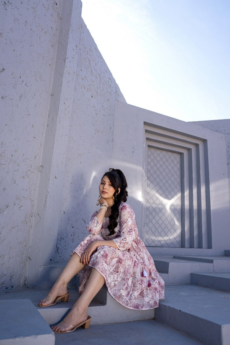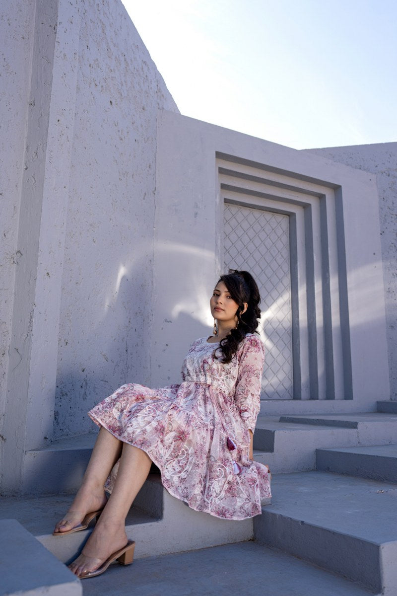 Add a romantic charm to your wardrobe with this beautiful blush pink A-line short dress, adorned with soft floral prints and delicate white thread embroidery. Designed with a flattering round neckline and 3/4th sleeves, this dress features a comfortable, adjustable drawstring waist with tassel ties for a personalized fit. The flowy silhouette and soft pastel hues make it ideal for casual outings, brunch dates, or holiday wear. Crafted in a breathable fabric, this dress offers both elegance and ease.