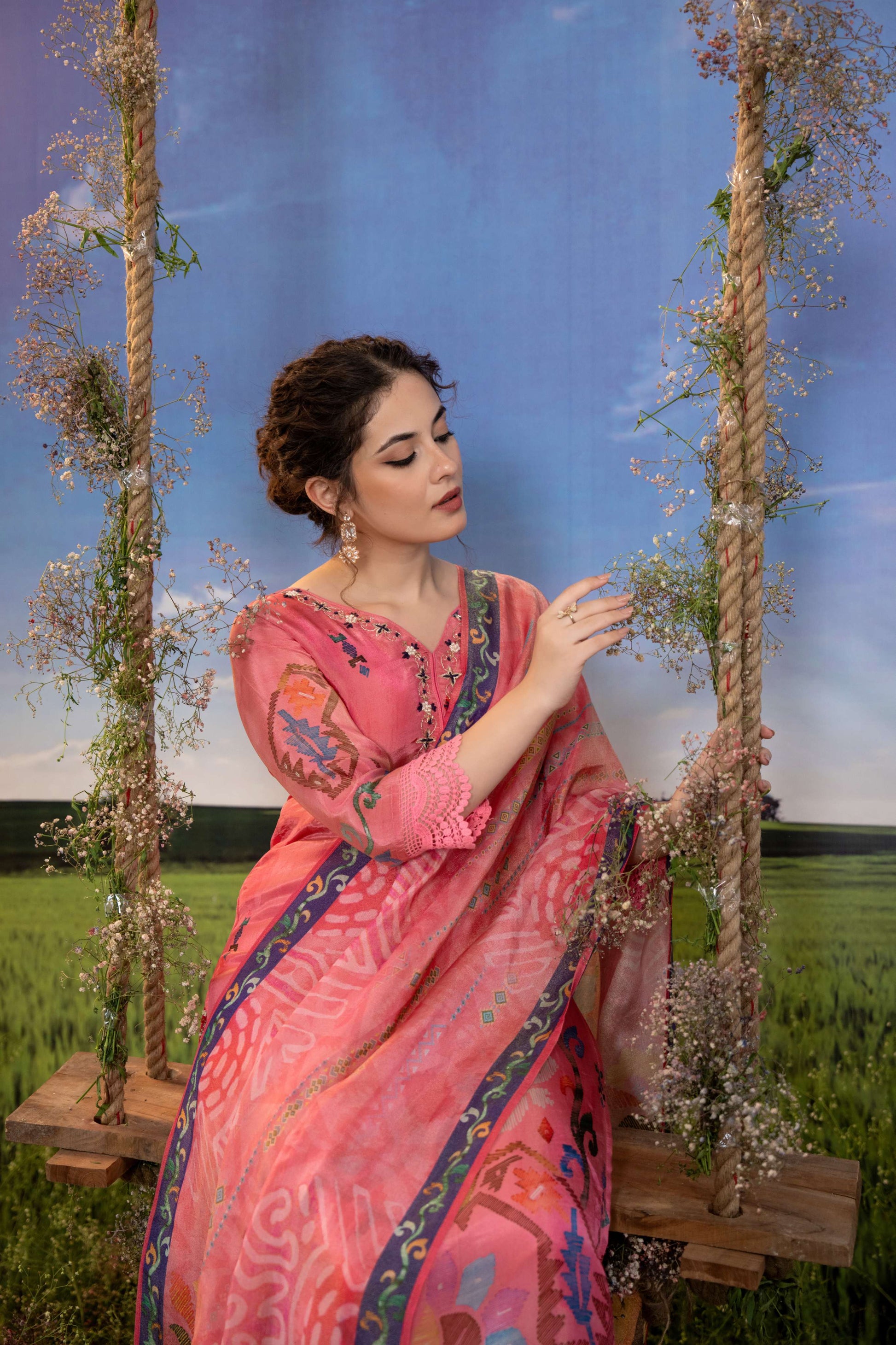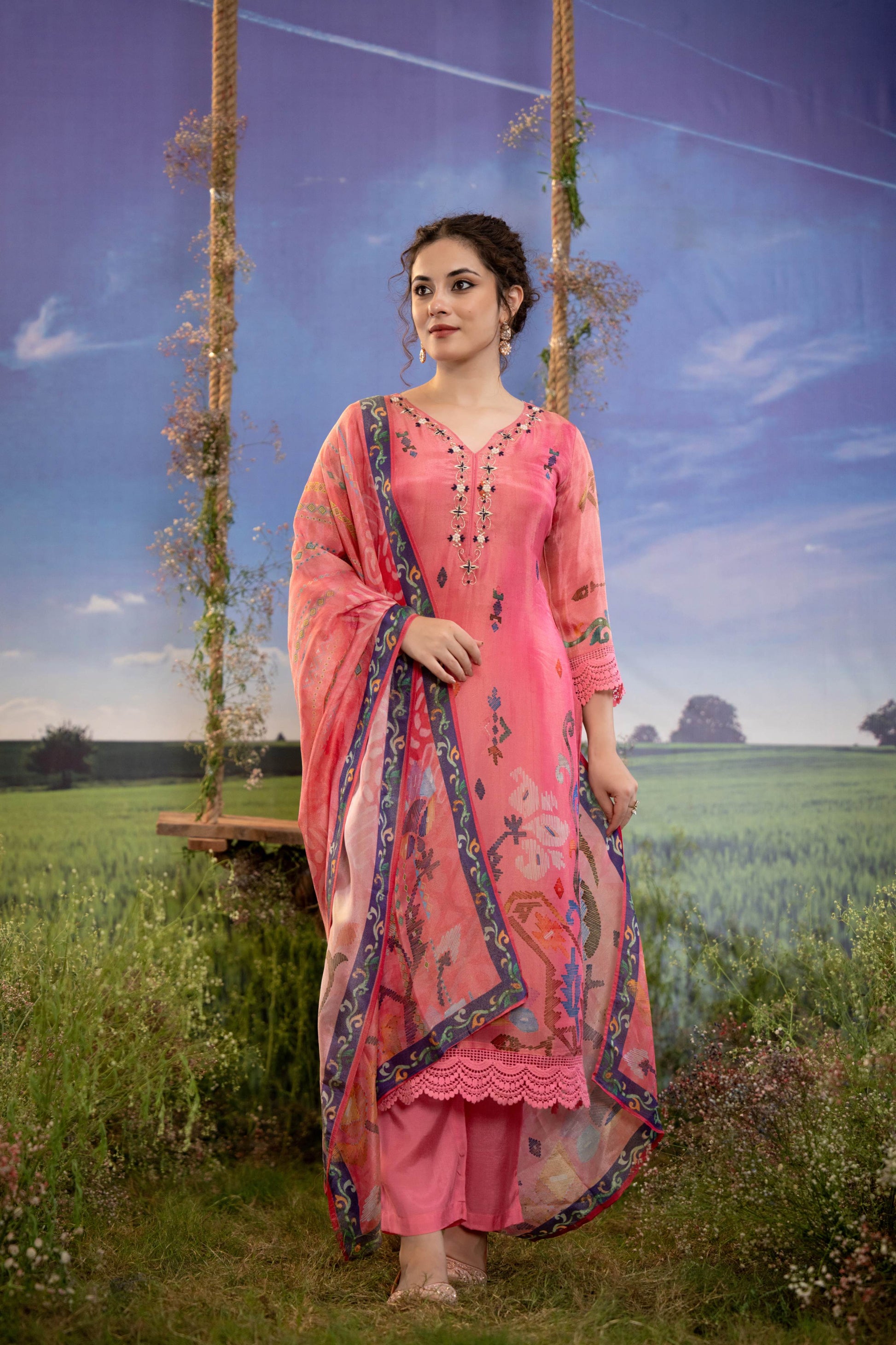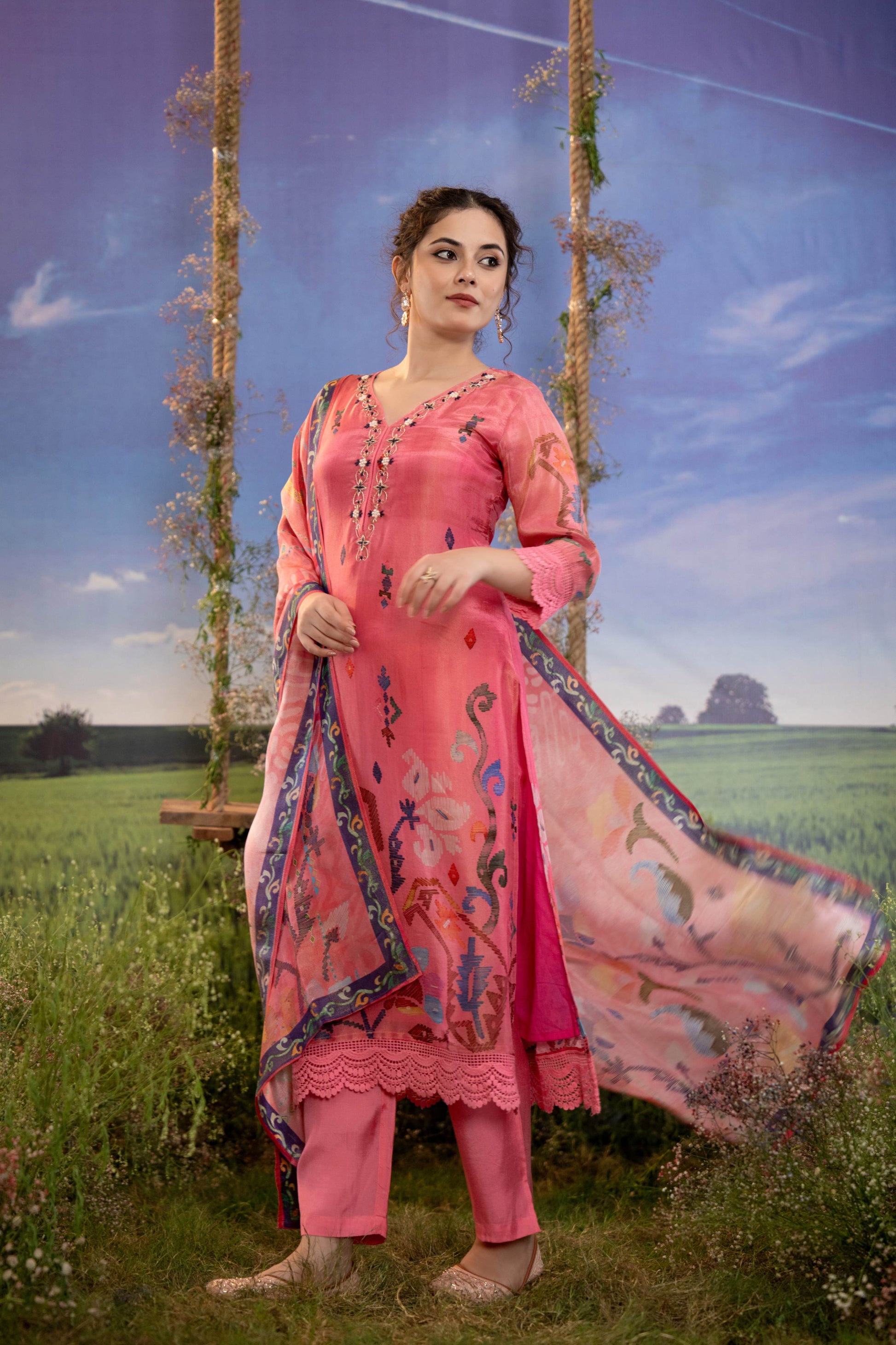 Step into elegance with our Blush Rose Muslin Kurta Set, a perfect blend of femininity and ethnic flair. Crafted in breathable muslin fabric, this 3-piece set features a charming blush pink straight-fit kurta enhanced with mirror work detailing on the neckline and crochet lace at the hemline and cuffs. The look is completed with a beautifully printed dupatta in rich multicolor ethnic motifs and solid blush-toned trousers, making it an ideal outfit for day celebrations and cultural events