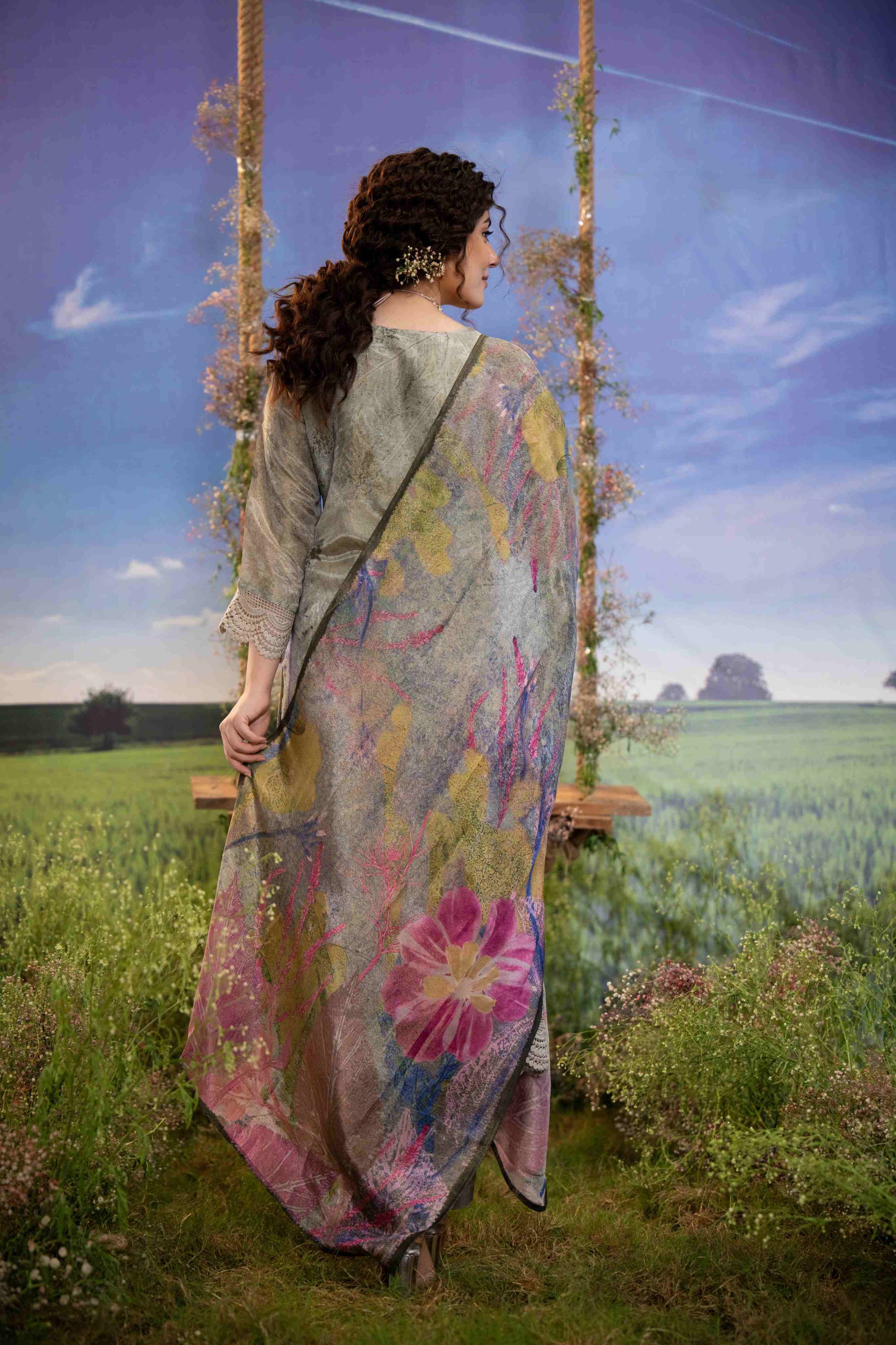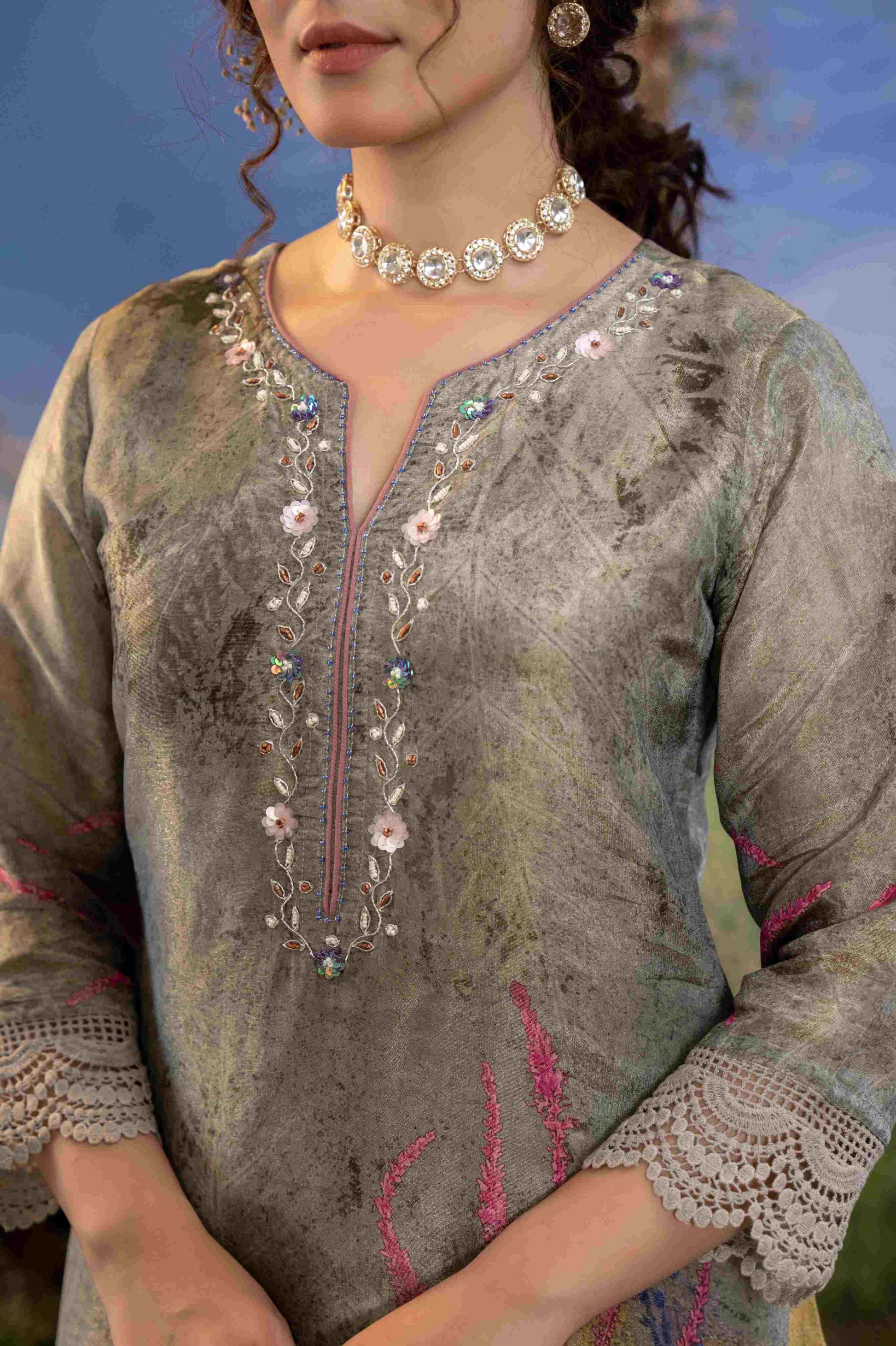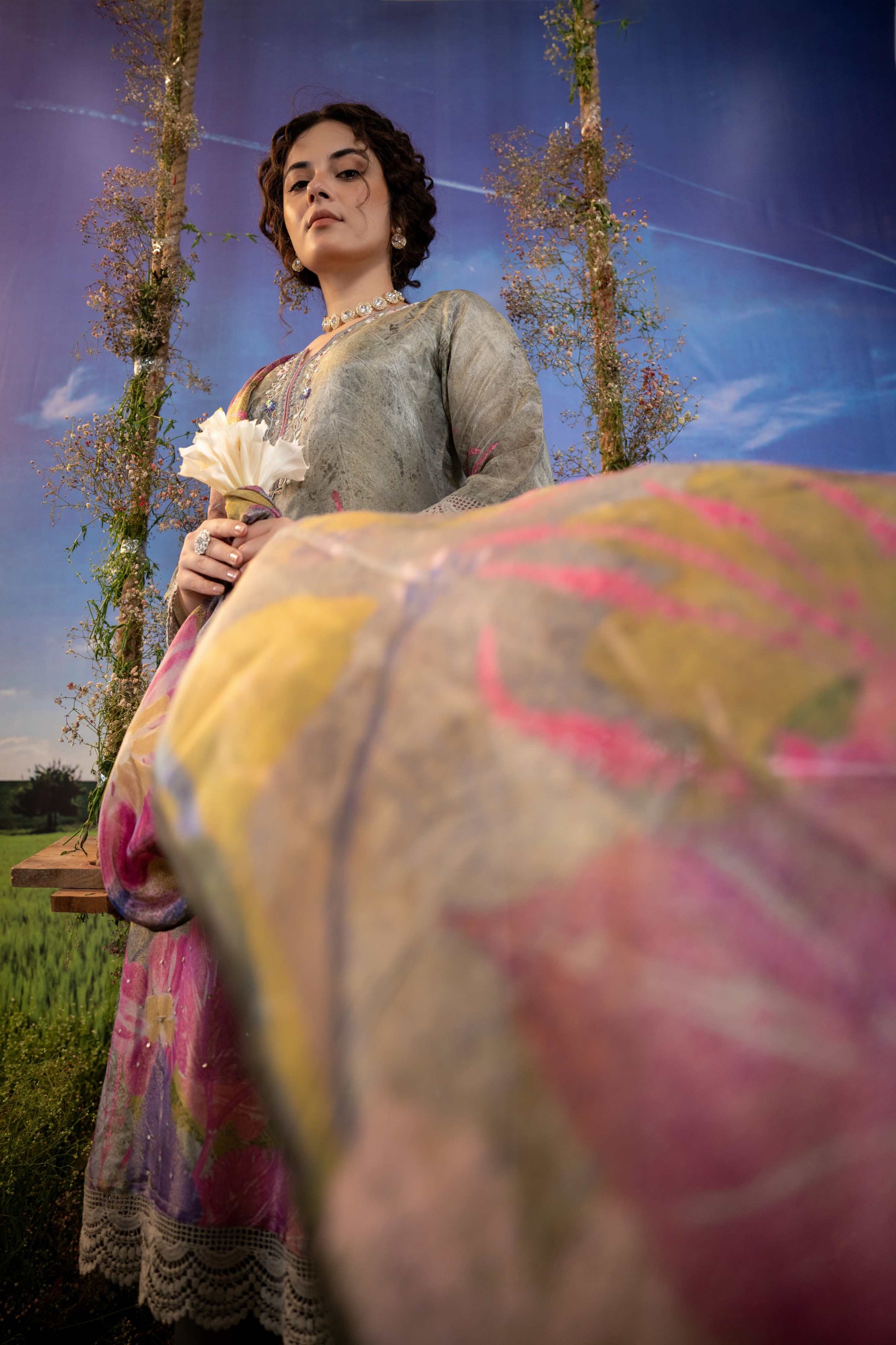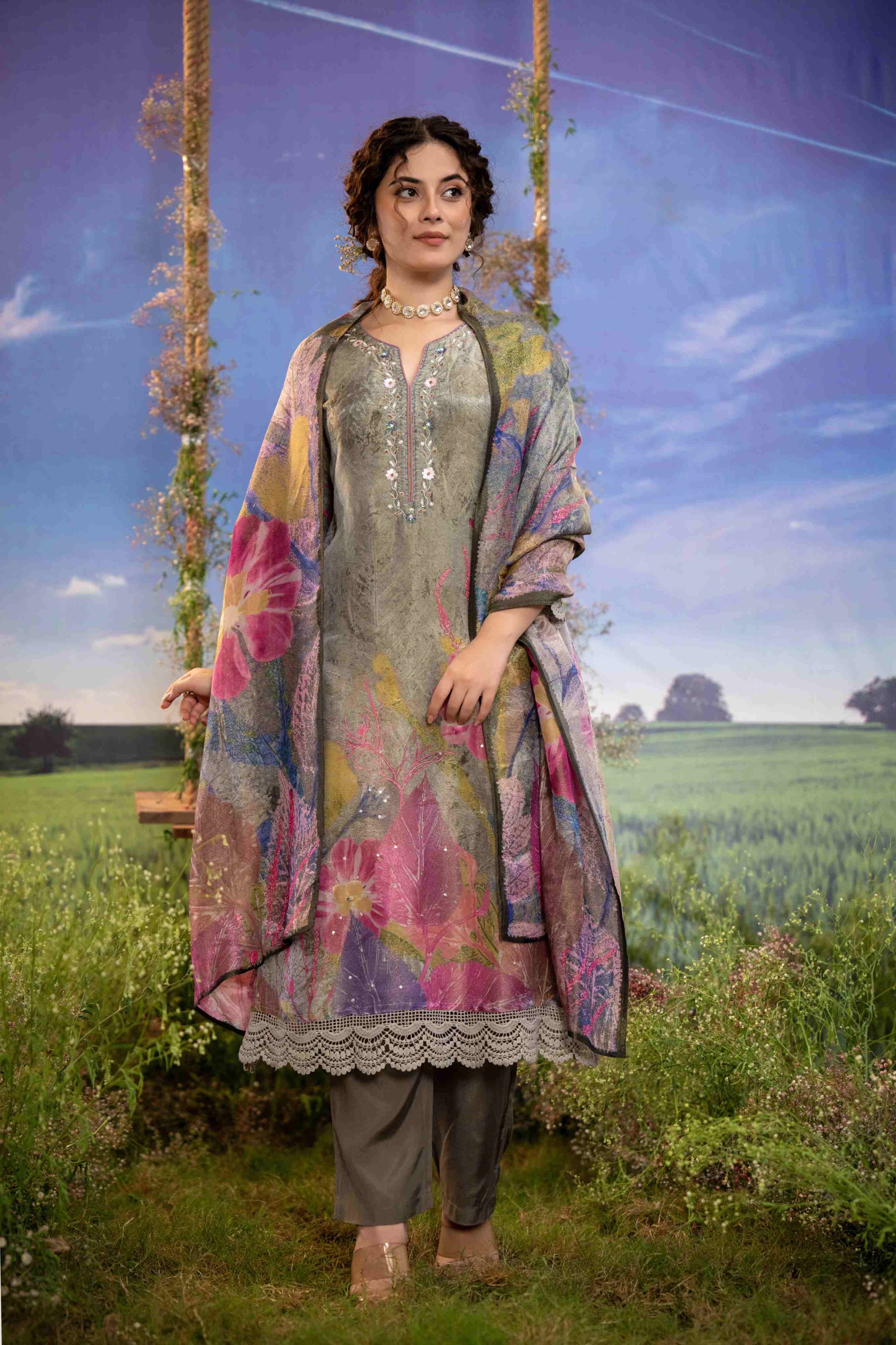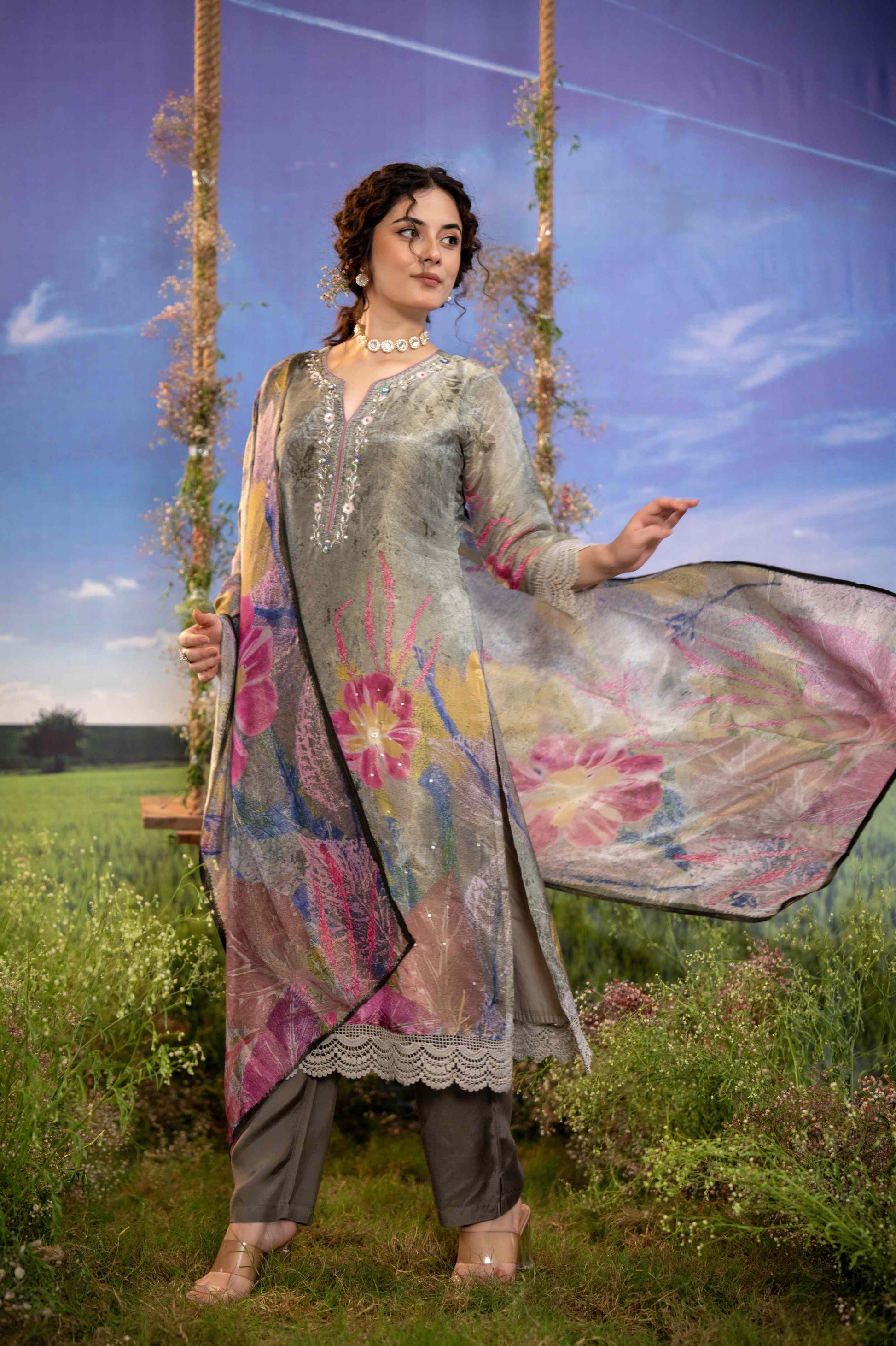 Effortlessly graceful, this Botanic Mist Muslin Suit Set captures the essence of soft femininity with an earthy, artistic touch. The sage-toned muslin kurta is delicately adorned with mirror and thread embroidery along the neckline, paired with a beautifully printed floral dupatta showcasing vibrant botanical artwork. The scalloped lace hem and sleeves add refinement, while the charcoal trousers complete the look with poise. A timeless pick for brunches, garden parties, or semi-formal gatherings.