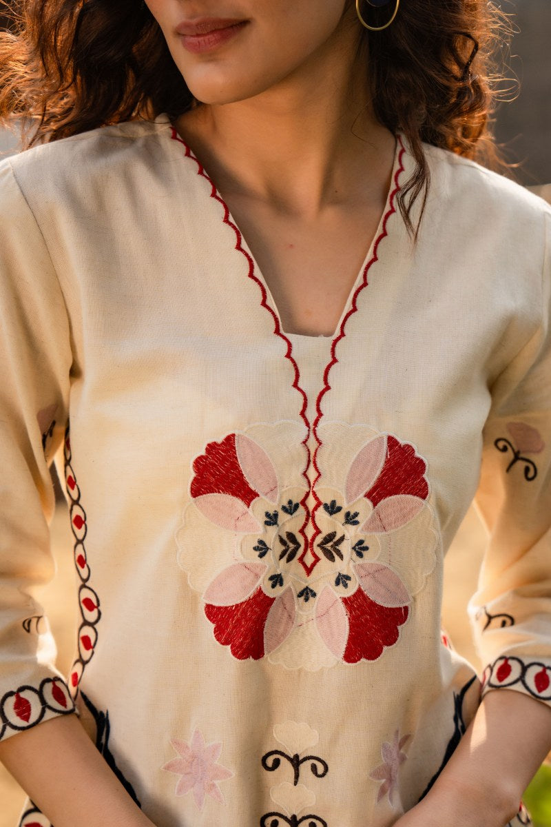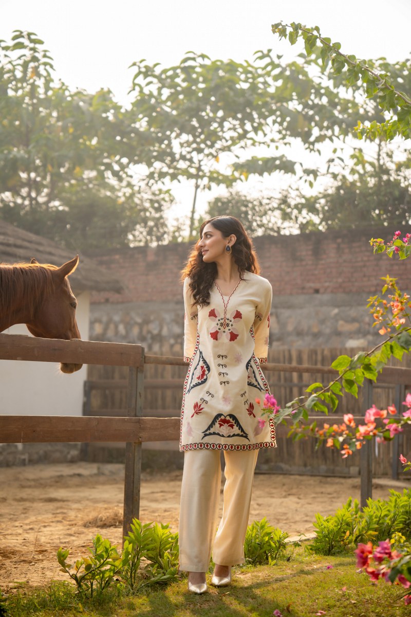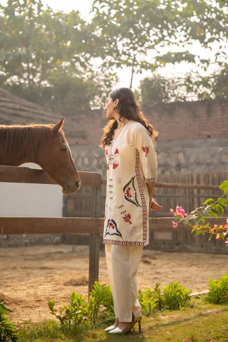 Elevate your everyday style with this beautifully crafted cream cord set, featuring intricate multicolor embroidery. The set includes a straight-cut shirt and straight trousers, exuding a timeless yet contemporary charm. The shirt boasts delicate floral and geometric motifs in red, navy blue, and soft beige, accentuated with fine embroidery around the neckline, sleeves, and hemline. The outfit blends tradition with modern simplicity, perfect for casual gatherings, semi-formal events, or a serene countryside outing.