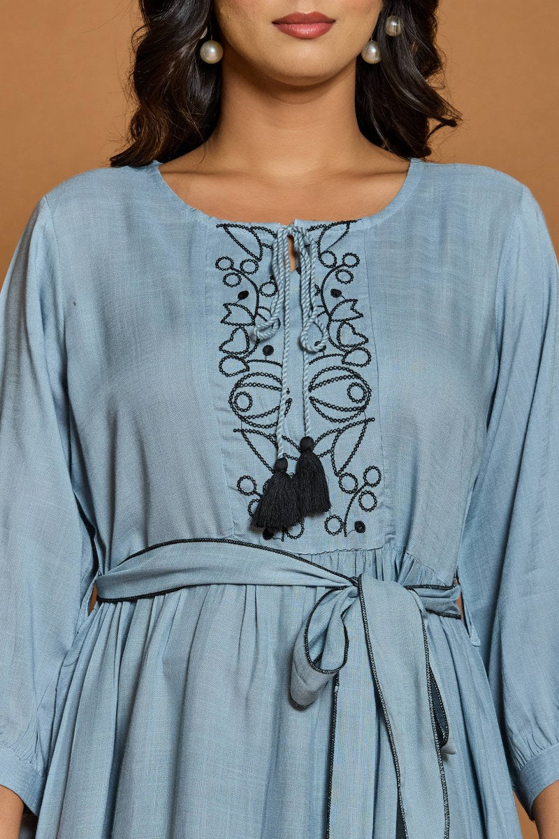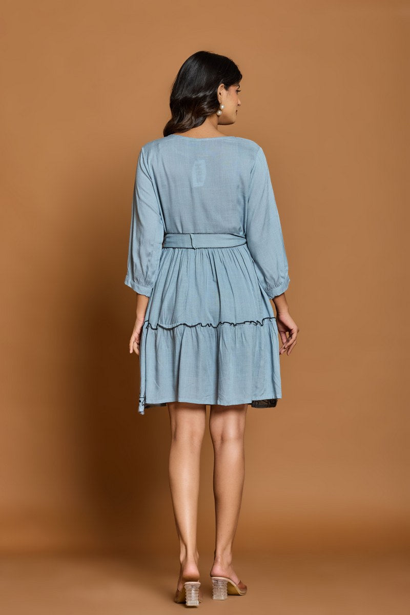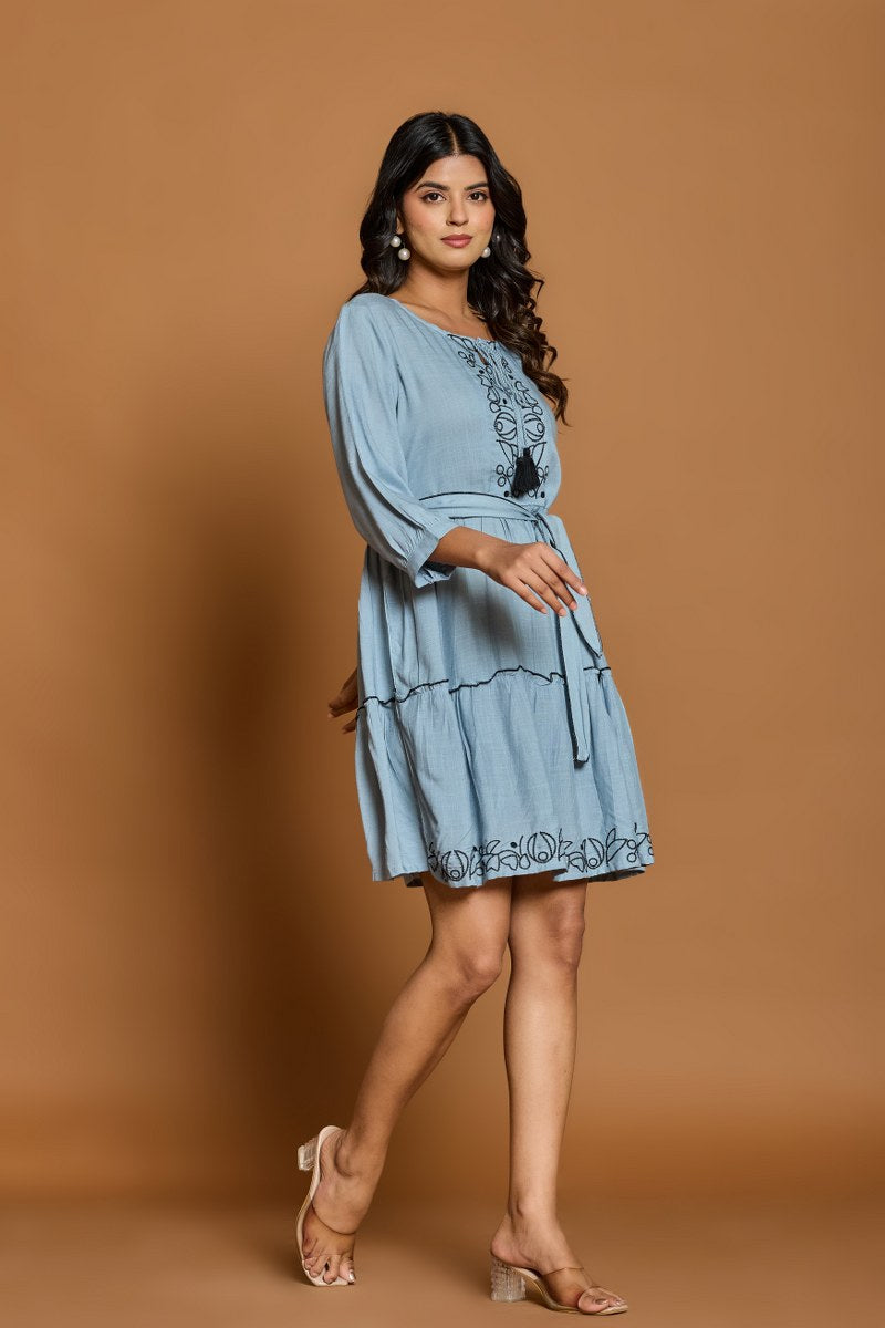 Dusty Blue Embroidered A-Line Short Dress with Waist Belt