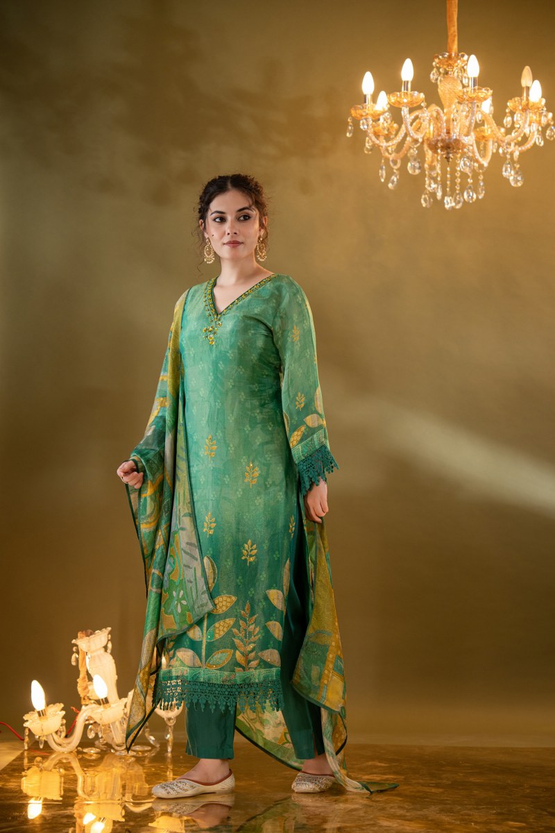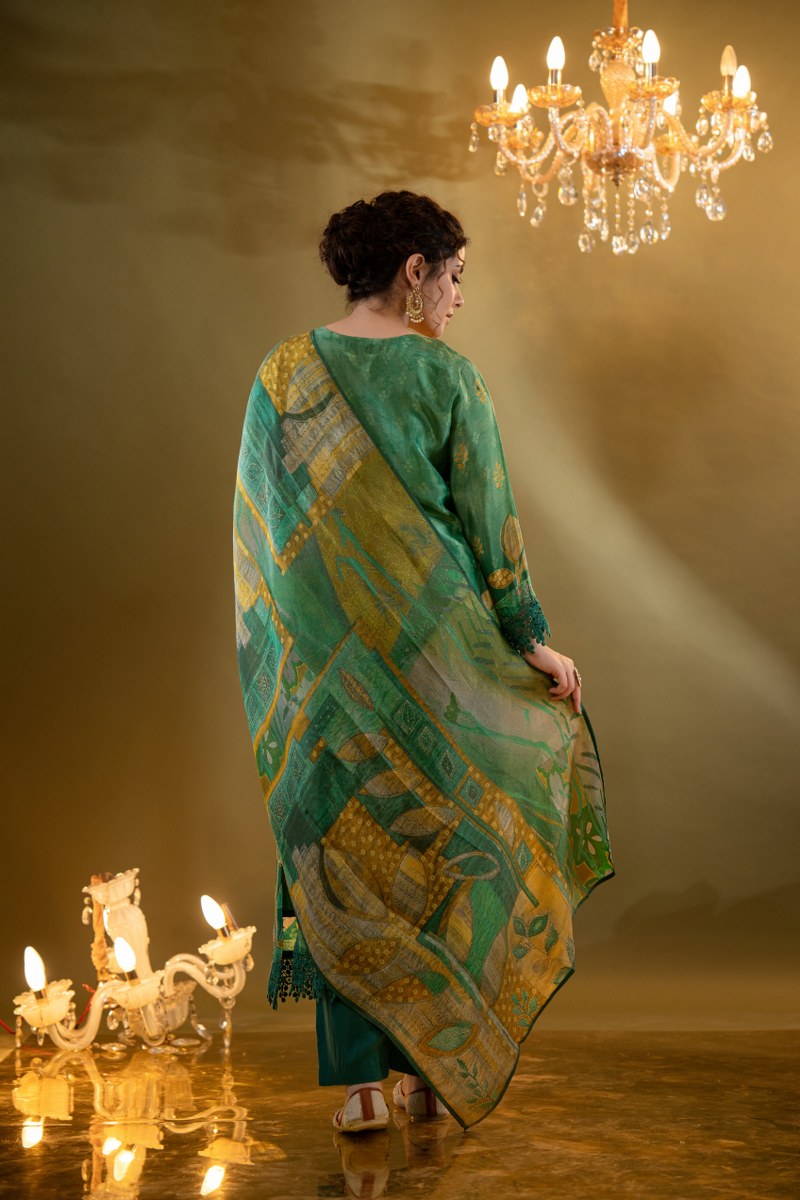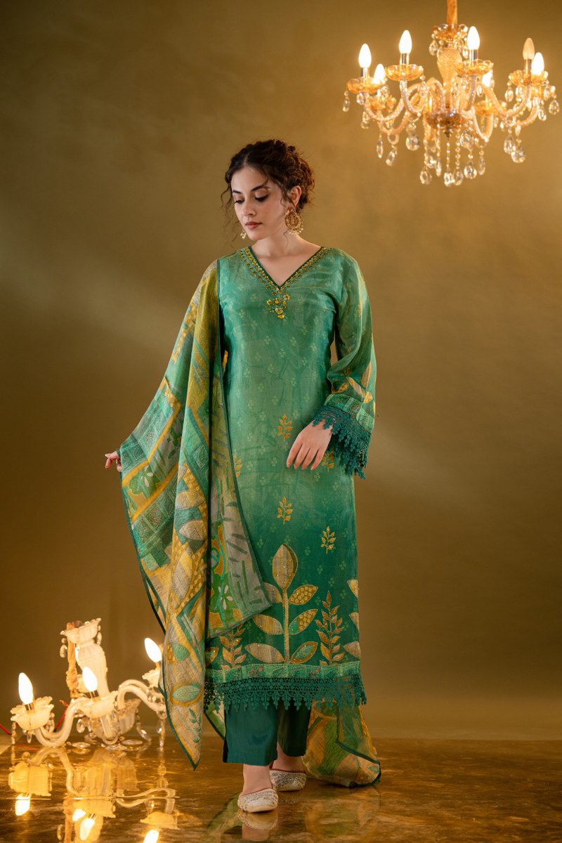 Paired with tonal straight-fit pants and a digitally printed dupatta in coordinating shades of green, yellow, and beige, this ensemble brings timeless grace to festive celebrations, mehendi functions, or day-time weddings.