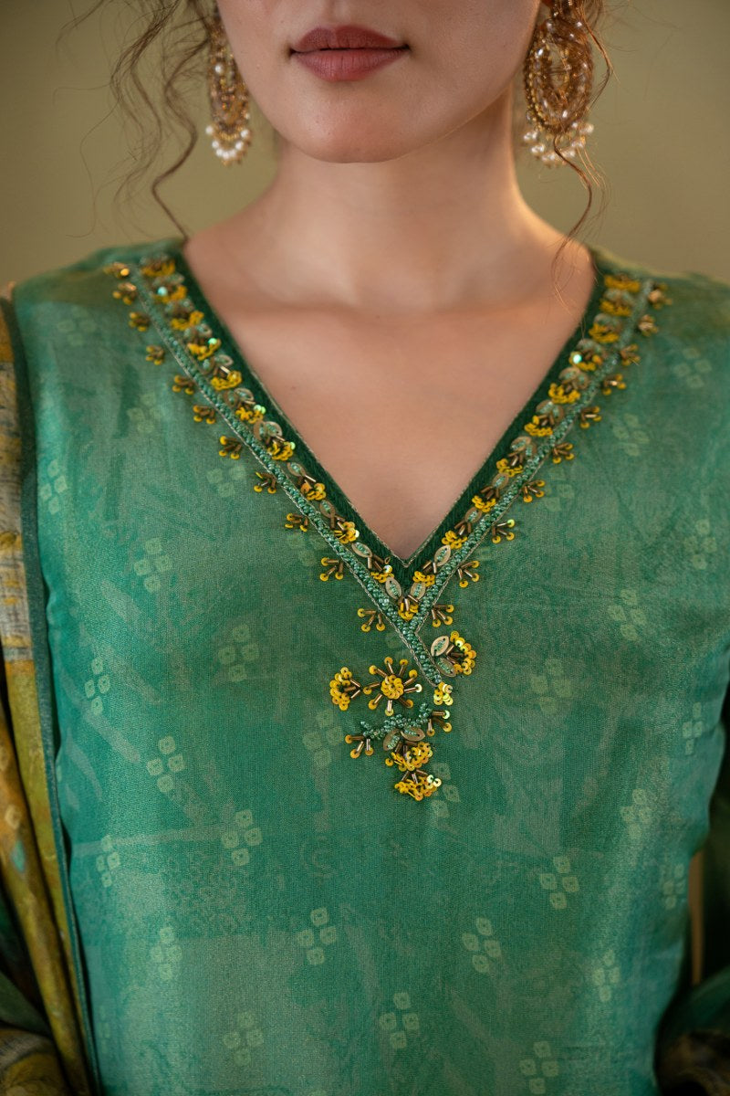 Emerald Green Muslin Printed 3-Piece Kurta Set with Embellished Dupatta