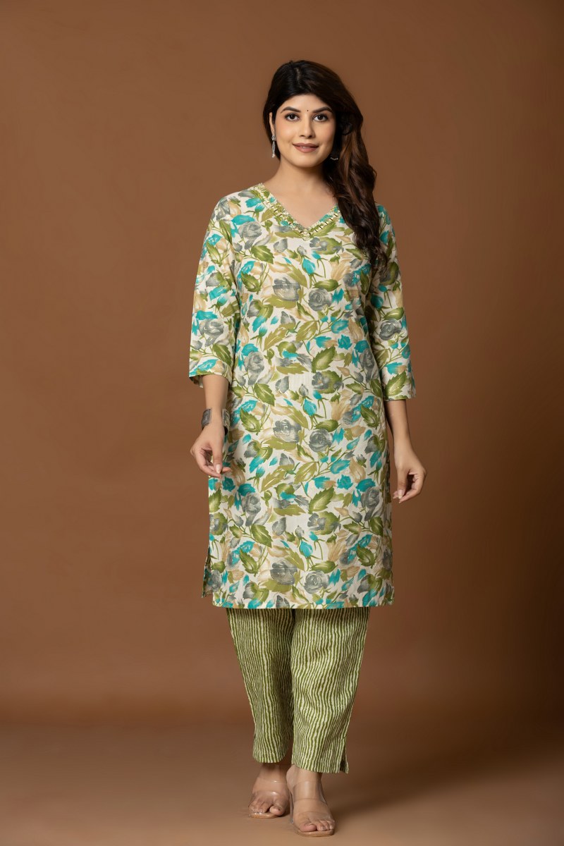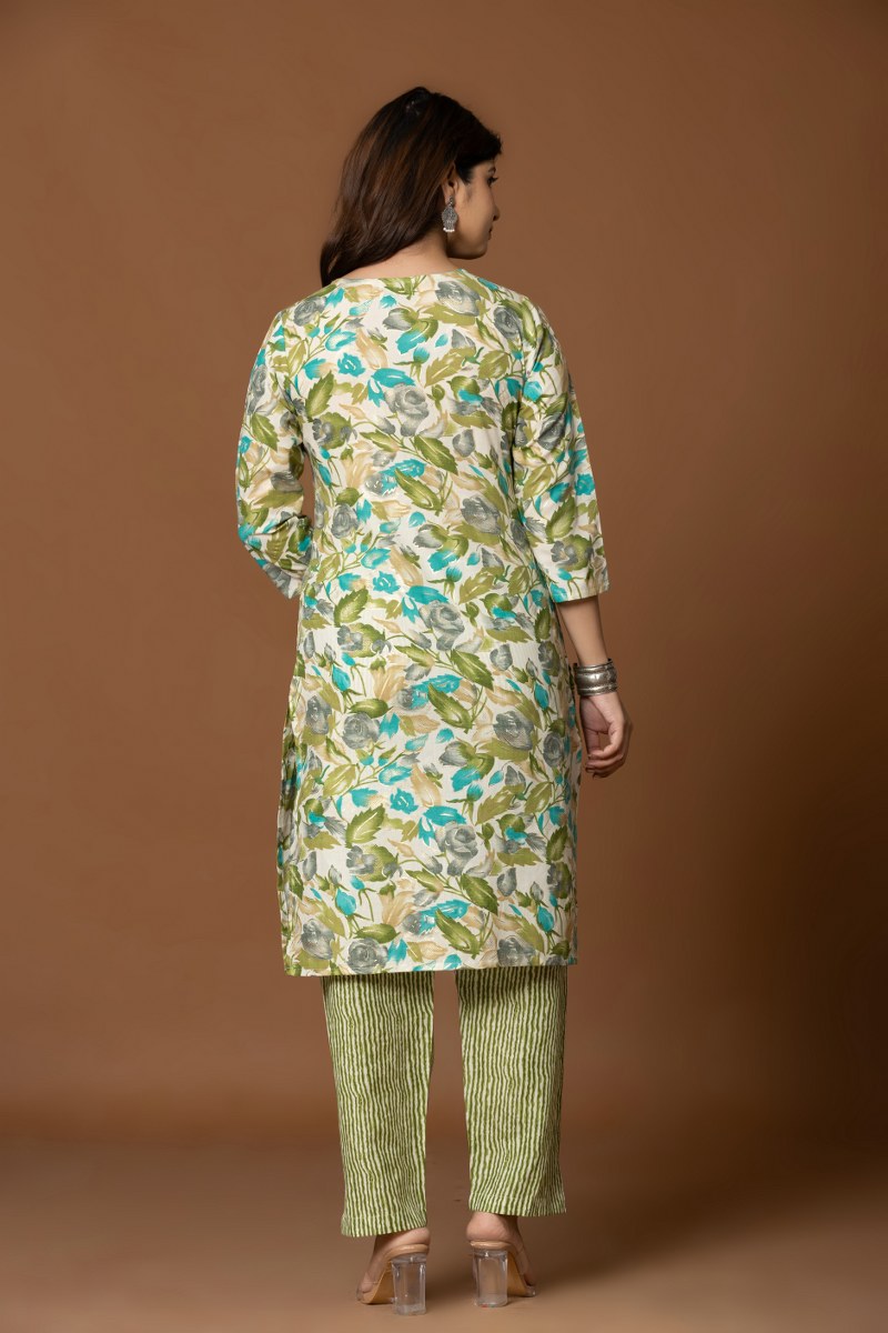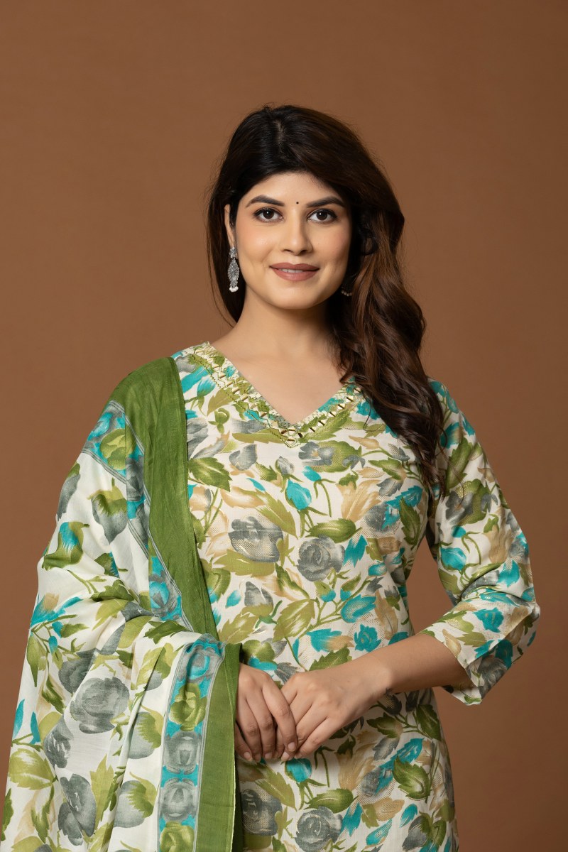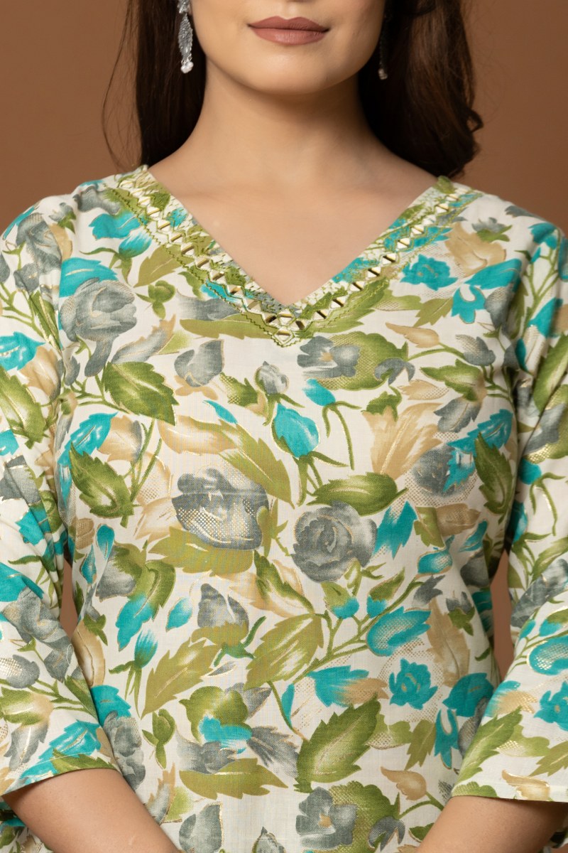 Floral Printed Cotton Kurta Set with Dupatta – Green & Blue Tones