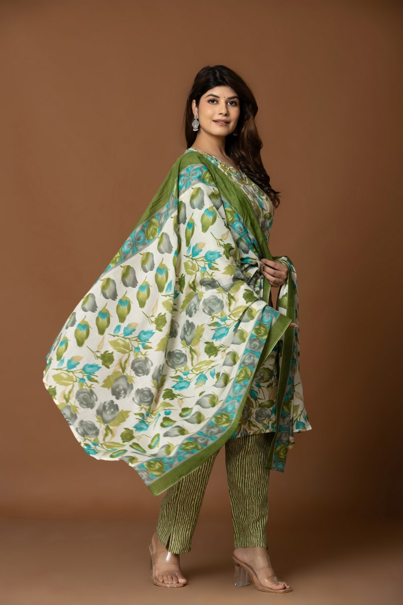 Refresh your wardrobe with this elegant three-piece cotton kurta set, perfect for casual and semi-formal occasions. The straight-fit kurta features a soothing floral print in shades of green, grey, and blue on a beige base. It is paired with a striped green cotton pant that adds a subtle contrast. The look is completed with a beautifully coordinated dupatta featuring matching floral prints and a solid green panel for added charm. Comfortable yet stylish, this ensemble is ideal for everyday wear or festive gatherings.