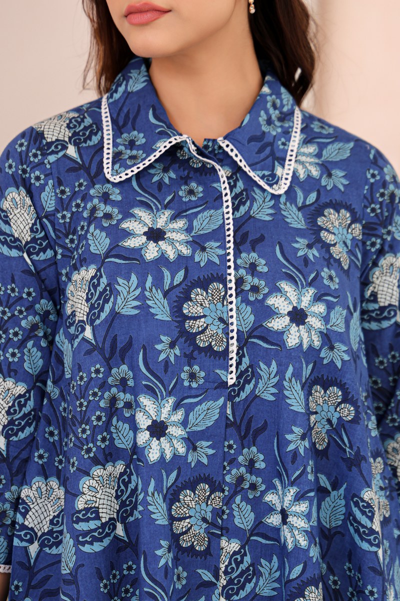 Infuse timeless elegance into your wardrobe with this stunning indigo blue printed cord set. The kurta features a captivating floral motif throughout, tailored in an A-line silhouette for ease and flow. A standout feature is its smart shirt collar with delicate piping and front button detailing, lending a subtle Indo-Western vibe.