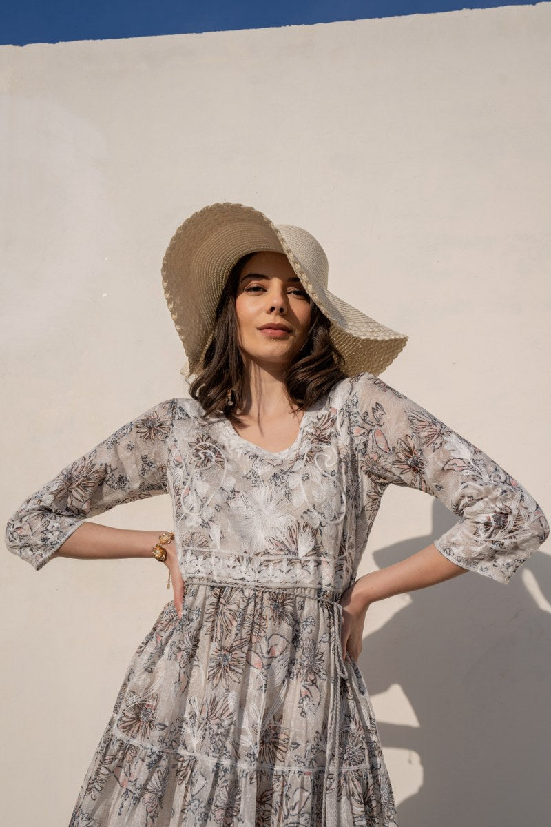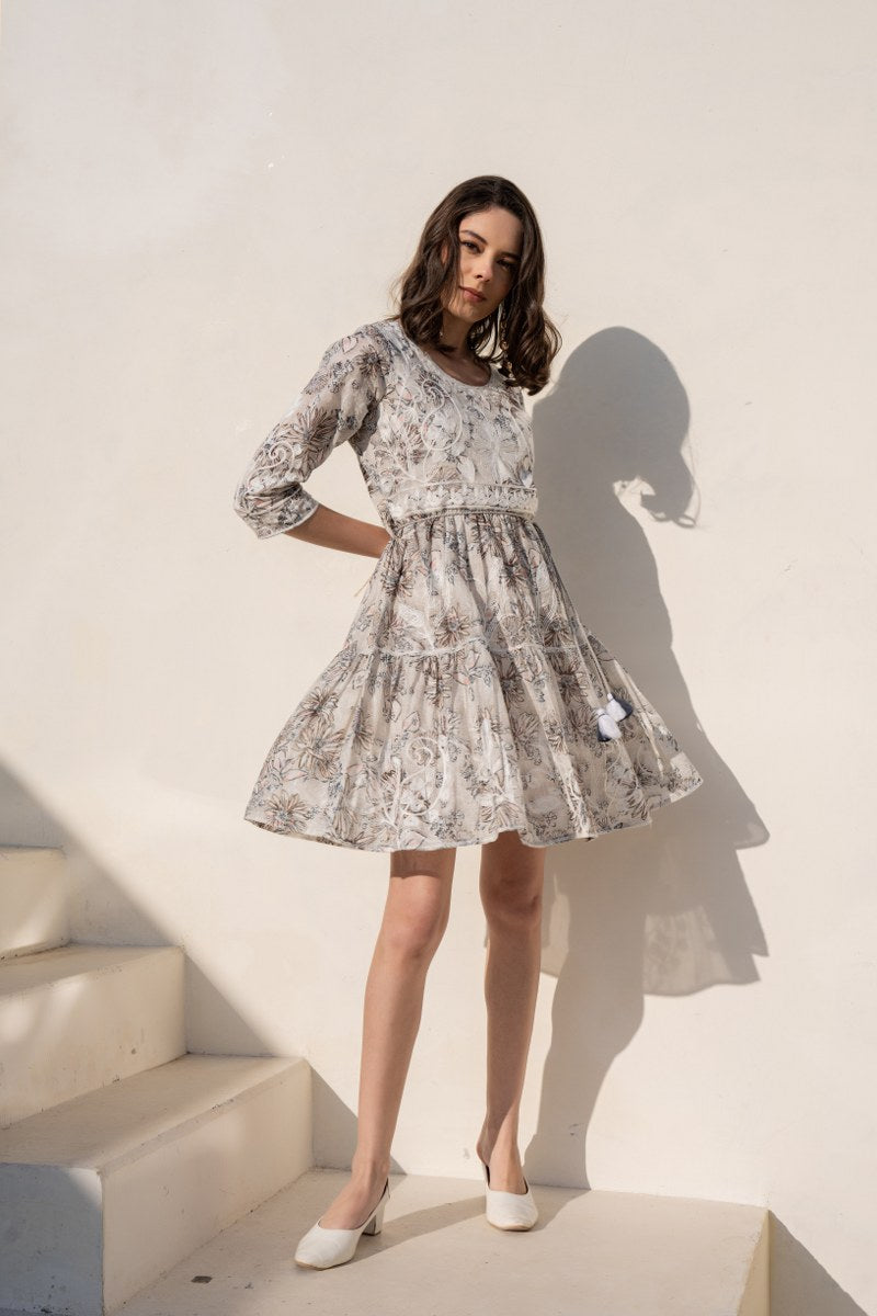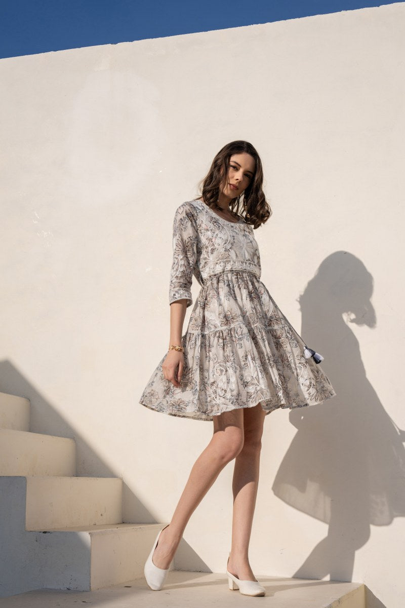Elevate your everyday look with this sophisticated ivory beige A-line short dress, featuring intricate floral prints highlighted with delicate white embroidery. Designed with a soft round neckline and 3/4th sleeves, this dress comes with an adjustable drawstring waist finished with tassel ties for a flattering fit. The lightweight fabric and flowy silhouette make it perfect for casual day outings, brunch dates, or resort wear. Its subtle, earthy tones paired with graceful embroidery lend a timeless elegance.