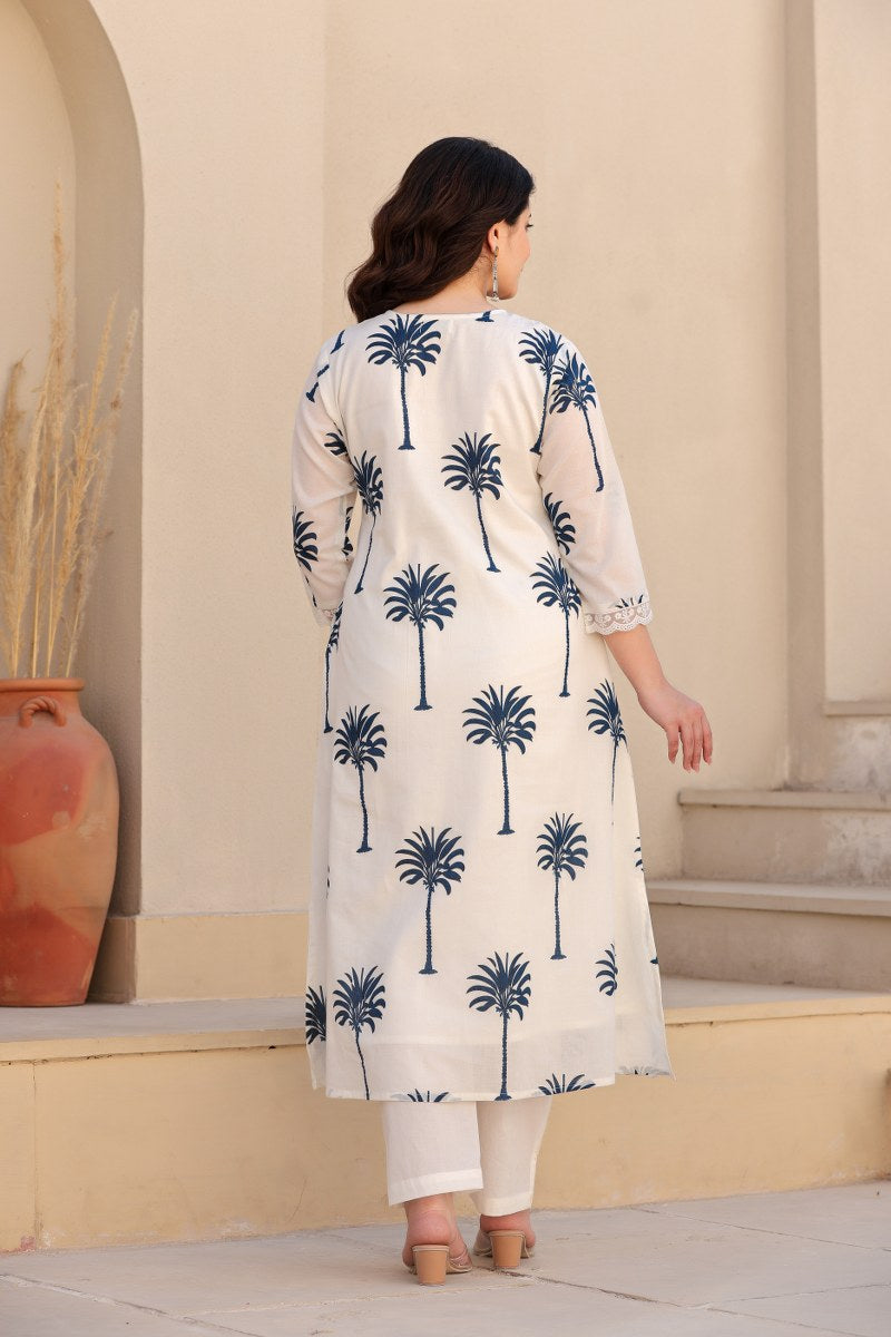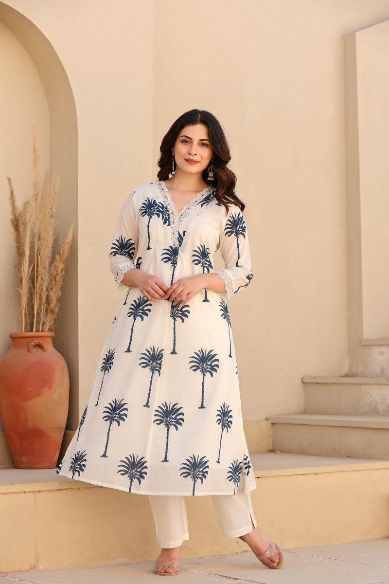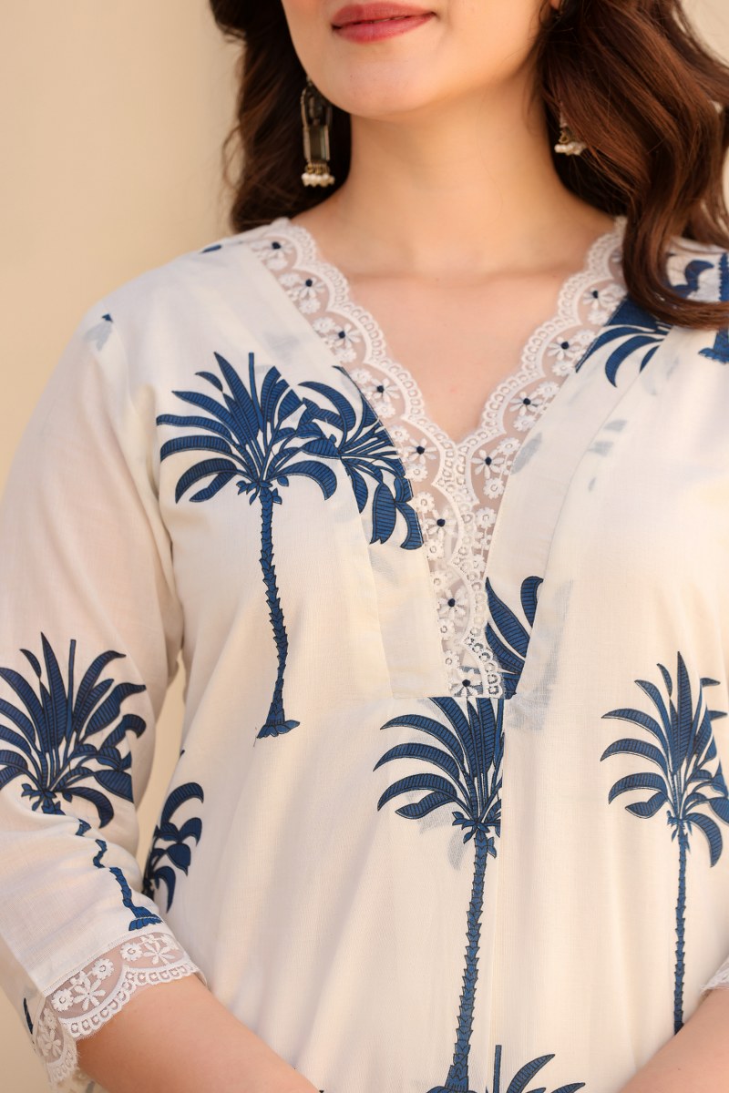 Breathe life into your everyday wardrobe with this chic ivory cord set, beautifully adorned with navy blue palm tree motifs for a modern, tropical flair. The A-line kurta features delicate lace trims on the neckline and sleeves, blending softness with sophistication. Paired with solid ivory straight trousers, this set offers effortless elegance and is perfect for summer lunches, casual gatherings, or relaxed evenings.