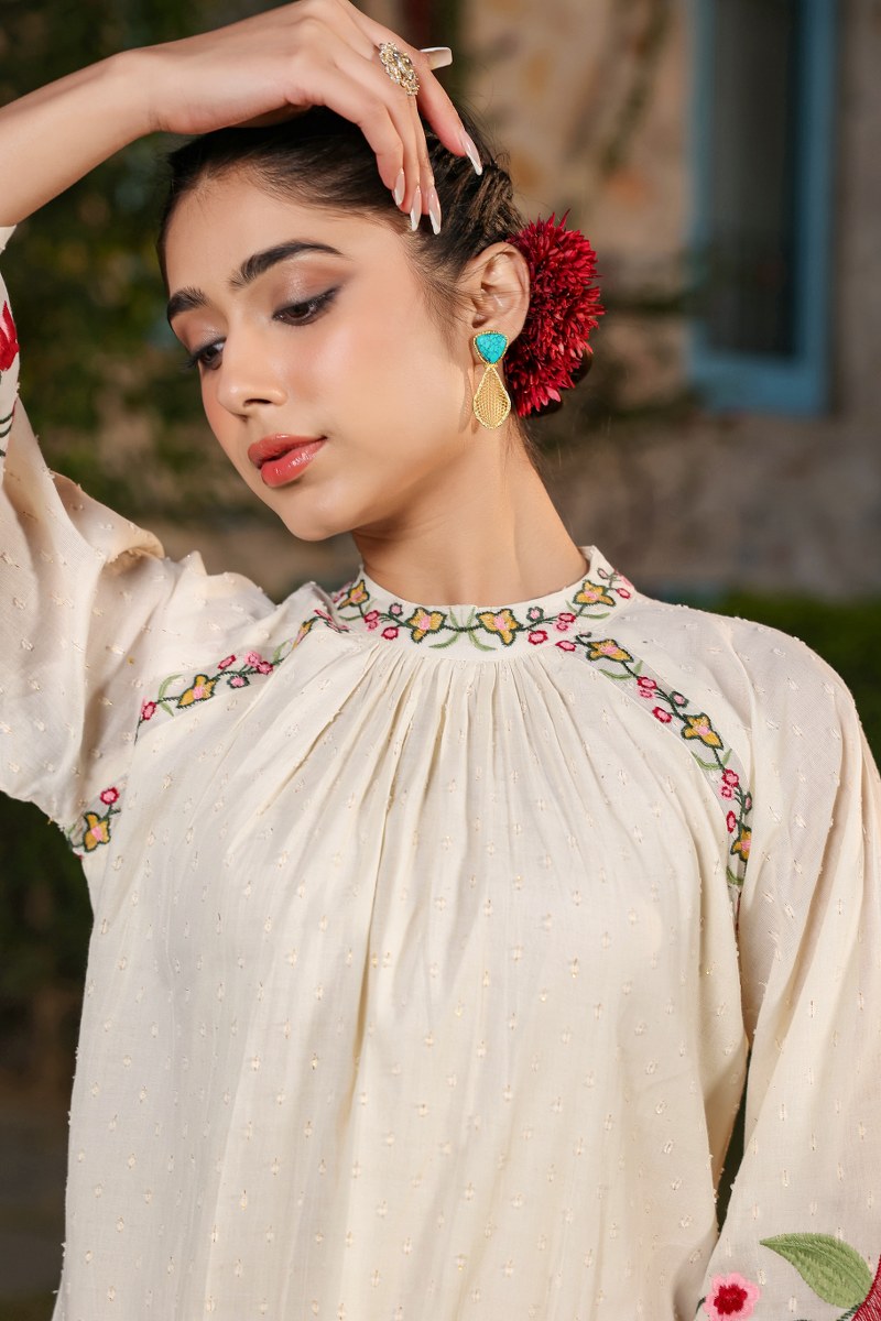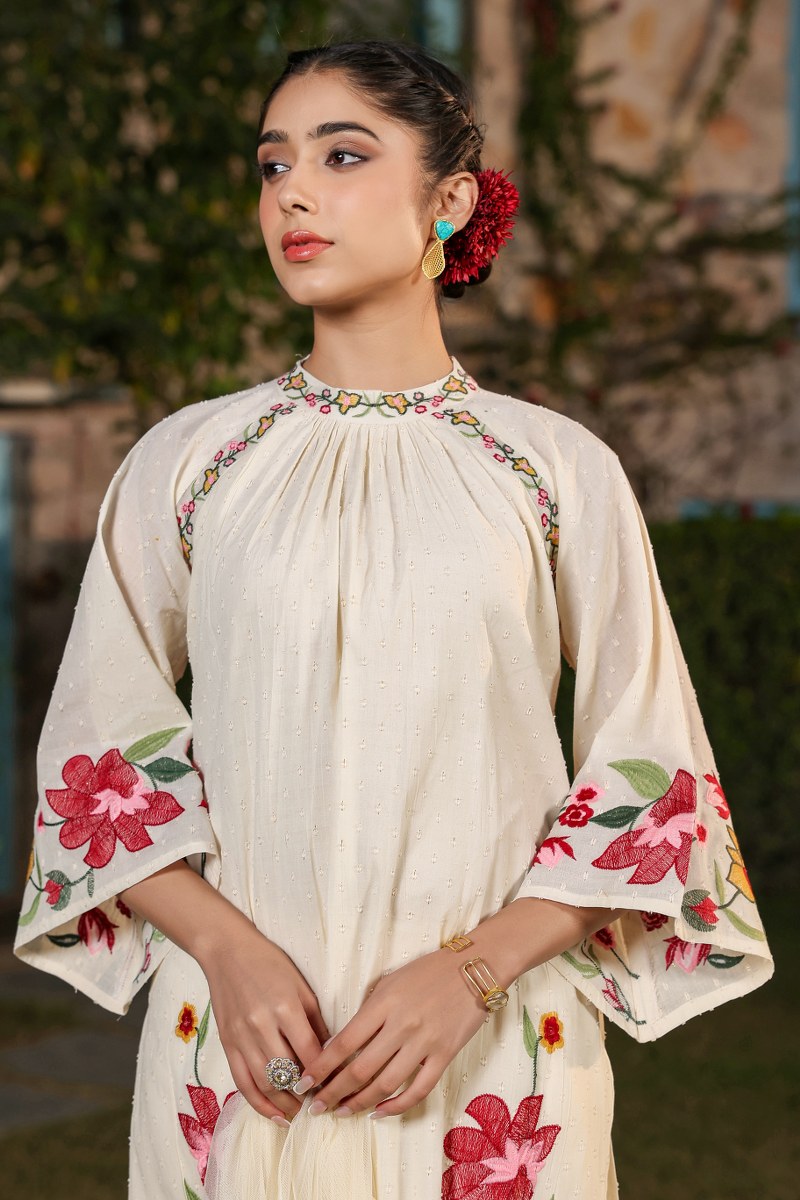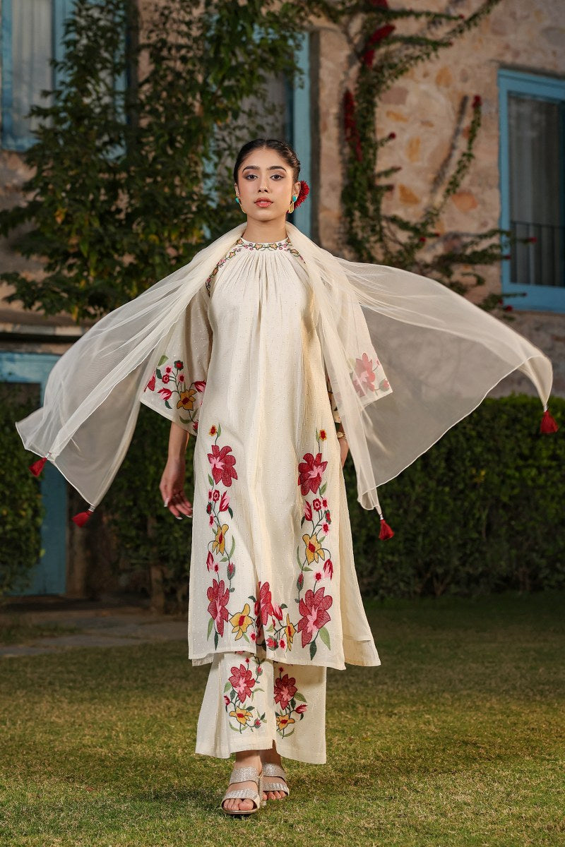 Graceful and effortlessly elegant, this ivory 3-piece muslin kurta set showcases delicate floral embroidery in bold hues of red, yellow, and green. The kurta features a gathered neckline with a beautifully embroidered collar and flared silhouette, making it breezy and flattering. Wide-leg pants with matching floral embroidery add harmony and flow to the look.