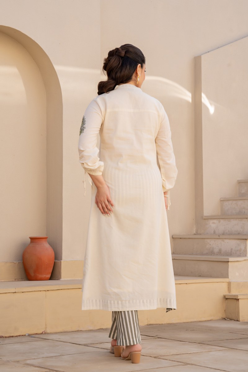 Refresh your wardrobe with this serene ivory floral printed cord set, designed for everyday elegance. The straight-cut kurta features soft green floral and butterfly prints, enhanced with subtle striping on the inner placket for a contemporary contrast. Thoughtful sleeve detailing with tie-up accents adds a modern twist to this classic silhouette. Paired with olive green and ivory striped straight pants, this set strikes a perfect balance between sophistication and relaxed charm — ideal for casual outings, workwear, or light festive occasions.