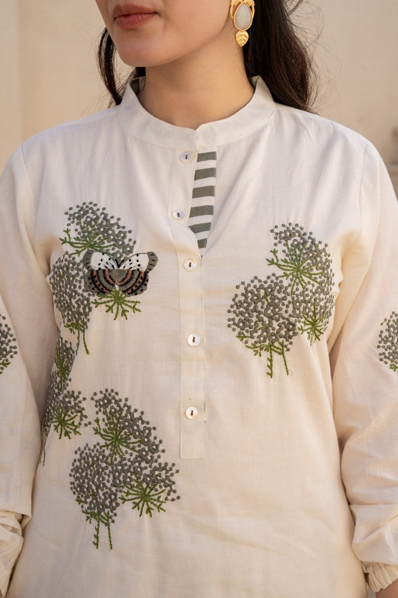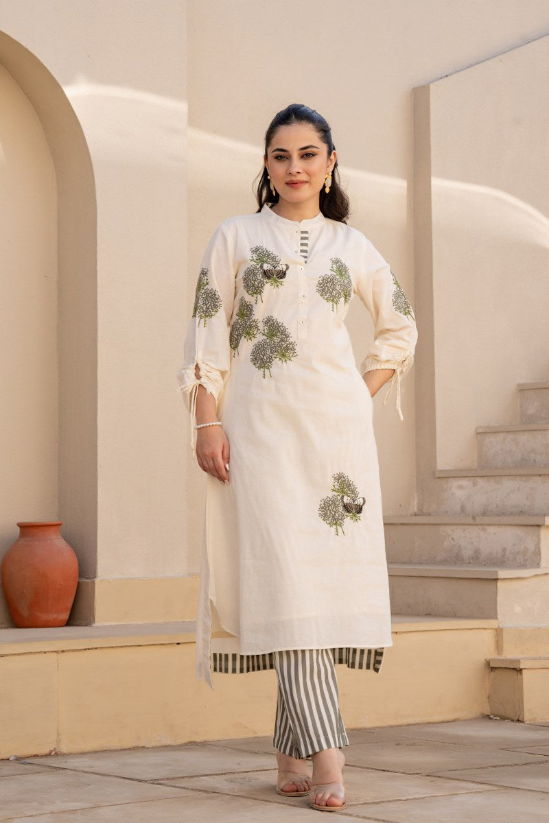 Color: Ivory Kurta with Green Floral & Butterfly Print