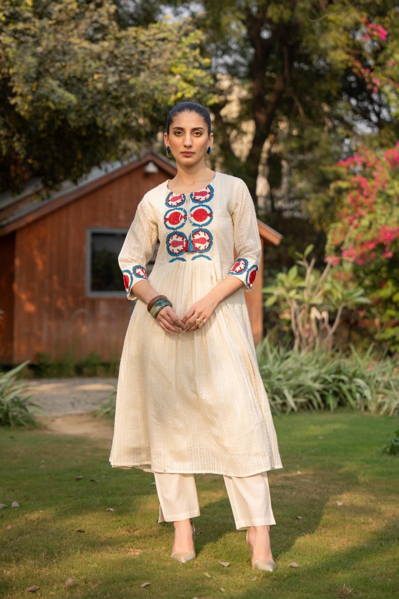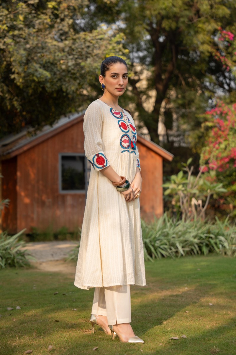 Exude timeless elegance in this ivory cotton cord set, featuring a beautifully detailed handblock printed yoke. The A-line kurta is crafted from soft cotton with subtle woven textures, highlighted by a vibrant red and blue traditional handblock print on the yoke and sleeves. Complemented with straight ivory pants, this set merges traditional craftsmanship with modern comfort, making it perfect for daytime gatherings, cultural occasions, or understated festive dressing.
