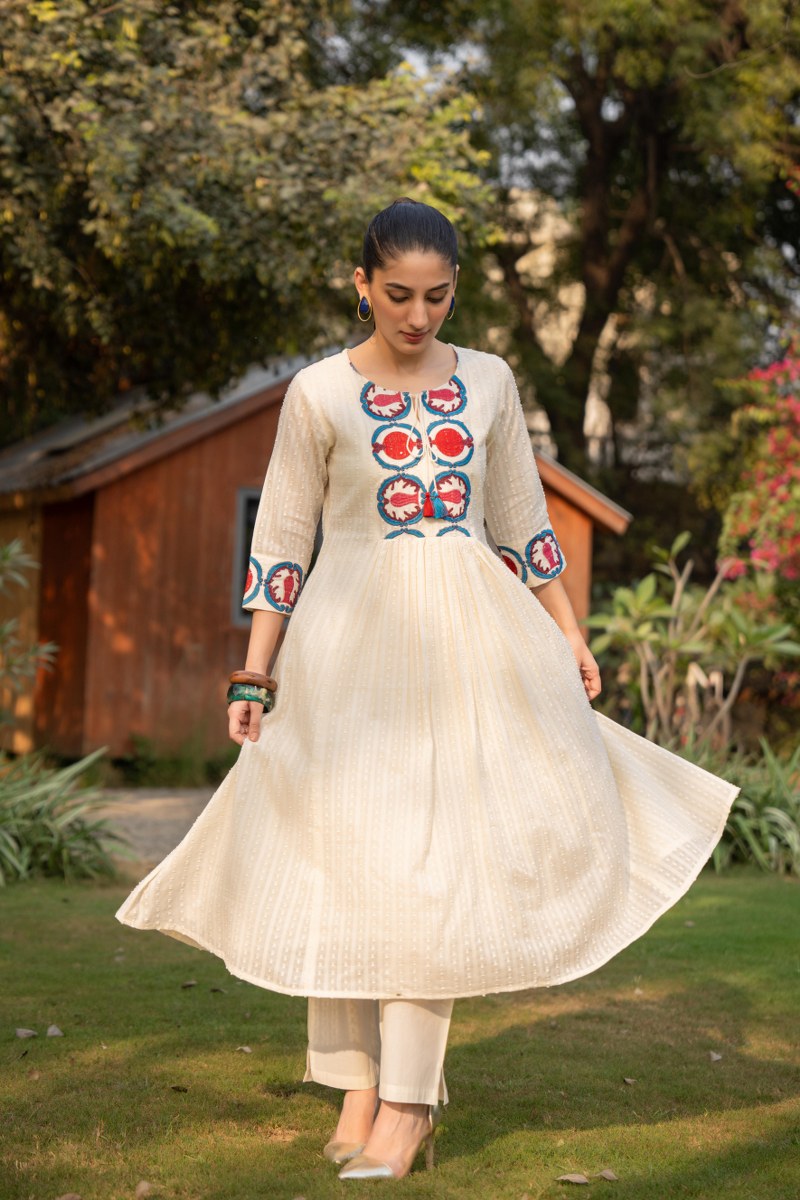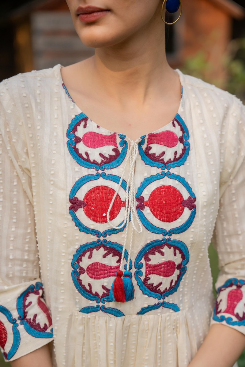 Ivory Kurta with Red & Blue Hand-block Print Accents