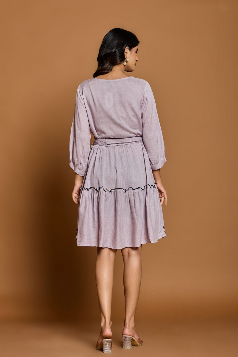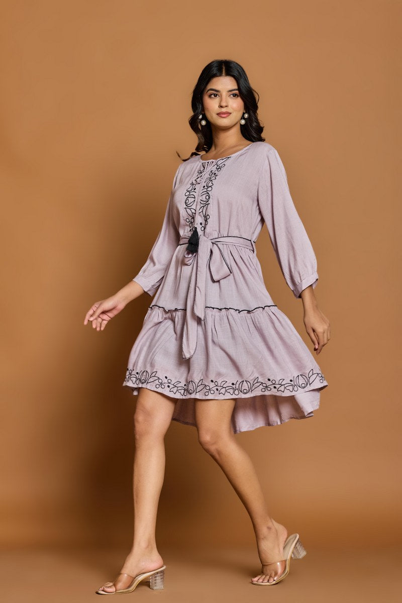 Lavender Embroidered A-Line Short Dress with Waist Belt