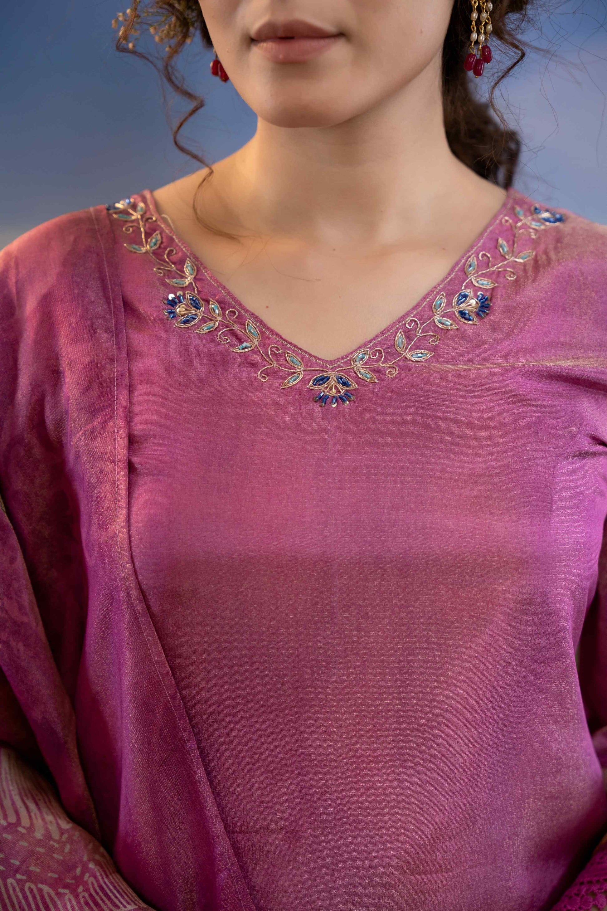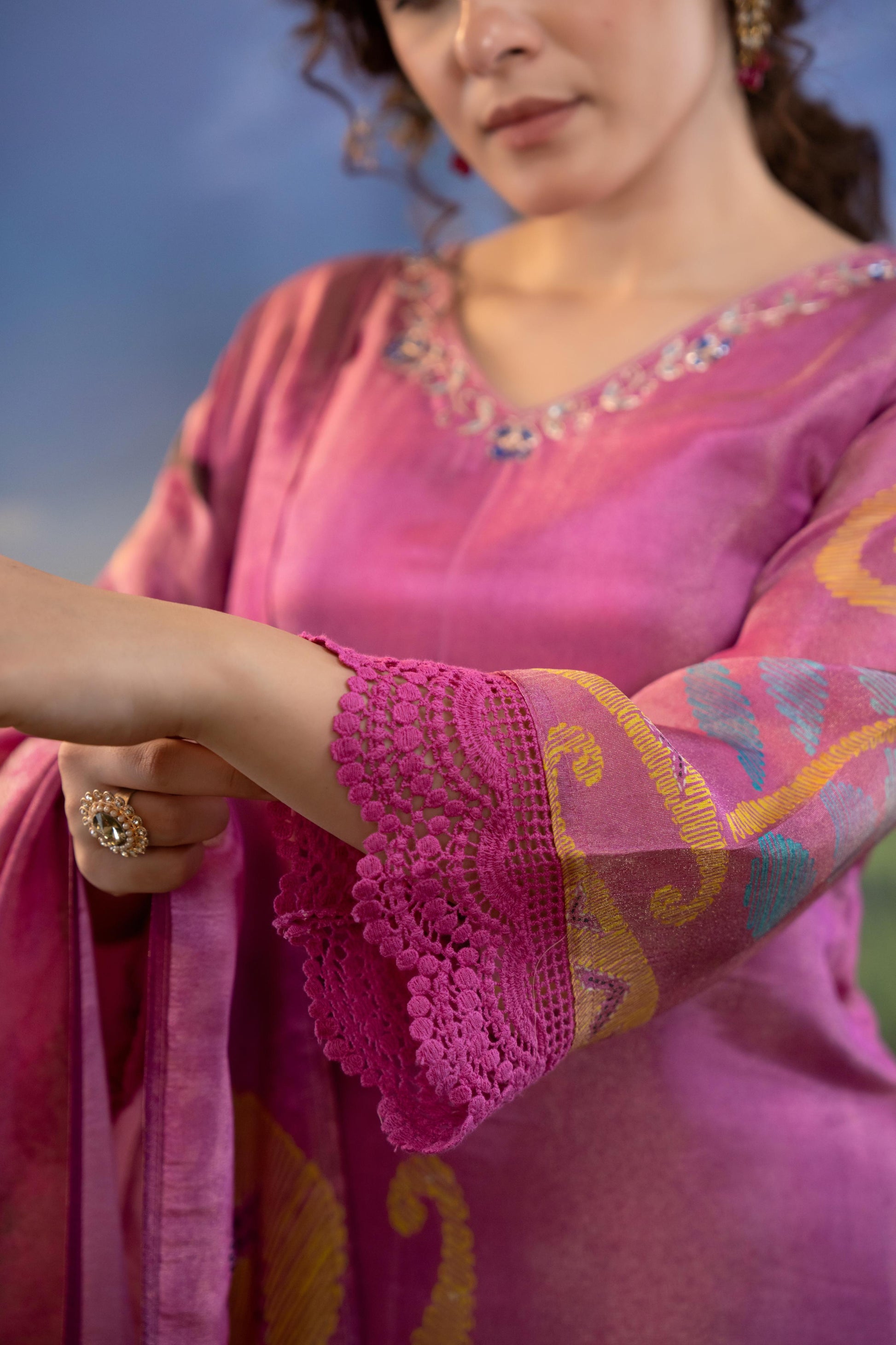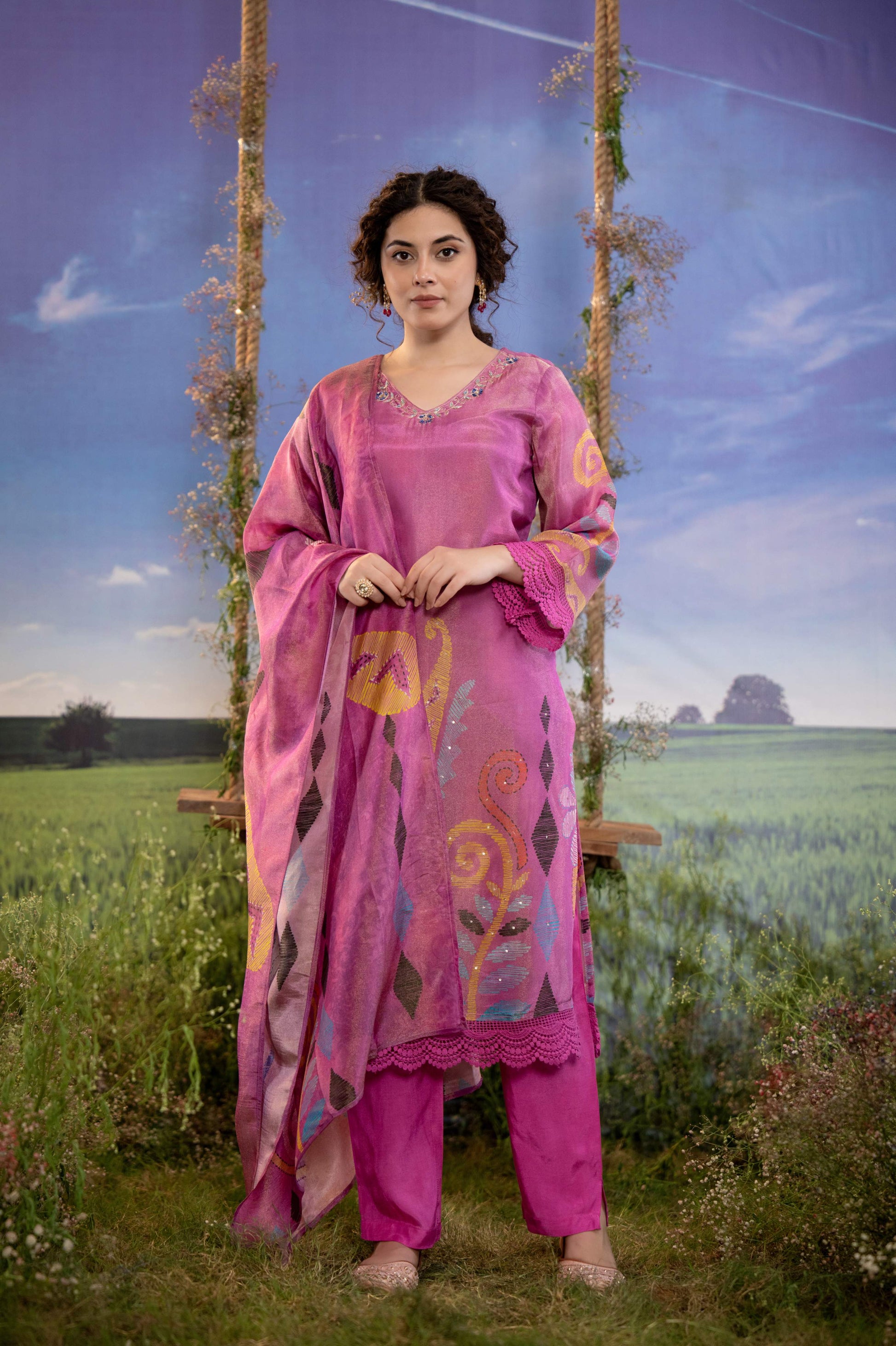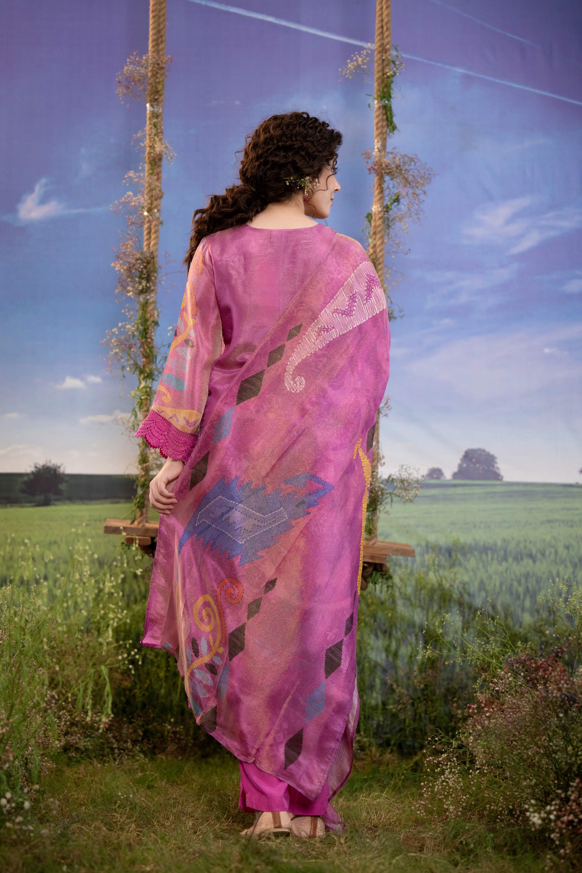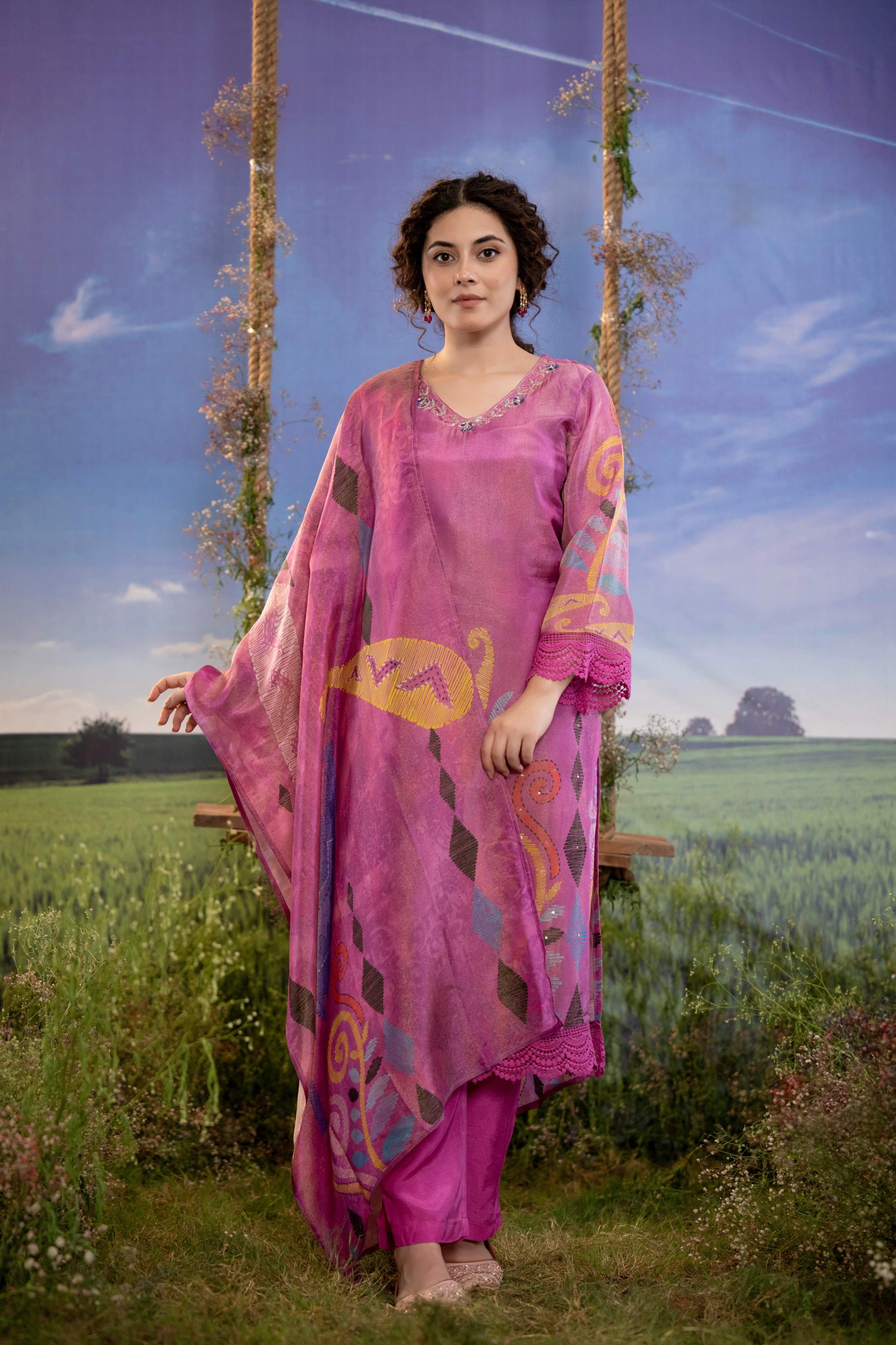 Add a vibrant flair to your ethnic wardrobe with this eye-catching magenta pink 3-piece muslin kurta set, designed with a fusion of abstract and tribal-inspired digital prints. The kurta features a delicate V-neckline with bead and thread embellishment, complemented by lace-trimmed 3/4th sleeves that add an elegant texture.