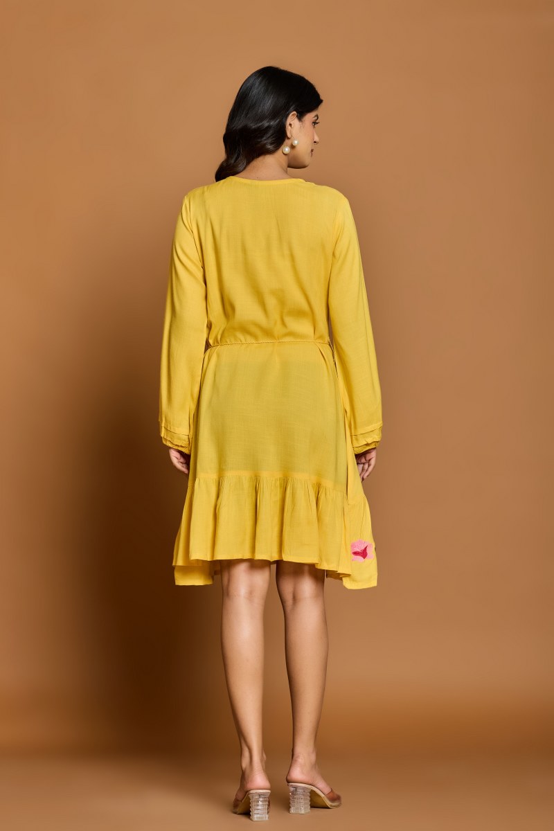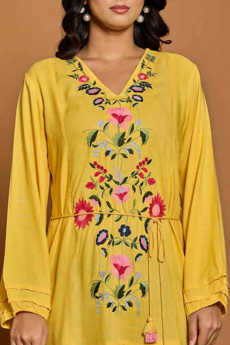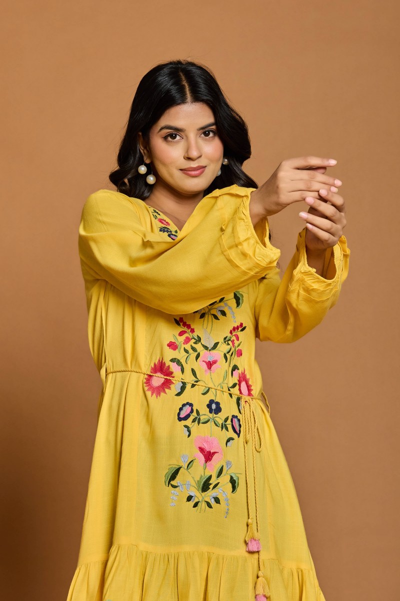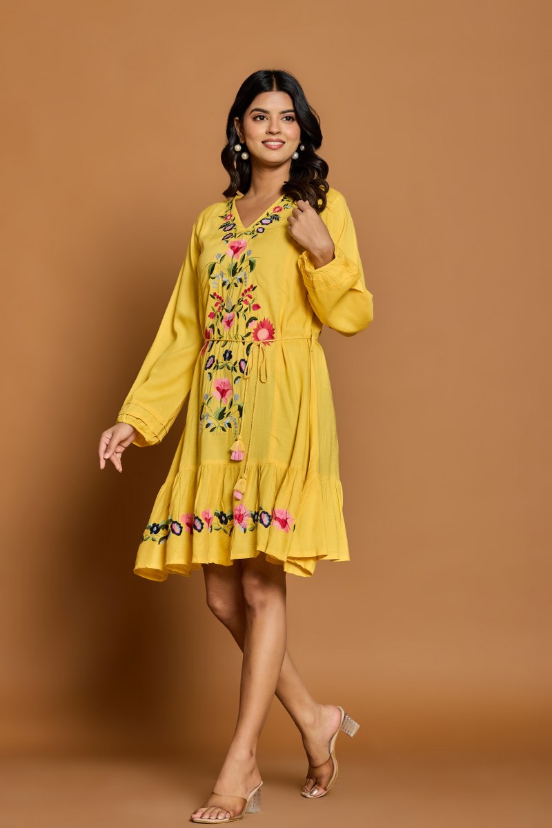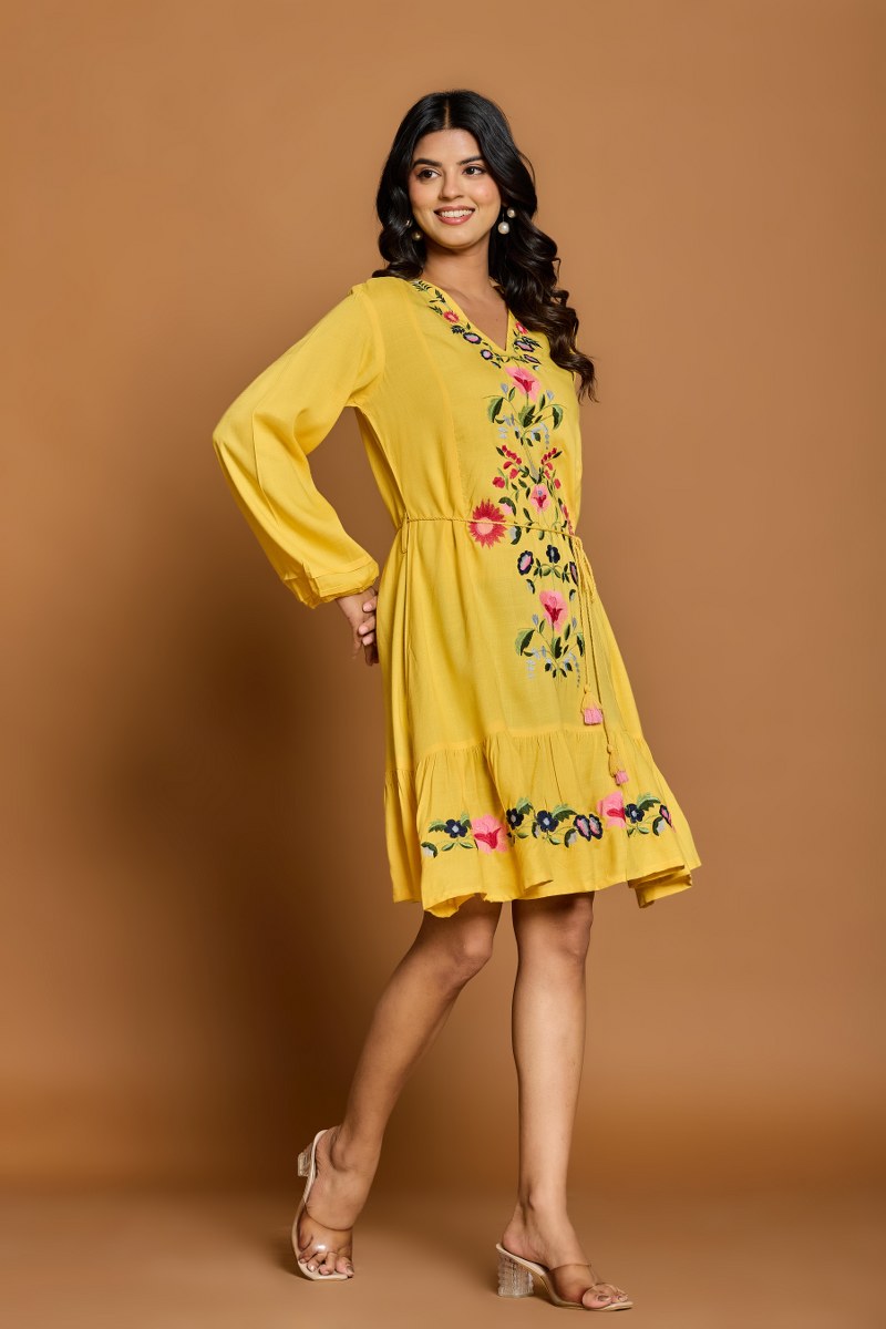 Bring vibrancy to your wardrobe with this eye-catching mustard yellow A-line short dress, beautifully adorned with multicolour floral embroidery. Featuring a flattering V-neckline and voluminous sleeves with soft gathers at the cuffs, this dress combines playful charm with feminine elegance. A delicate waist tie with tassels cinches the waist, enhancing the flattering silhouette, while the embroidered hem adds a whimsical touch. Perfect for brunch dates, vacations, and casual outings, this dress offers comfort with a splash of colour and style.