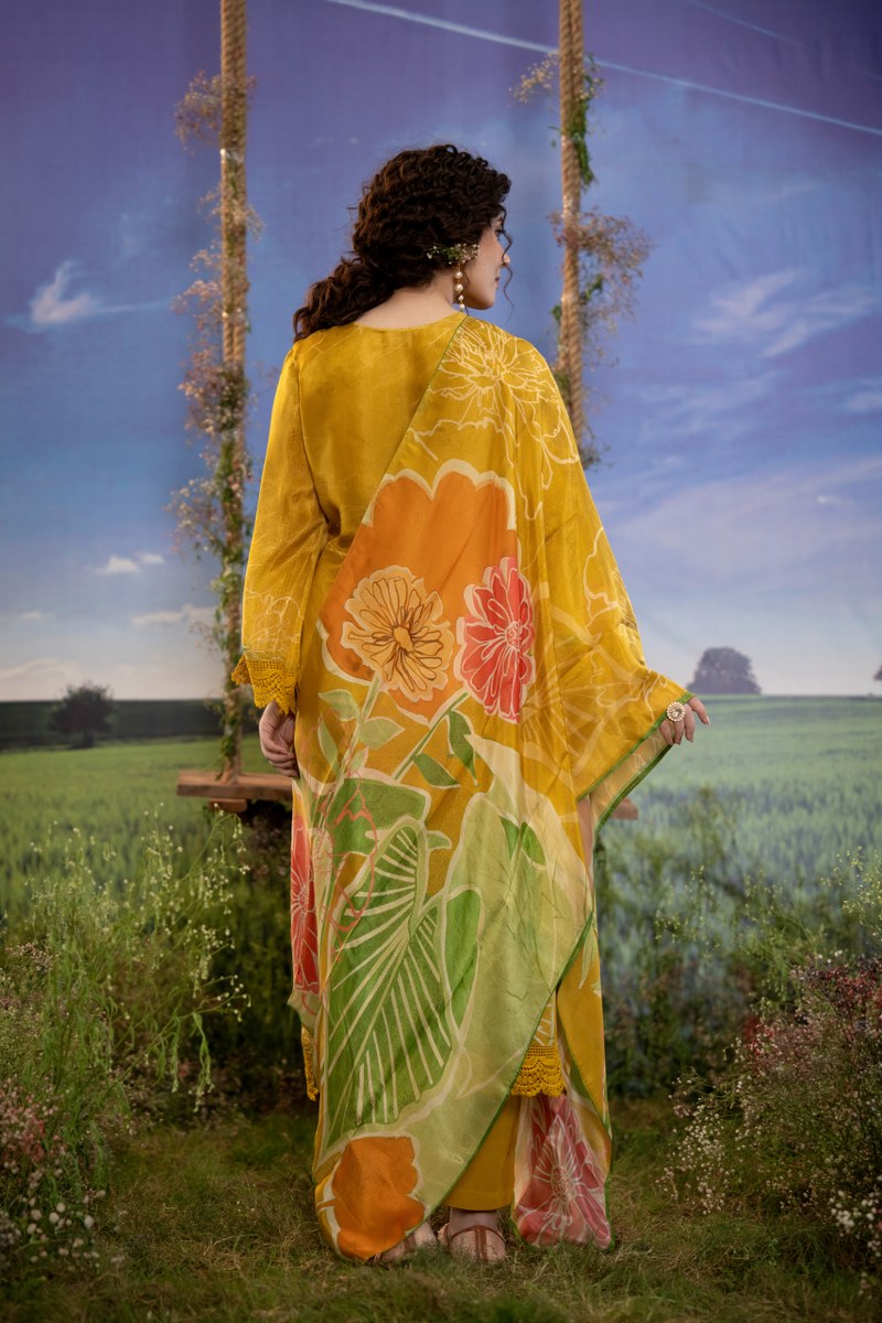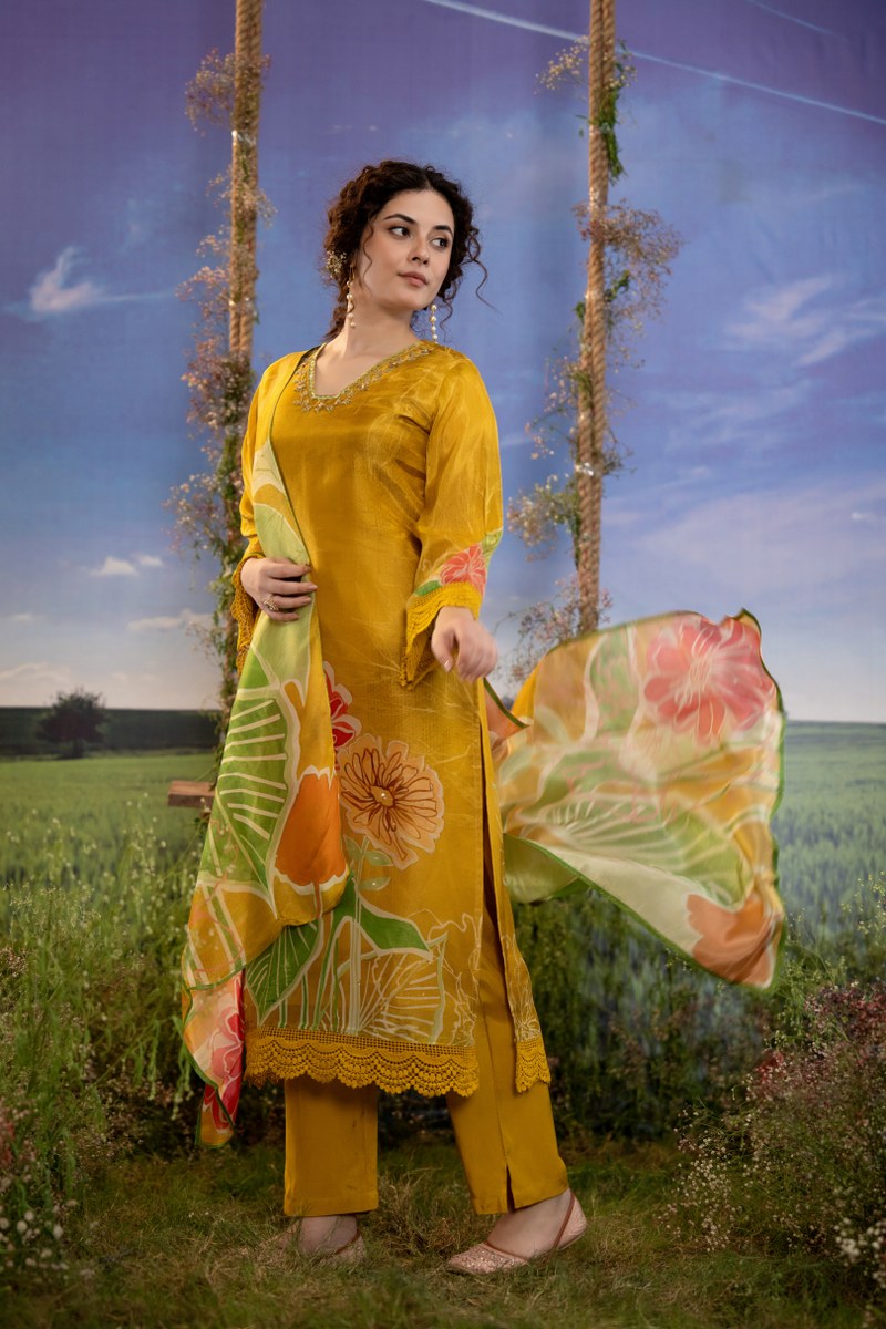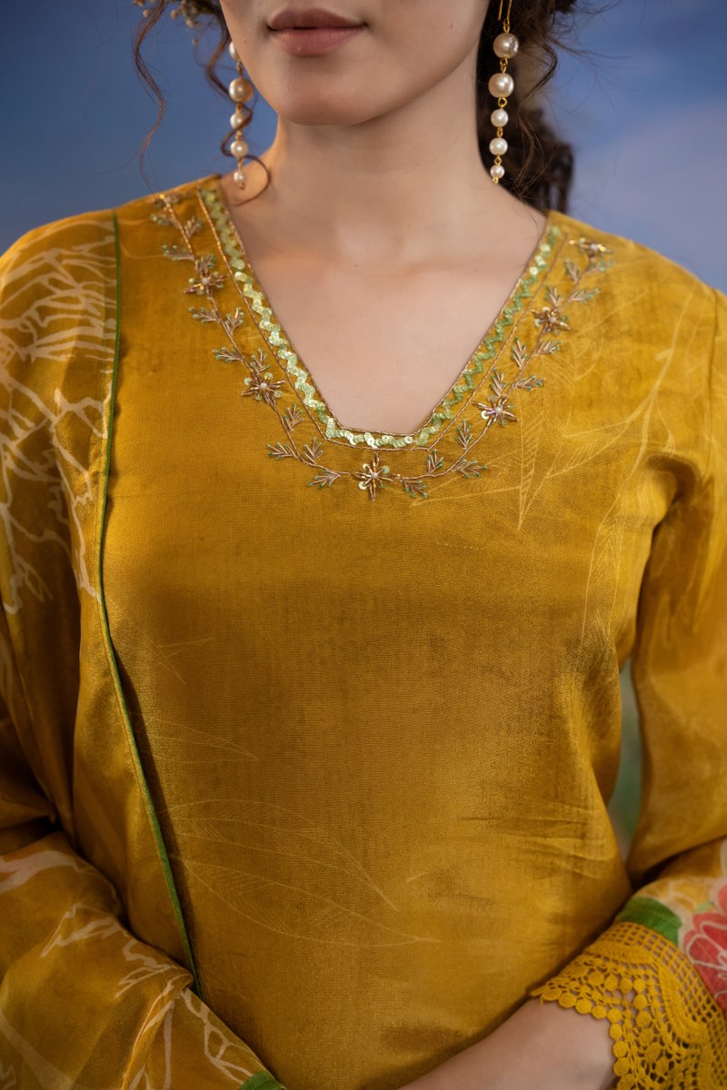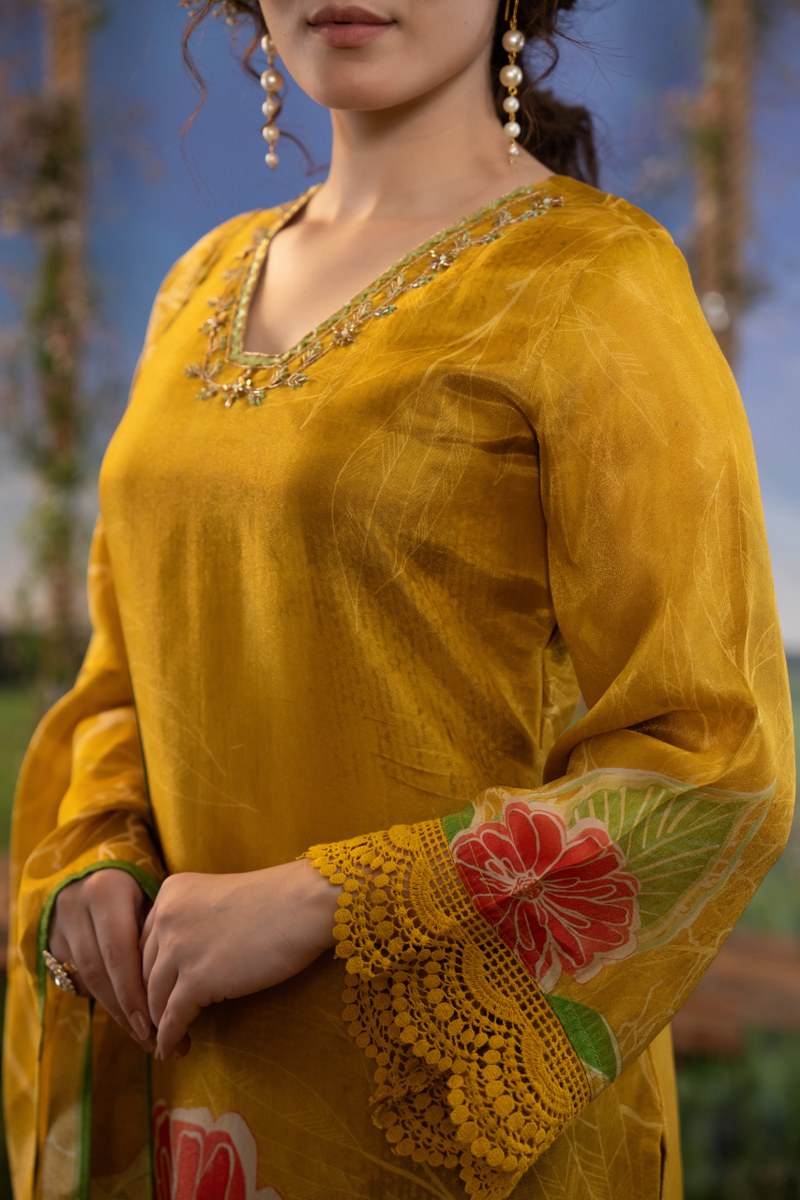 Brighten your ethnic wardrobe with this stunning mustard yellow 3-piece muslin kurta set, designed with rich hues and a refreshing hand-painted floral feel. The kurta features a V-neckline with dainty bead detailing, paired with 3/4th sleeves trimmed in fine lace for a polished finish.