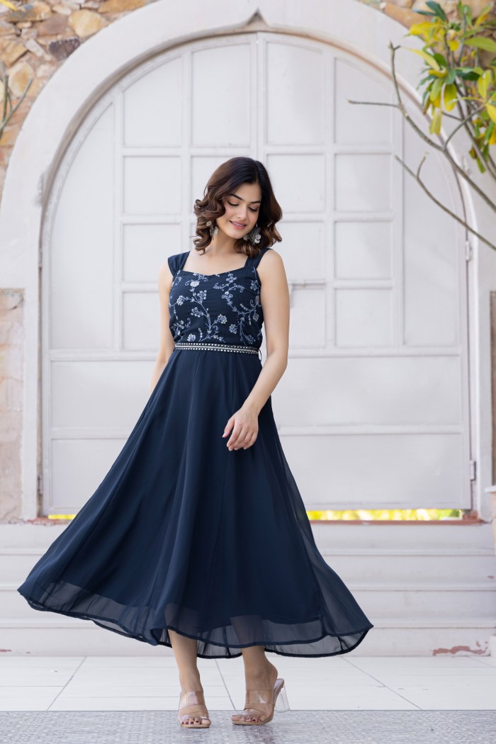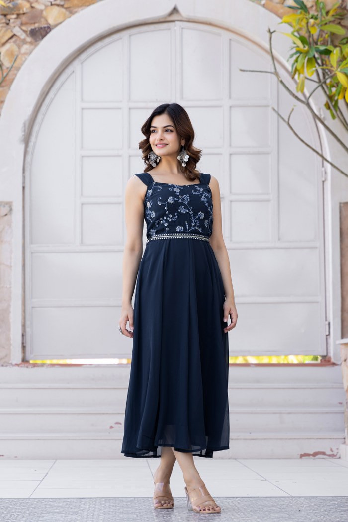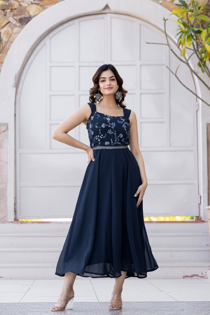 Step into effortless elegance with this stunning navy blue sleeveless midi dress, perfect for festive gatherings and evening occasions. Crafted from flowy georgette fabric, the dress features an intricately embroidered bodice with delicate floral patterns and a touch of mirror work at the waistline to enhance the feminine silhouette. The flared hemline adds graceful movement, making it an ideal choice for twirl-worthy moments. Pair it with statement earrings and heels for a refined and sophisticated look.