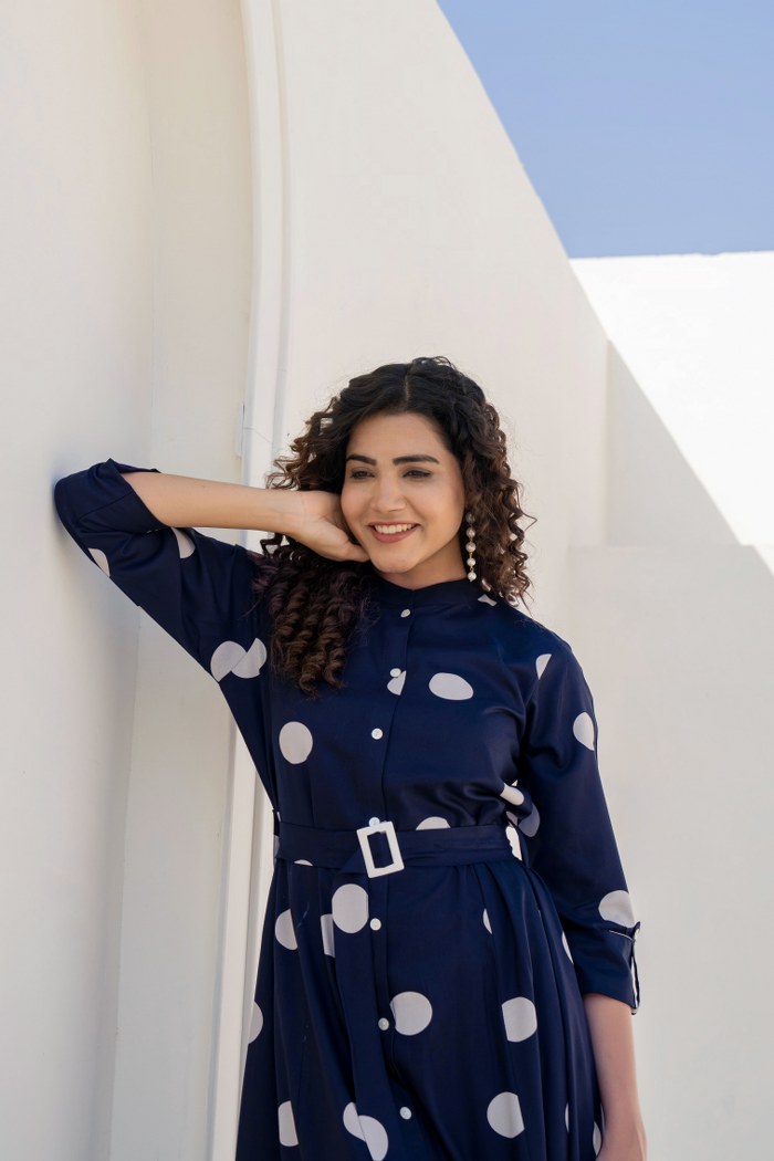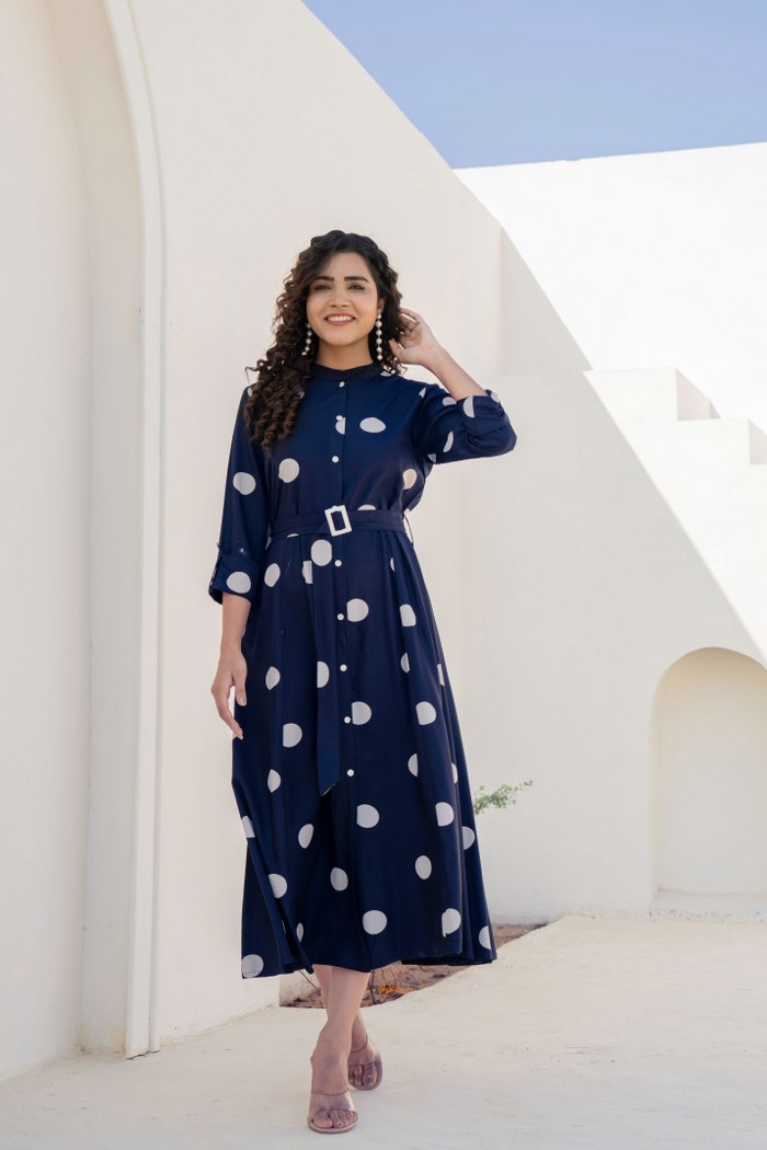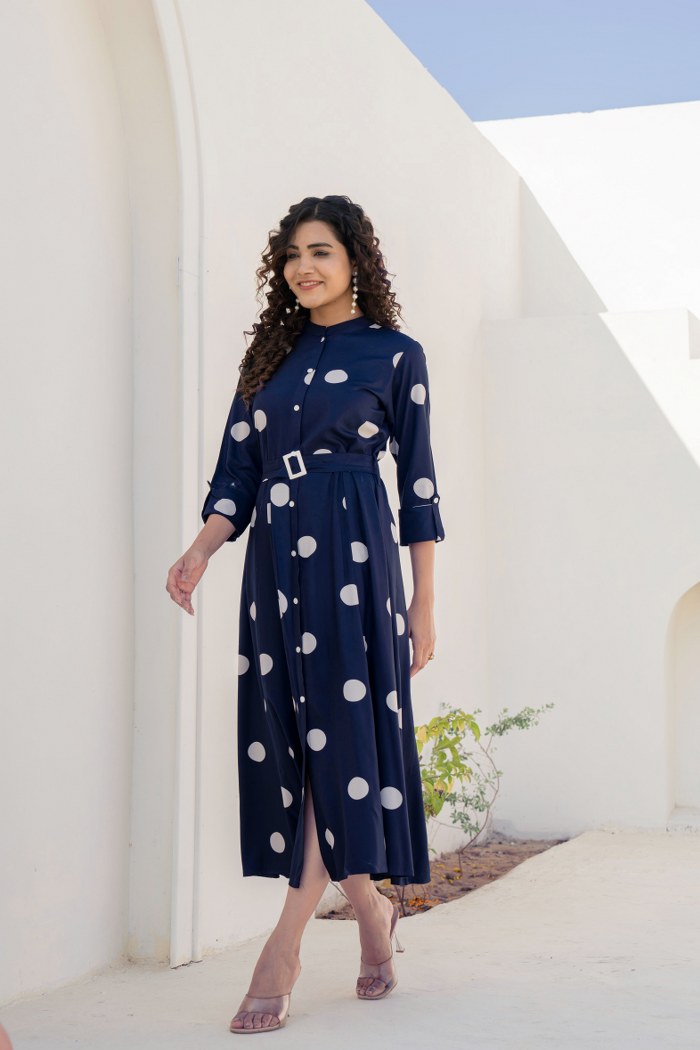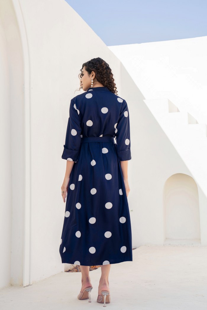Add a playful yet sophisticated vibe to your wardrobe with this navy blue polka dot shirt midi dress. Crafted from soft, flowy fabric, this dress features a smart collared neckline, button-down front, and a matching fabric belt to cinch the waist for a flattering silhouette. The white polka dot print brings a timeless retro charm, while the midi length and relaxed fit ensure all-day comfort. Perfect for brunches, casual meetings, or a day out, pair it with heels or flats for an effortlessly chic look.