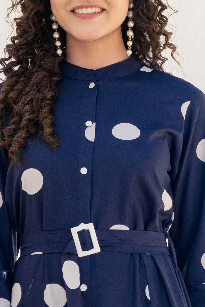 Navy Blue Polka Dot Shirt Midi Dress with Belt