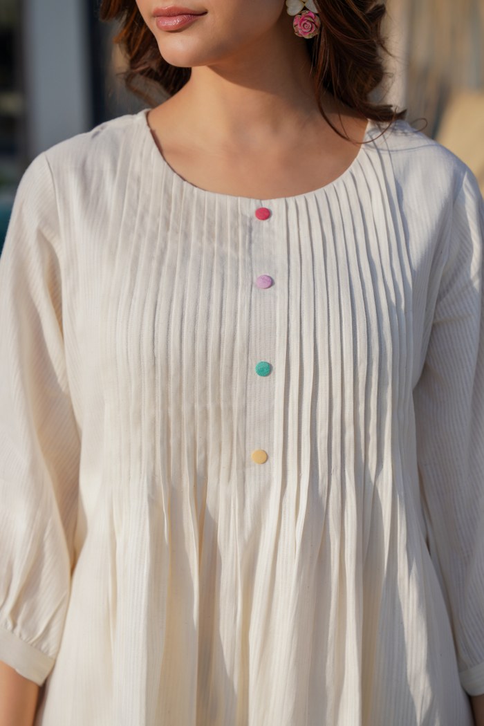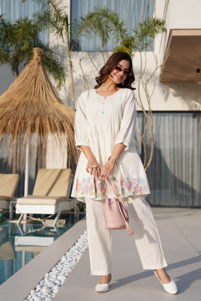 Add a touch of understated elegance to your wardrobe with this beautifully crafted off-white co-ord set. The A-line kurta features delicate pleat detailing on the front and is accentuated with vibrant floral embroidery at the hemline in pastel shades of pink, blue, and green. Playful colored buttons at the placket add a fun, youthful twist. Paired with classic straight-fit pants in matching fabric, this ensemble offers both comfort and sophistication, making it perfect for casual brunches, day events, and resort getaways.