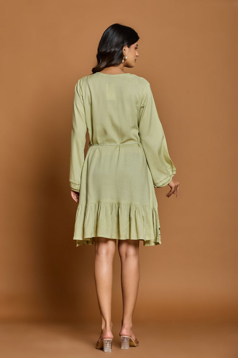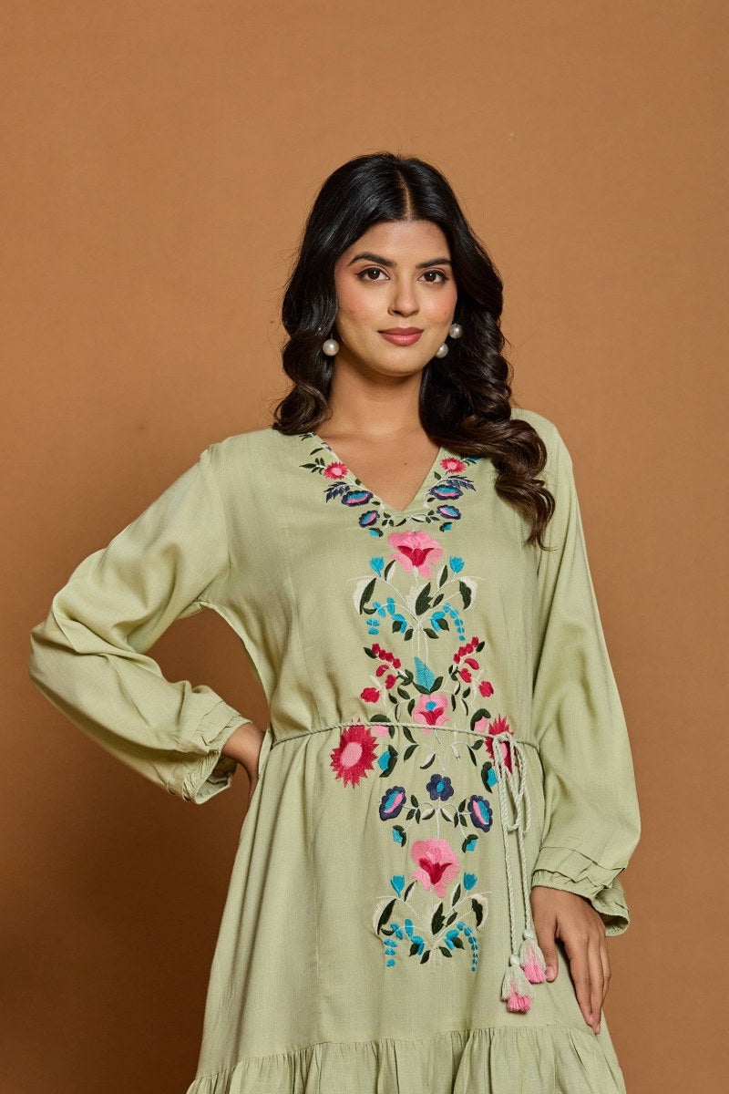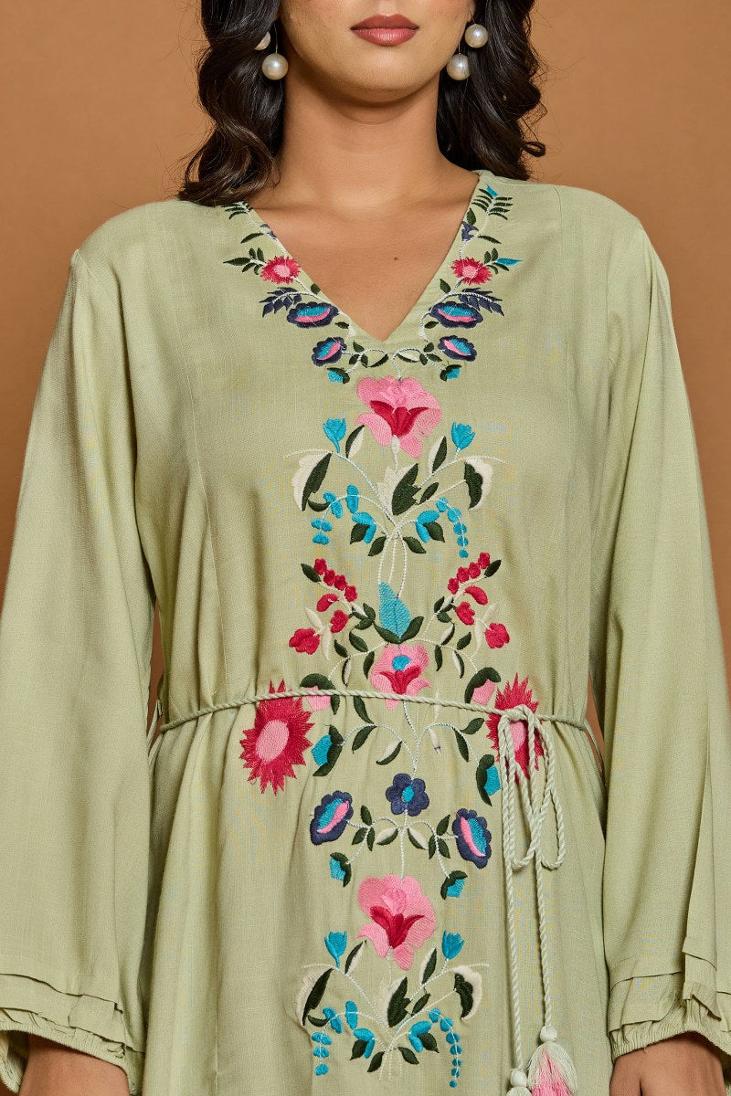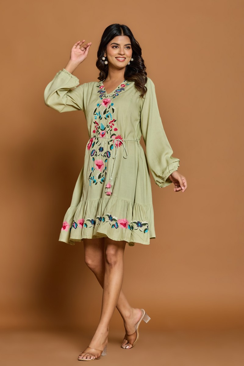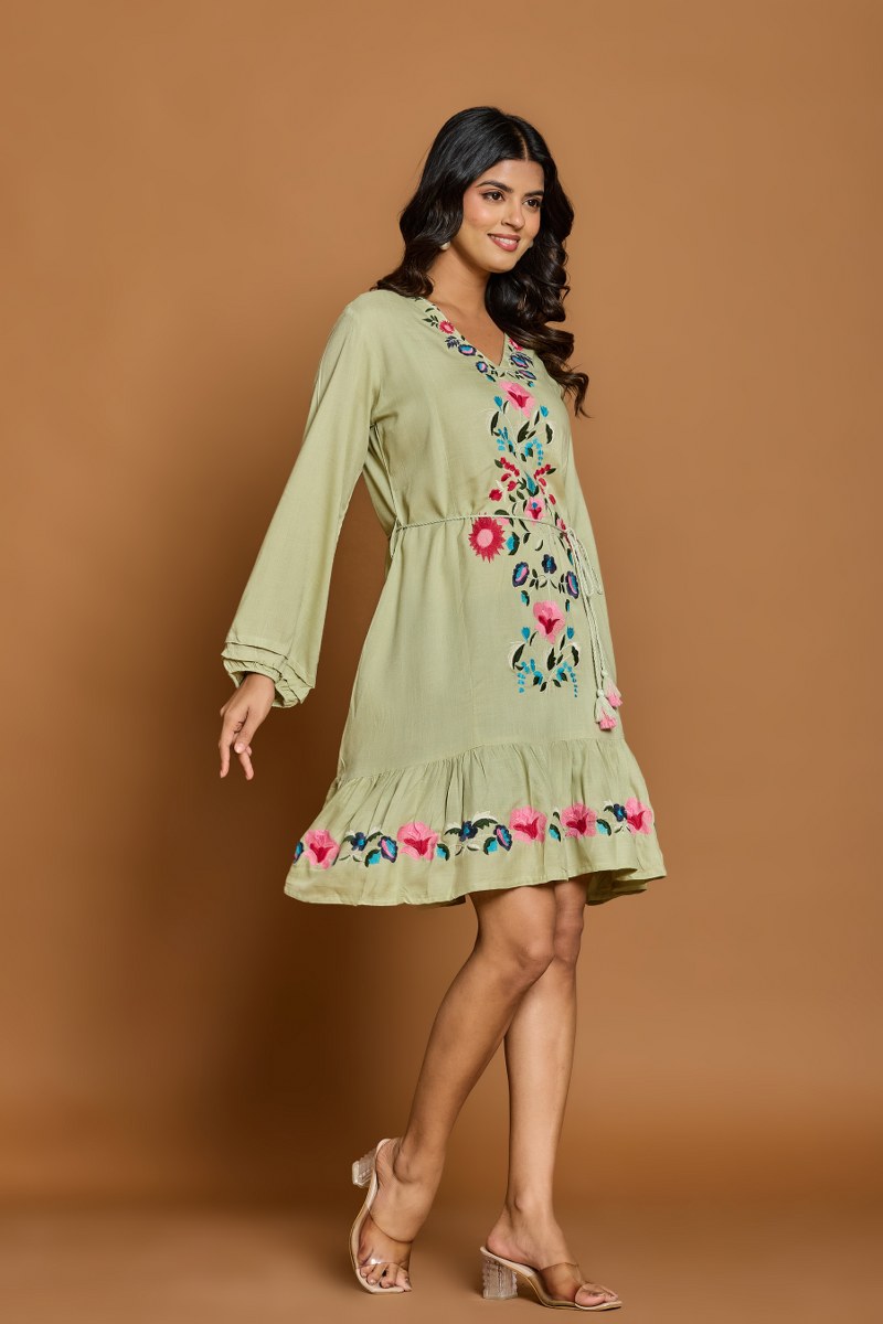 Add a playful yet elegant touch to your wardrobe with this charming olive green A-line short dress. Highlighted with vibrant multicolour floral embroidery along the neckline, bodice, and hemline, this dress exudes effortless style and femininity. Designed with a flattering V-neckline, full-length gathered sleeves, and an adjustable waist tie with tassels, this dress offers both comfort and a flattering silhouette. Ideal for casual outings, vacations, or brunch dates, this piece blends colour and sophistication beautifully.