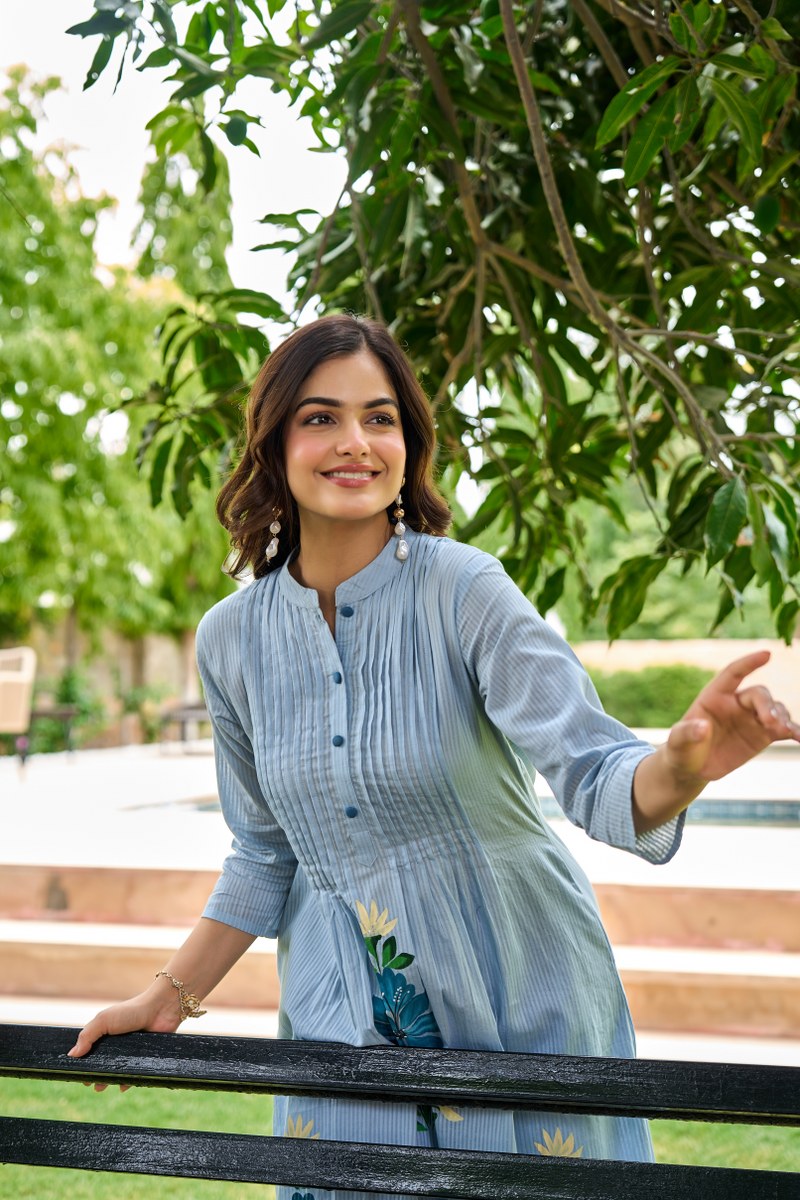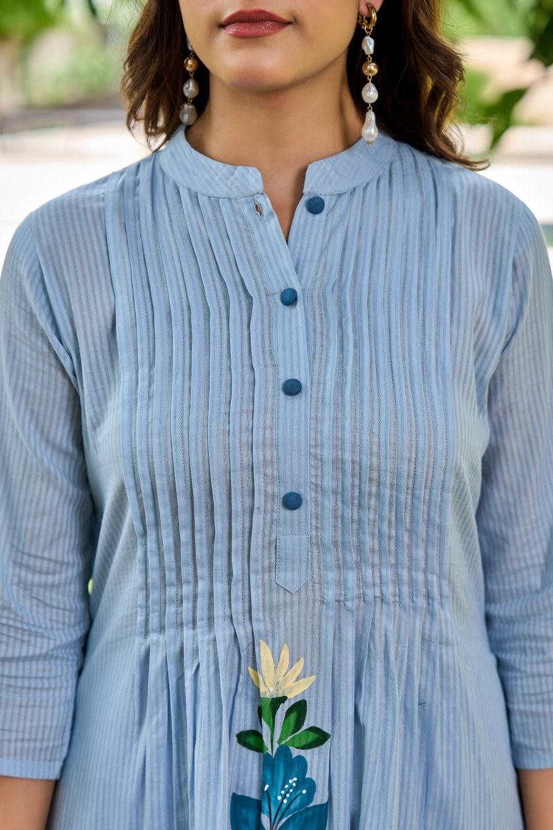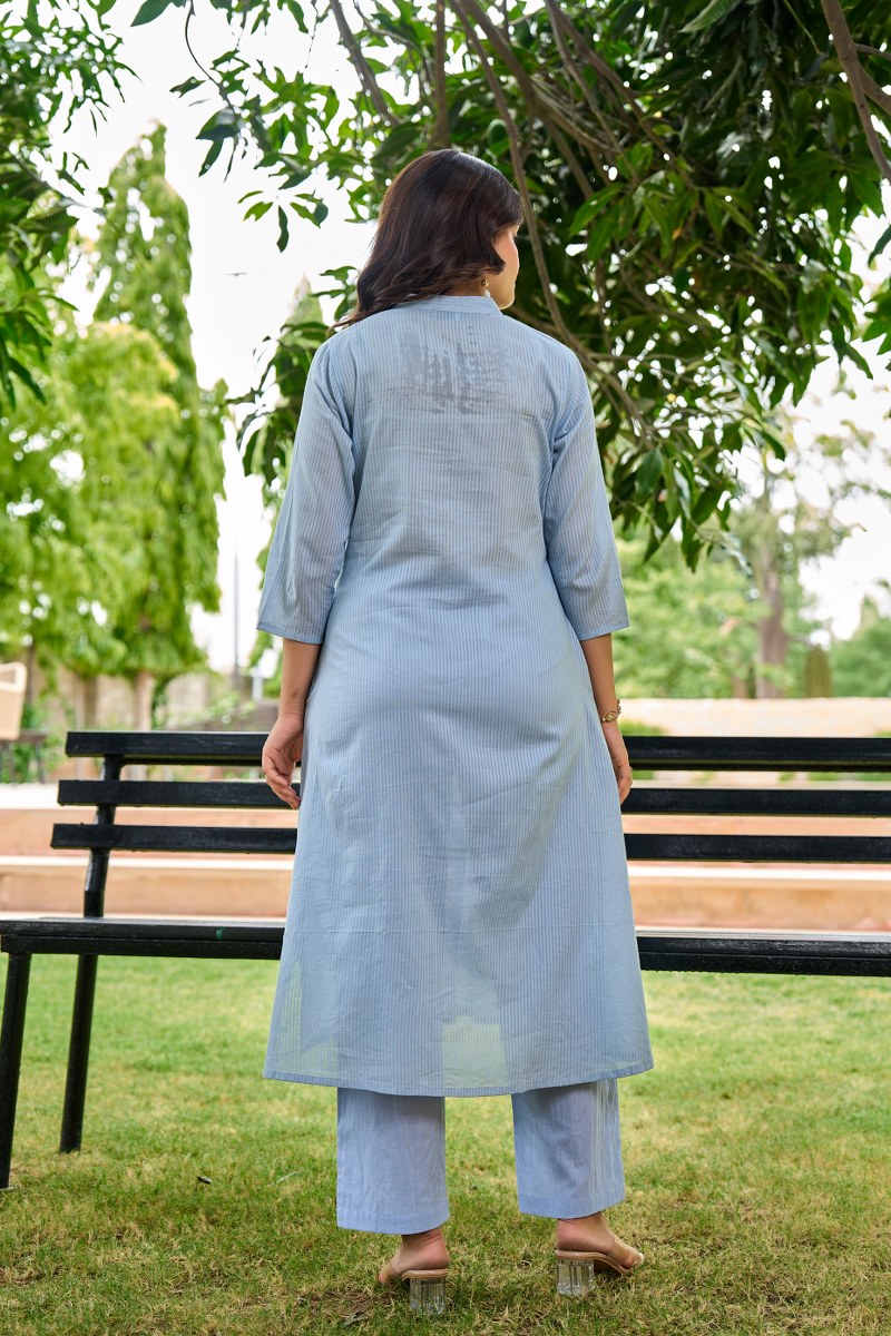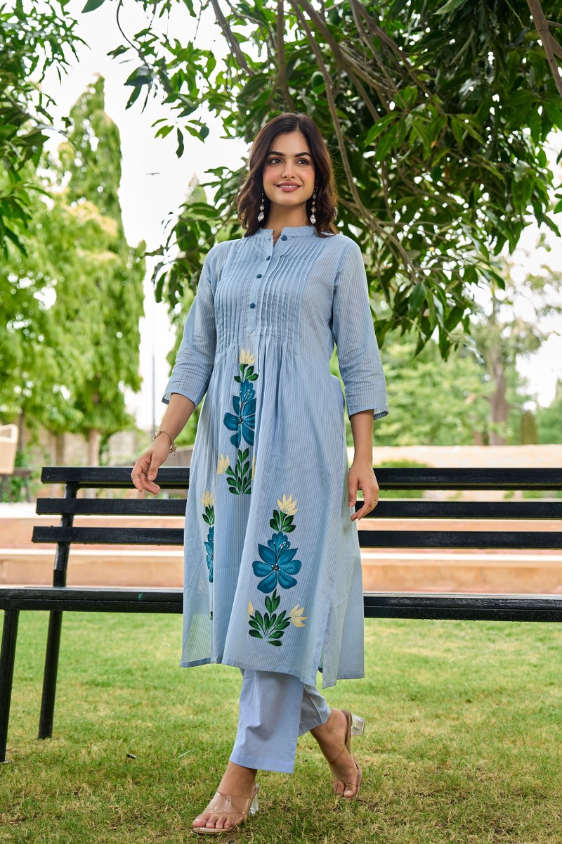 Bring a soft, graceful touch to your wardrobe with this pastel blue floral embroidered cord set. The A-line kurta features elegant pintuck detailing on the front with a buttoned placket and showcases beautiful floral embroidery in shades of blue, green, and white. The Mandarin collar and 3/4th sleeves enhance its sophisticated silhouette. Paired with coordinated straight-fit pastel blue pants, this set is ideal for casual outings, office wear, or serene summer days.