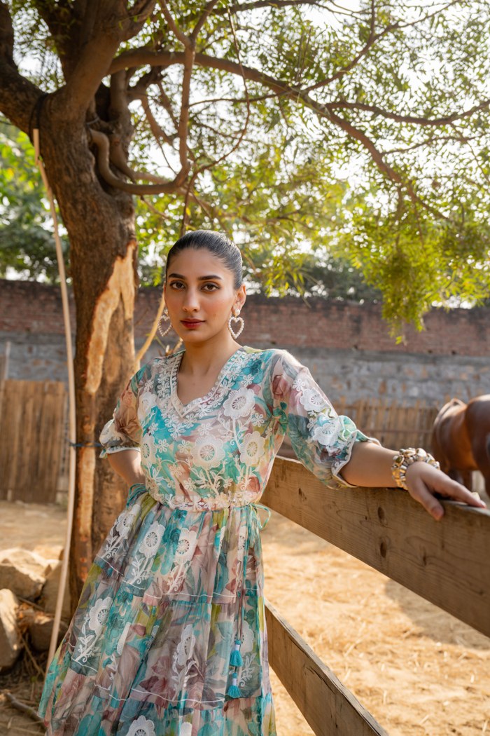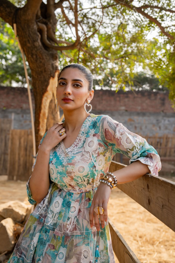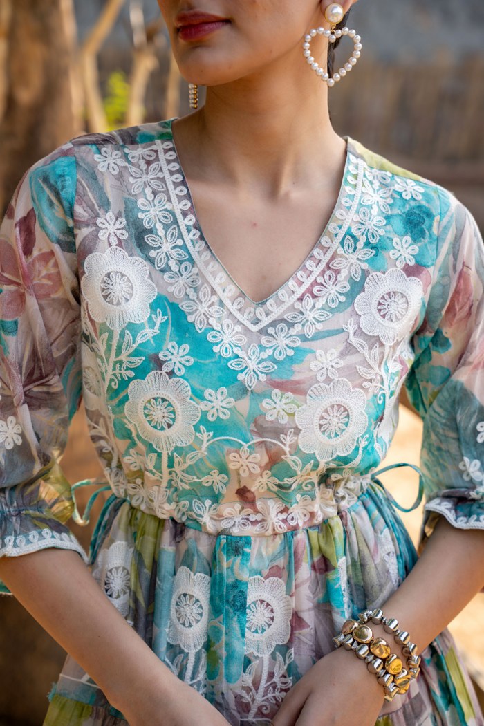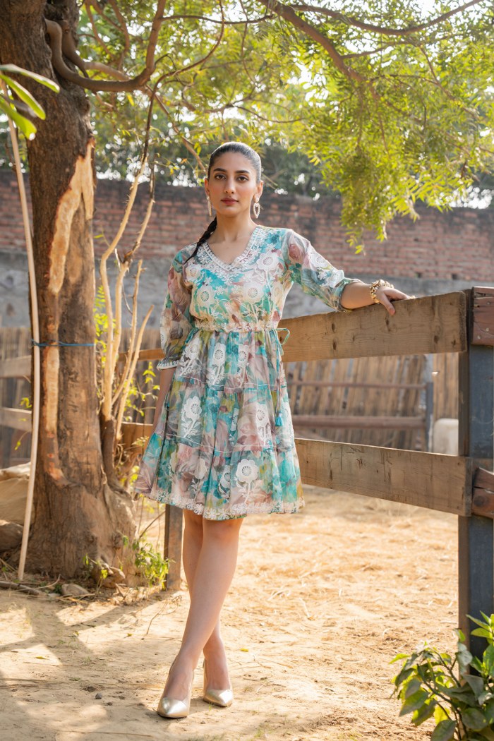 Step into effortless elegance with this pastel blue and peach A-line short dress, beautifully detailed with floral prints and intricate white embroidery. Featuring a flattering V-neckline, 3/4th gathered sleeves, and an adjustable drawstring waist with tassel ties, this dress offers a soft, feminine silhouette. The airy and lightweight fabric makes it a perfect choice for casual outings, brunches, vacations, or resort wear. Its harmonious pastel tones and floral motifs create a graceful, breezy look.