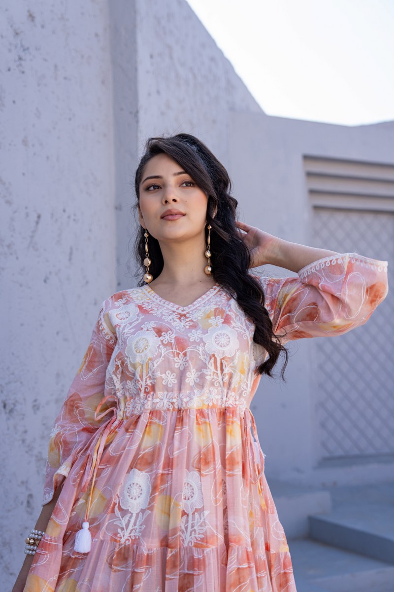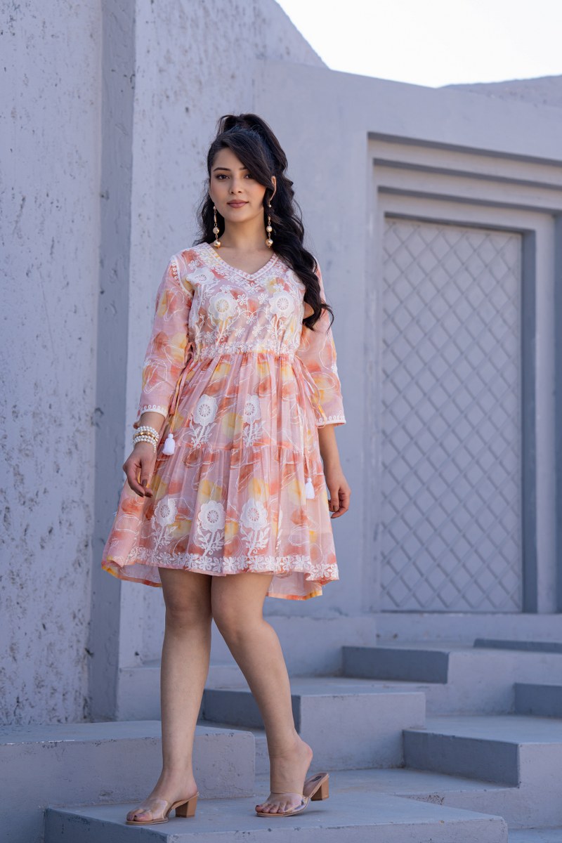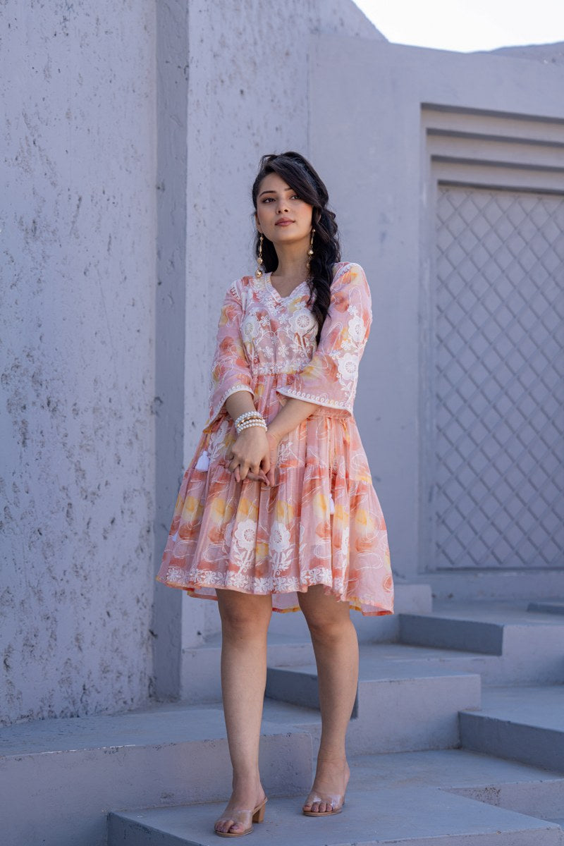 Add a soft, feminine charm to your wardrobe with this elegant peach orange A-line short dress, beautifully enhanced with floral prints and intricate white embroidery. Designed with a flattering V-neckline, 3/4th flared sleeves, and an adjustable drawstring waist with playful tassel ties, this dress combines comfort with effortless style. The flowy silhouette and delicate colour palette make it perfect for daytime outings, brunches, or vacation wear.