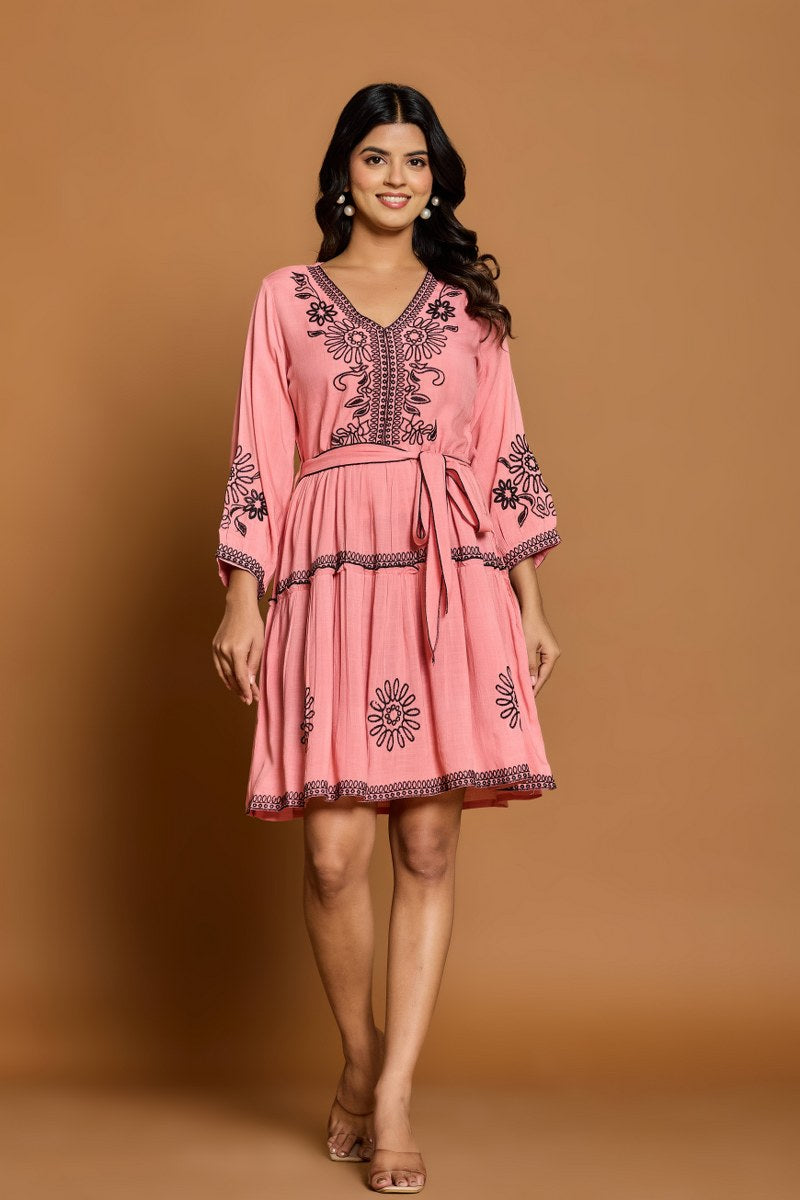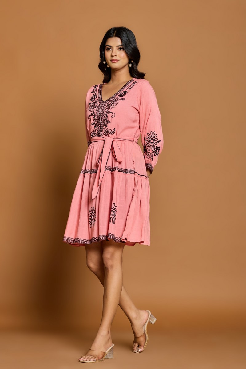 Peach Pink Embroidered A-Line Short Dress with Waist Belt