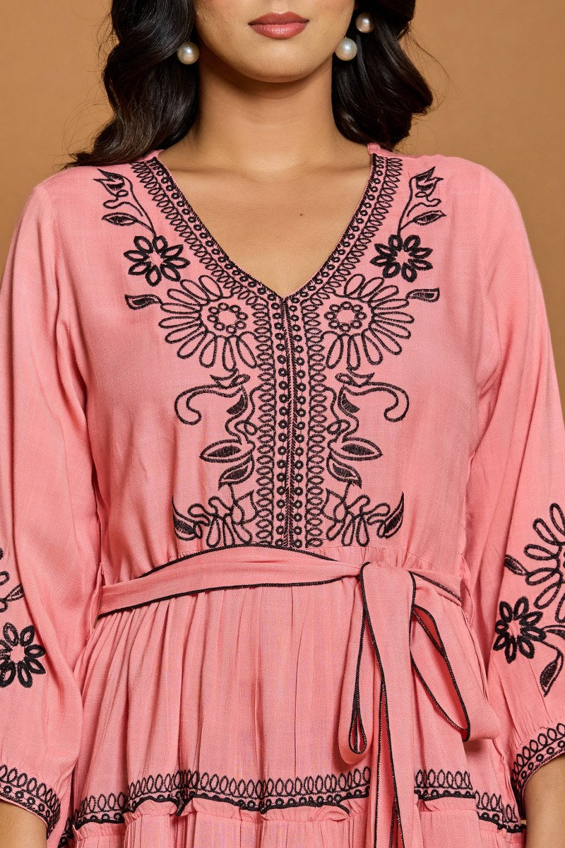 Brighten your everyday wardrobe with this elegant peach pink A-line short dress, beautifully detailed with bold black floral embroidery on the neckline, sleeves, and hemline. Featuring a flattering V-neckline and full gathered sleeves, this dress is finished with a detachable waist belt for a customised fit and silhouette. The soft, flowy hem adds a playful touch, making it ideal for casual outings, brunches, or vacation wear. Crafted in a lightweight cotton blend, this dress promises style with all-day comfort.