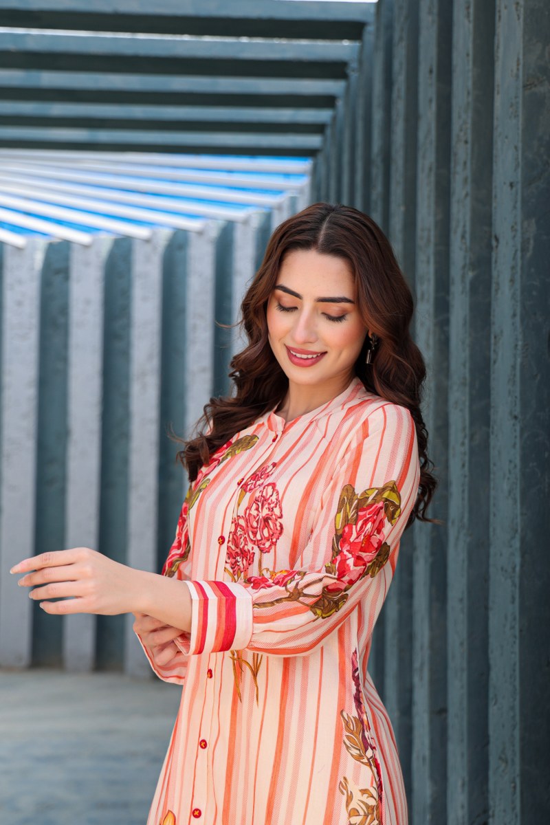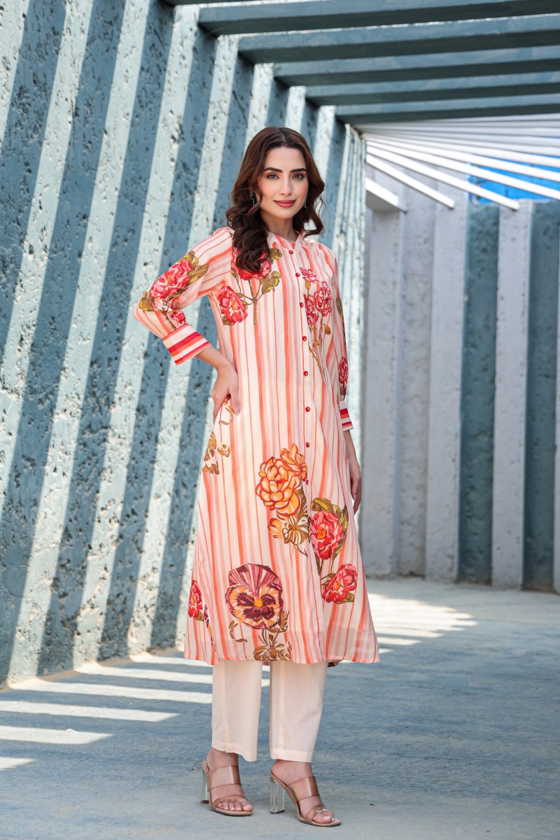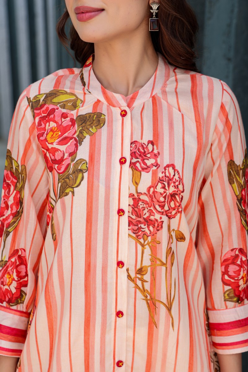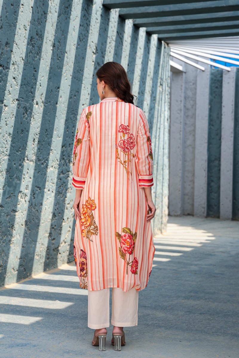Step into effortless elegance with this peach striped floral printed cord set. Crafted in breathable cotton, this A-line kurta features a soothing peach and ivory striped pattern adorned with vibrant multicolor floral prints. The front button-down closure and mandarin collar add a contemporary touch, while the full sleeves with cuff detailing lend a polished look. Paired with ivory straight-fit pants, this set is perfect for casual gatherings, brunches, or smart everyday dressing.