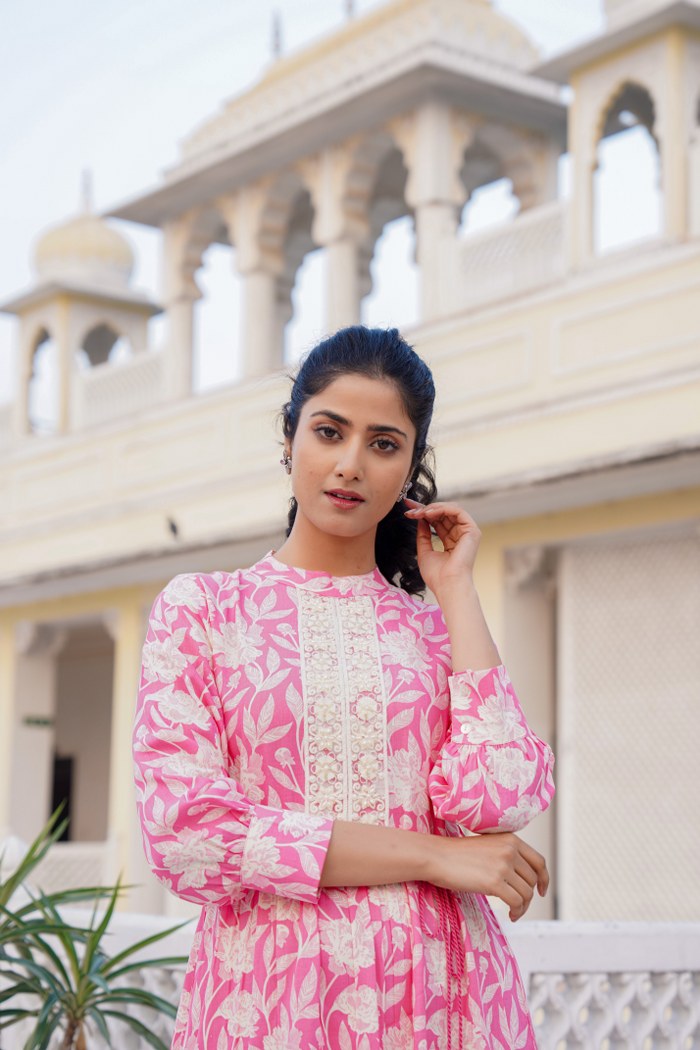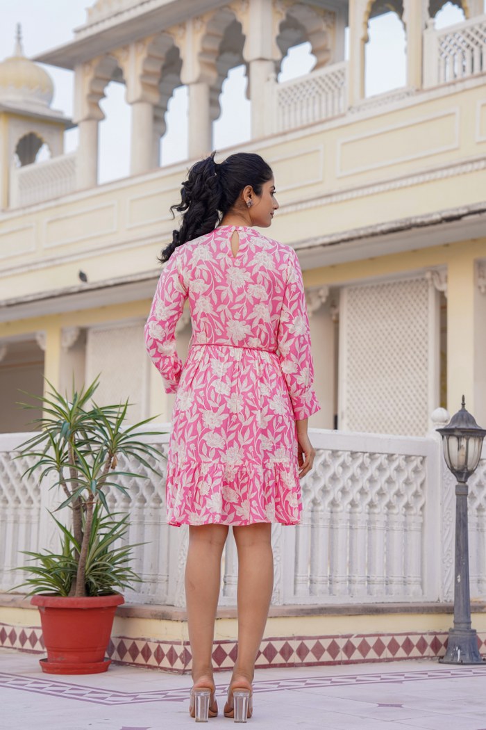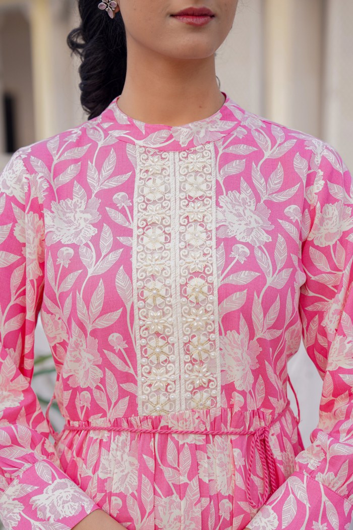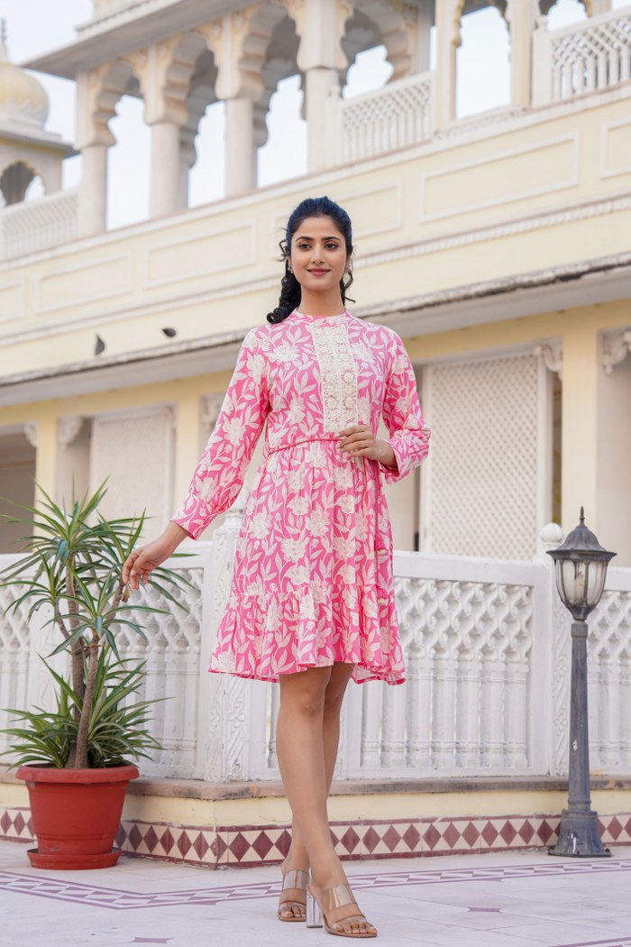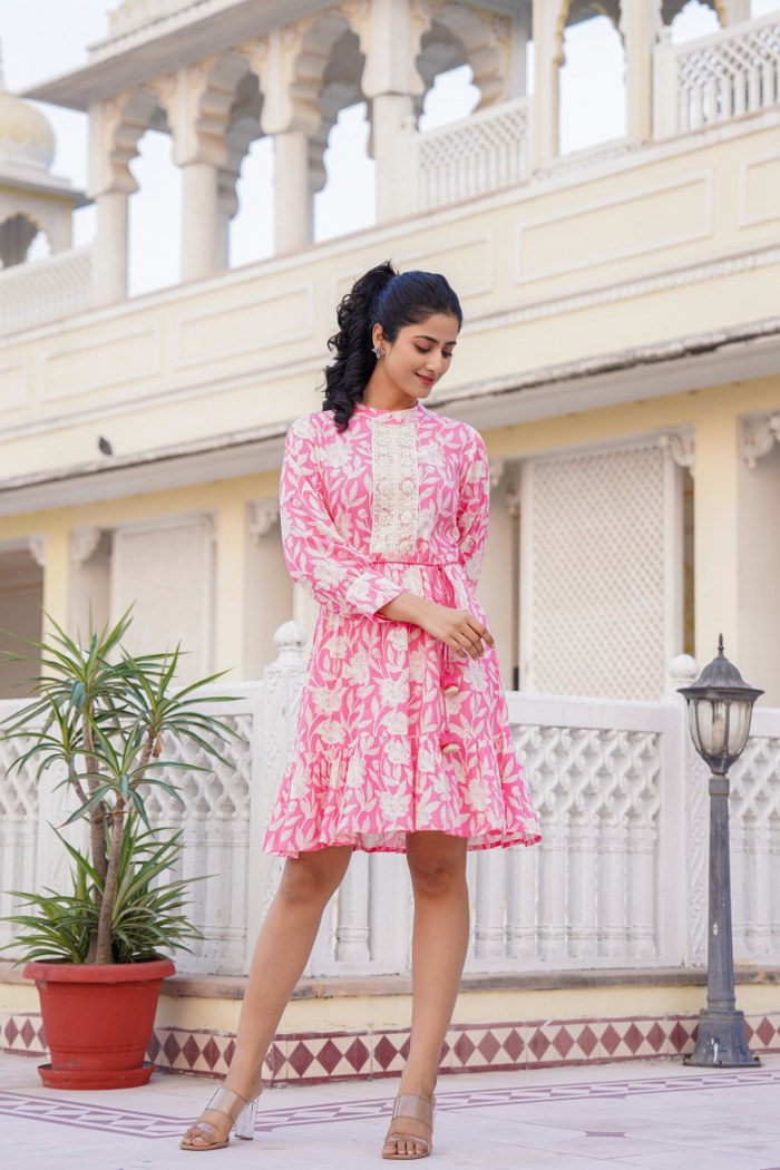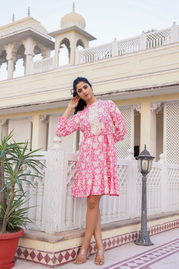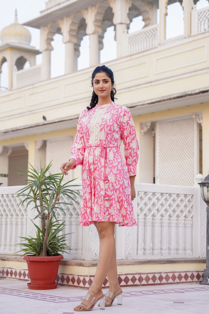 Brighten up your wardrobe with this lively pink A-line short dress, designed to offer comfort with style. Featuring an elegant off-white floral print, this playful dress is accentuated with a flared hemline and charming 3/4th bell sleeves. The front placket is beautifully adorned with intricate lacework and fabric buttons, adding a delicate vintage touch. Whether it's a casual day out, brunch, or a summer getaway, this dress ensures a fresh, feminine, and effortlessly chic look.