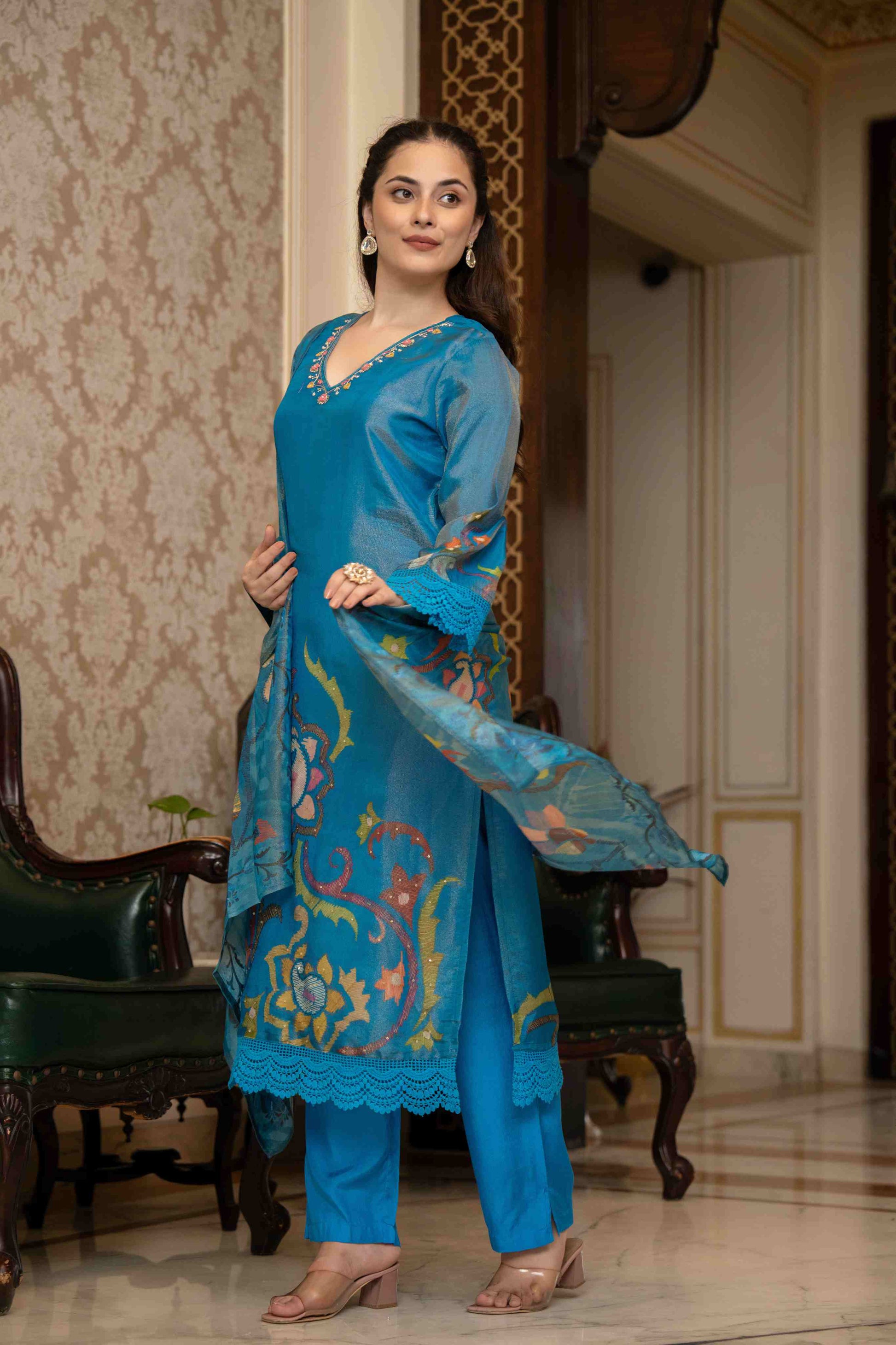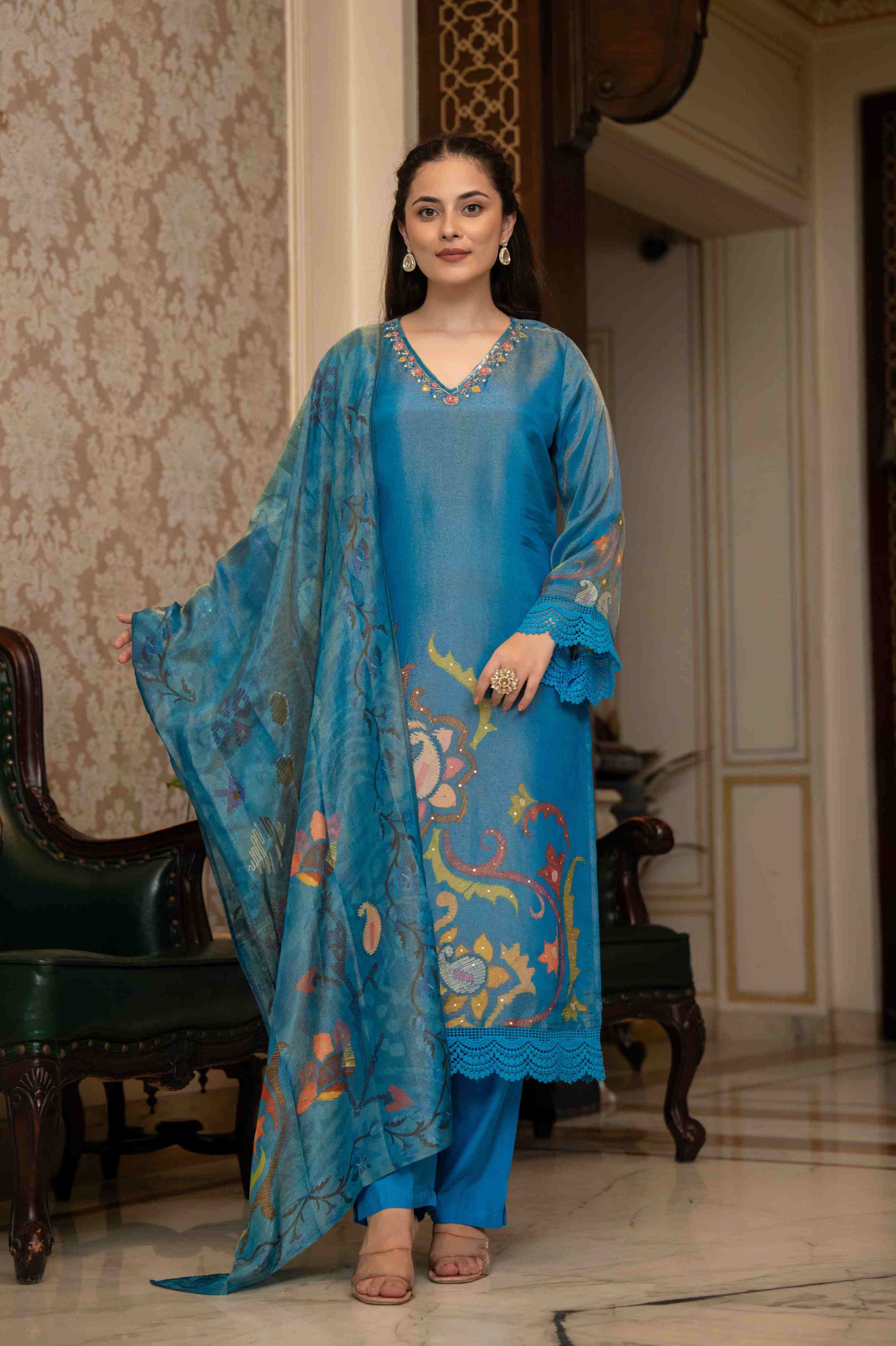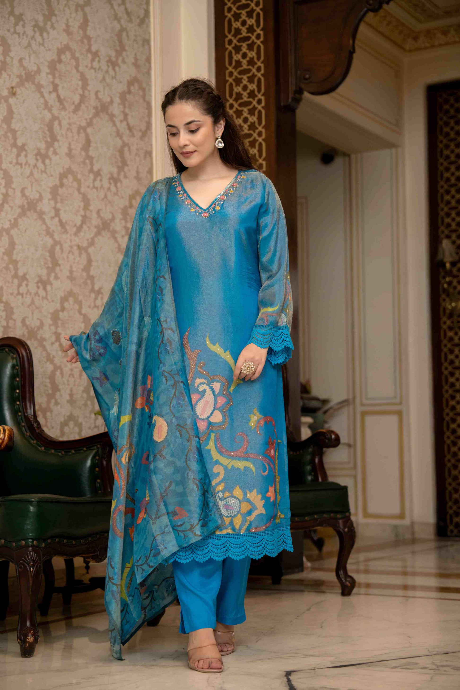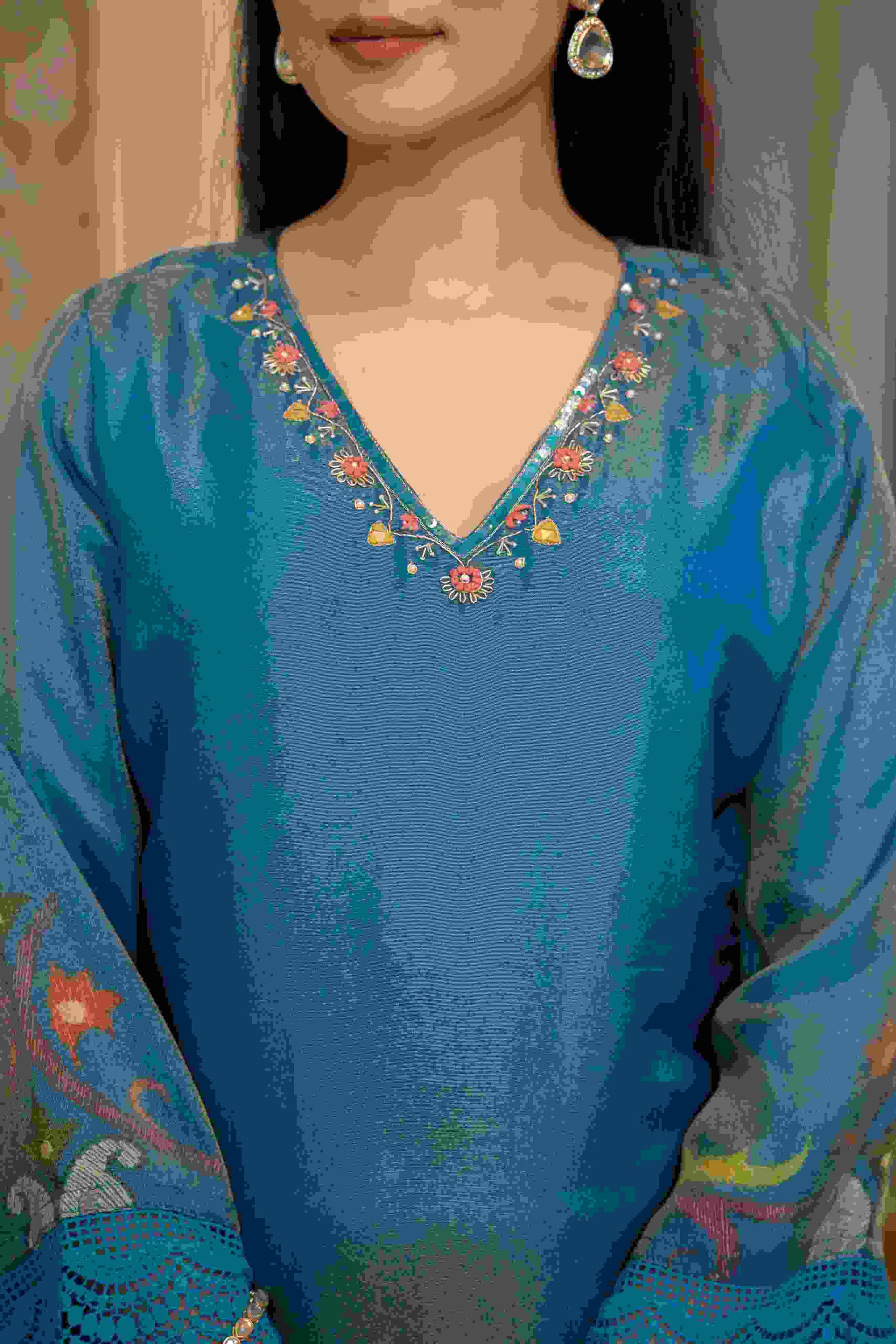 Step into timeless elegance with this royal blue muslin 3-piece kurta set, designed with regal tones and artistic floral motifs. The kurta features a V-neckline delicately embellished with multicolor thread embroidery and beadwork, accompanied by scalloped lace cuffs for added sophistication.