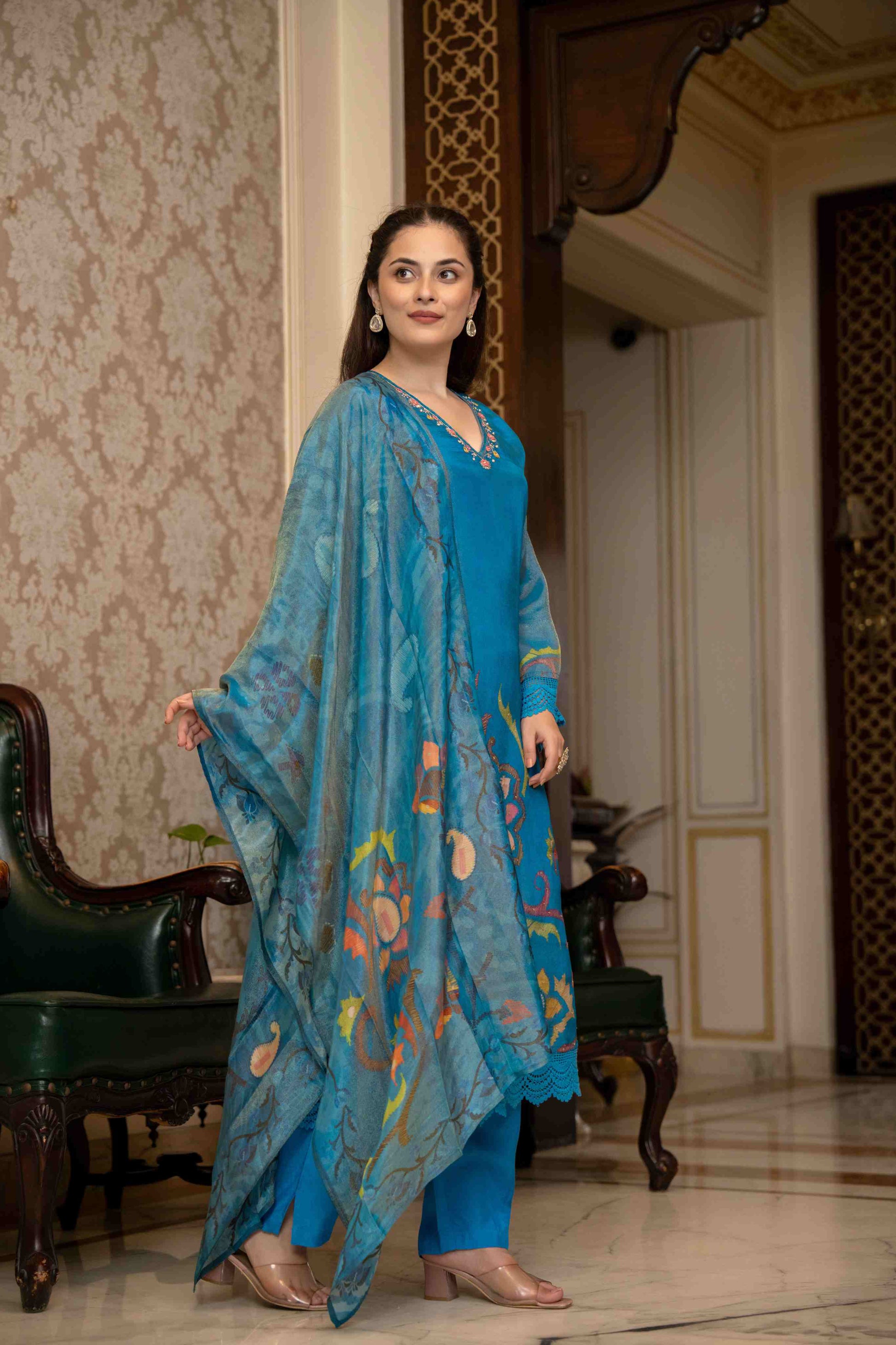 Royal Blue Embroidered Floral Muslin 3-Piece Kurta Set with Dupatta