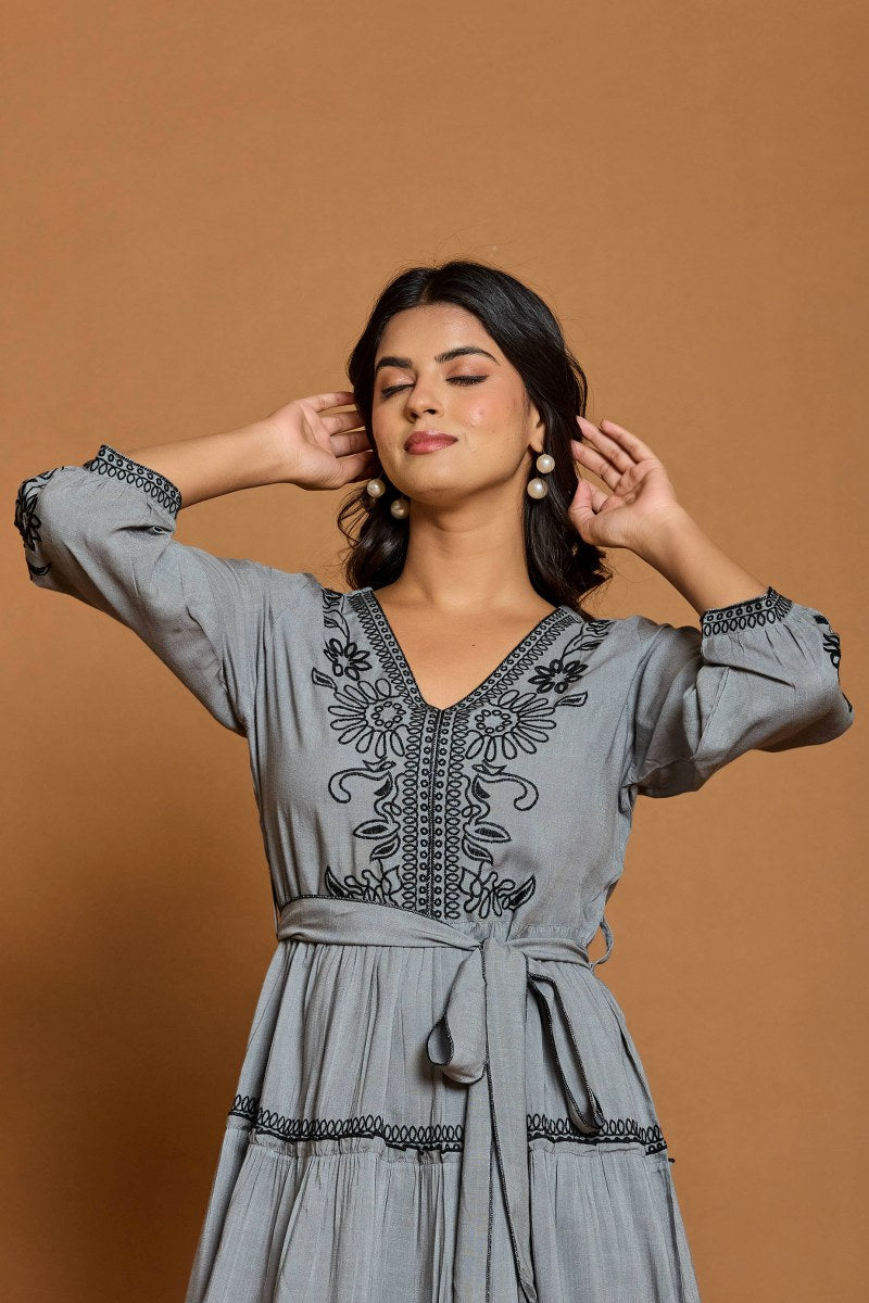 Slate Grey Embroidered A-Line Short Dress with Waist Belt