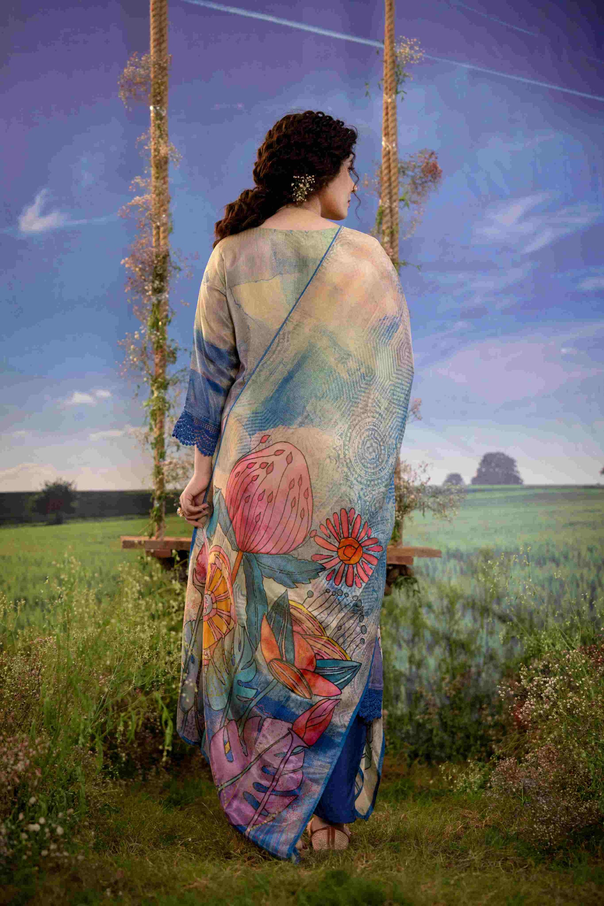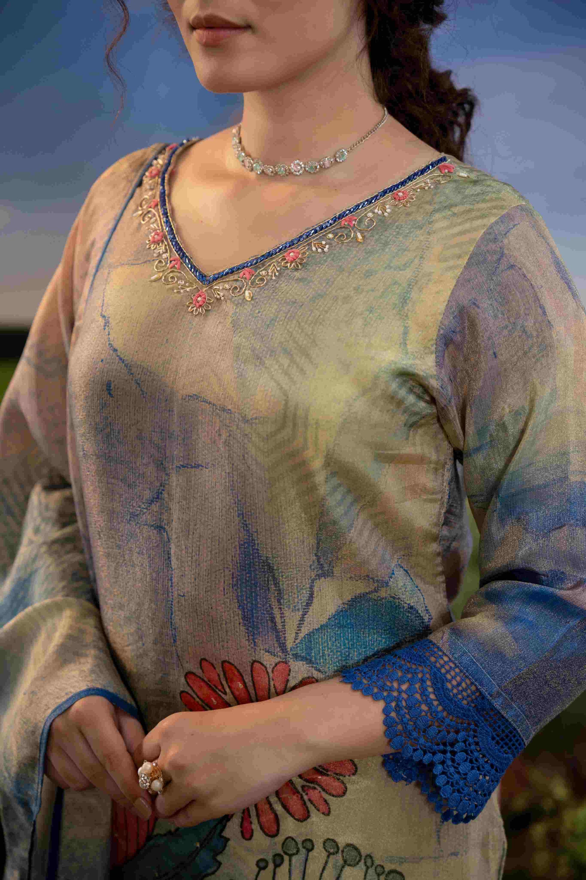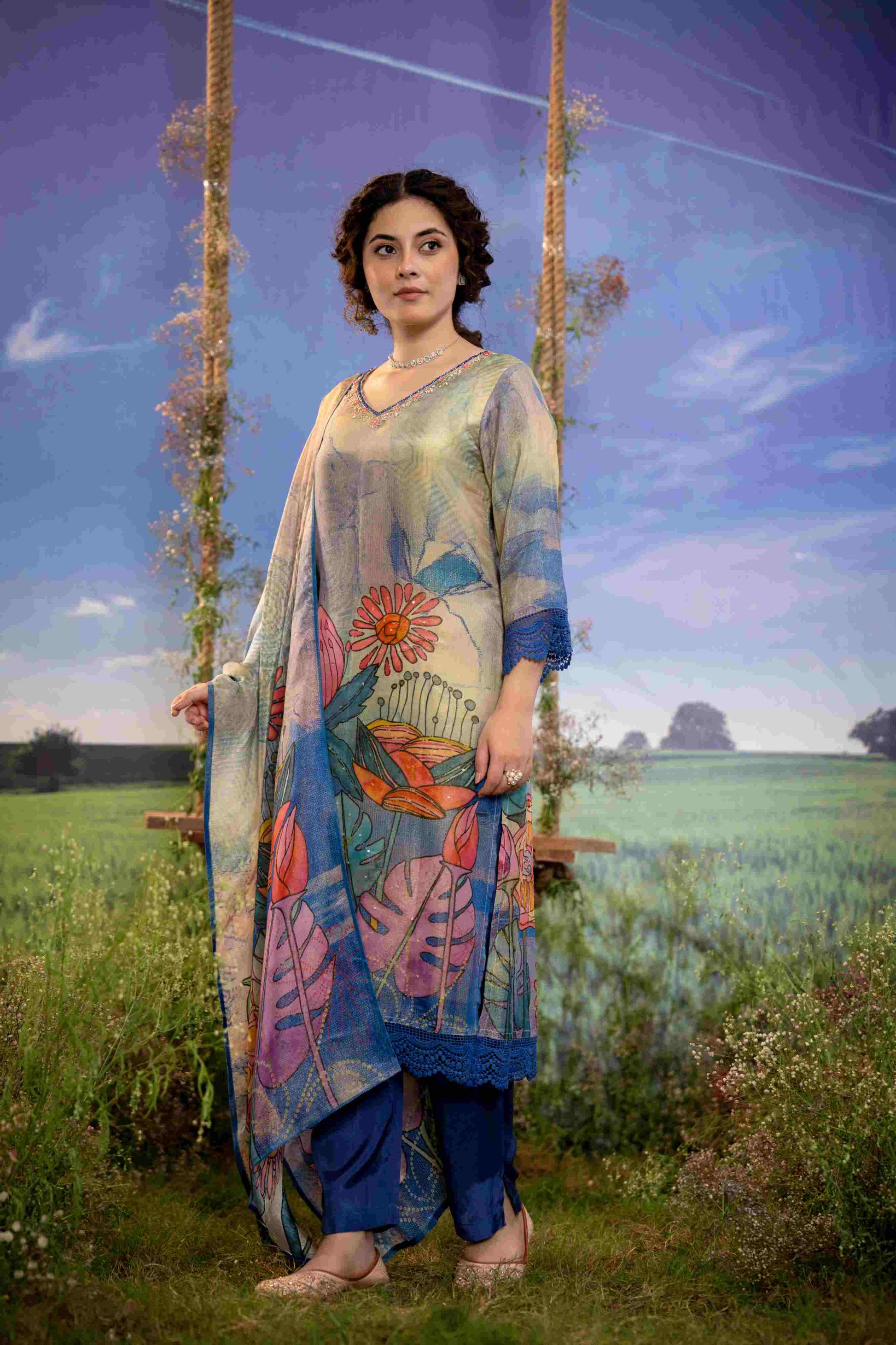 The look is completed with solid blue muslin straight-fit pants and a vibrant printed muslin dupatta adorned with oversized floral and tropical leaf motifs in striking hues of pink, orange, purple, and green—perfect for brunches, festive daywear, and garden gatherings.