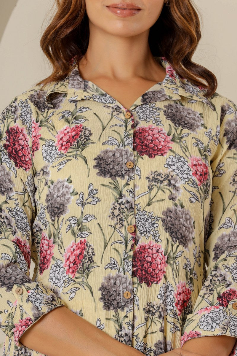 This beige floral printed shirt midi dress is the perfect blend of comfort and style. Featuring a classic shirt collar, button-down front, and 3/4th sleeves, this dress is ideal for casual outings or day events. The beautiful floral print in shades of pink and grey adds a refreshing, elegant touch, while the A-line silhouette ensures a flattering fit for all body types. Pair it with strappy sandals or block heels for a chic, effortless look.