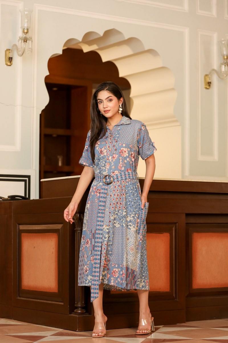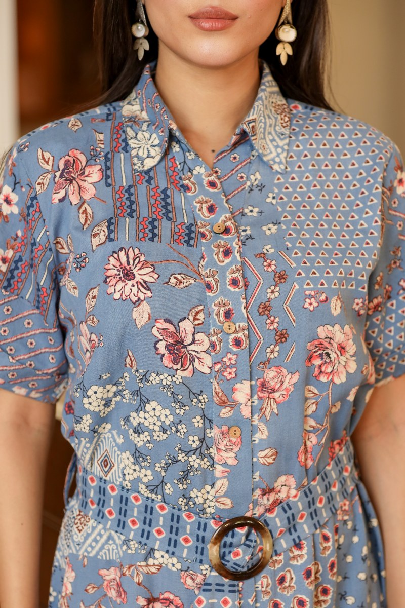 Add a stylish twist to your wardrobe with this blue patchwork print belted shirt midi dress. Featuring a shirt collar, short sleeves, and a button-down front, this dress combines comfort with contemporary style. The adjustable belt with a circular buckle enhances the waistline for a flattering fit, while the unique patchwork-style floral and geometric prints add a bohemian charm. Perfect for brunches, day outings, or semi-formal occasions.