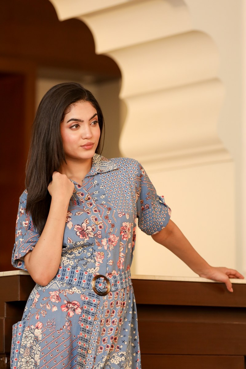 Women's Blue Patchwork Print Belted Shirt Midi Dress