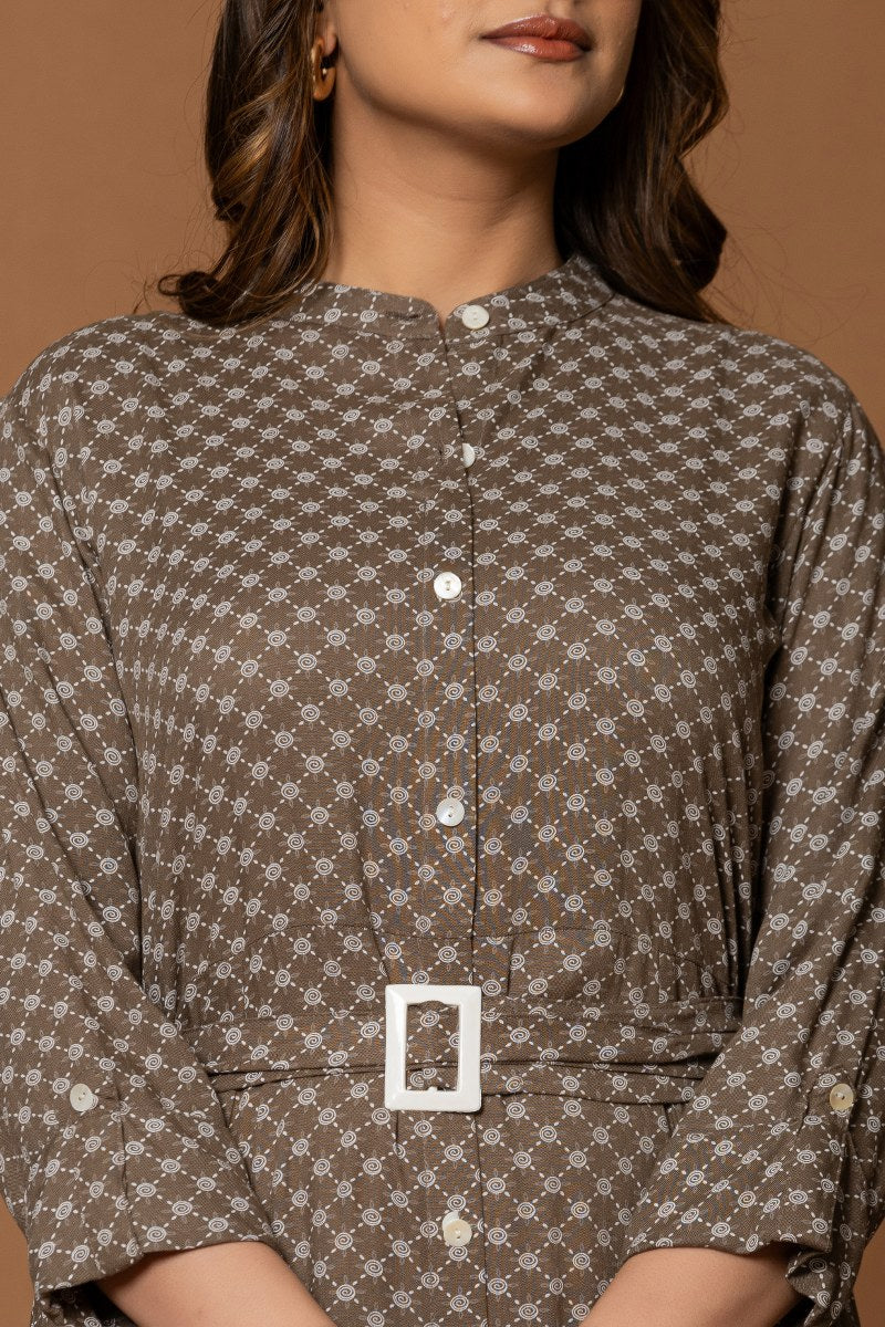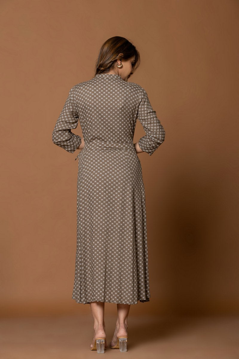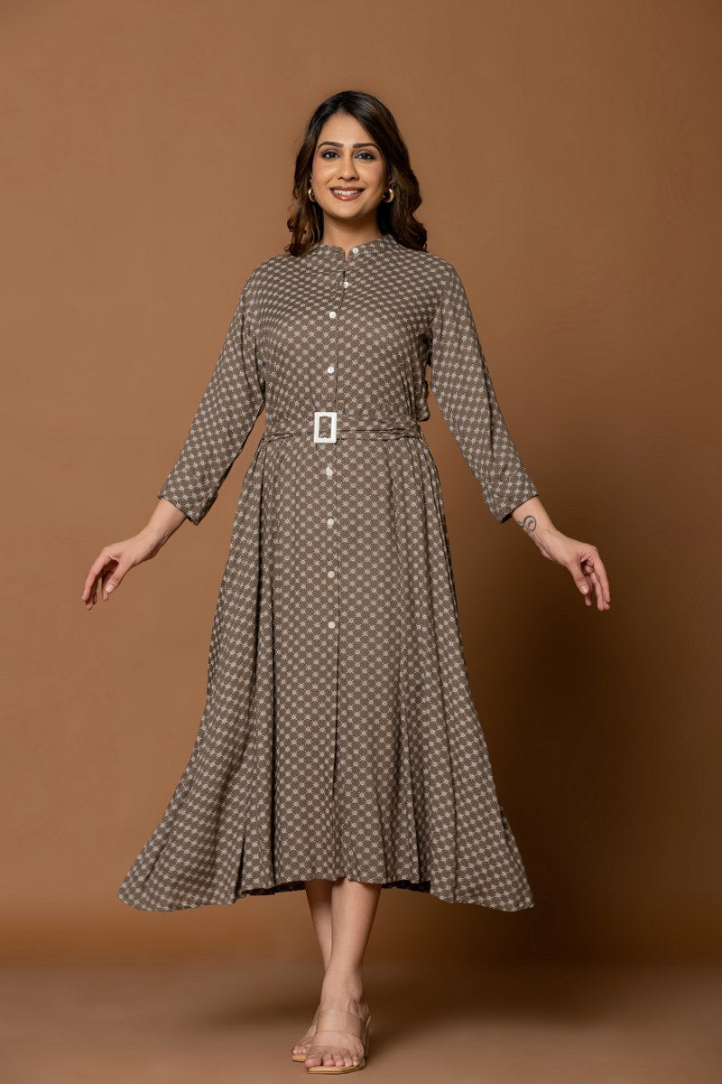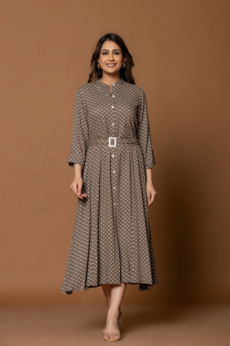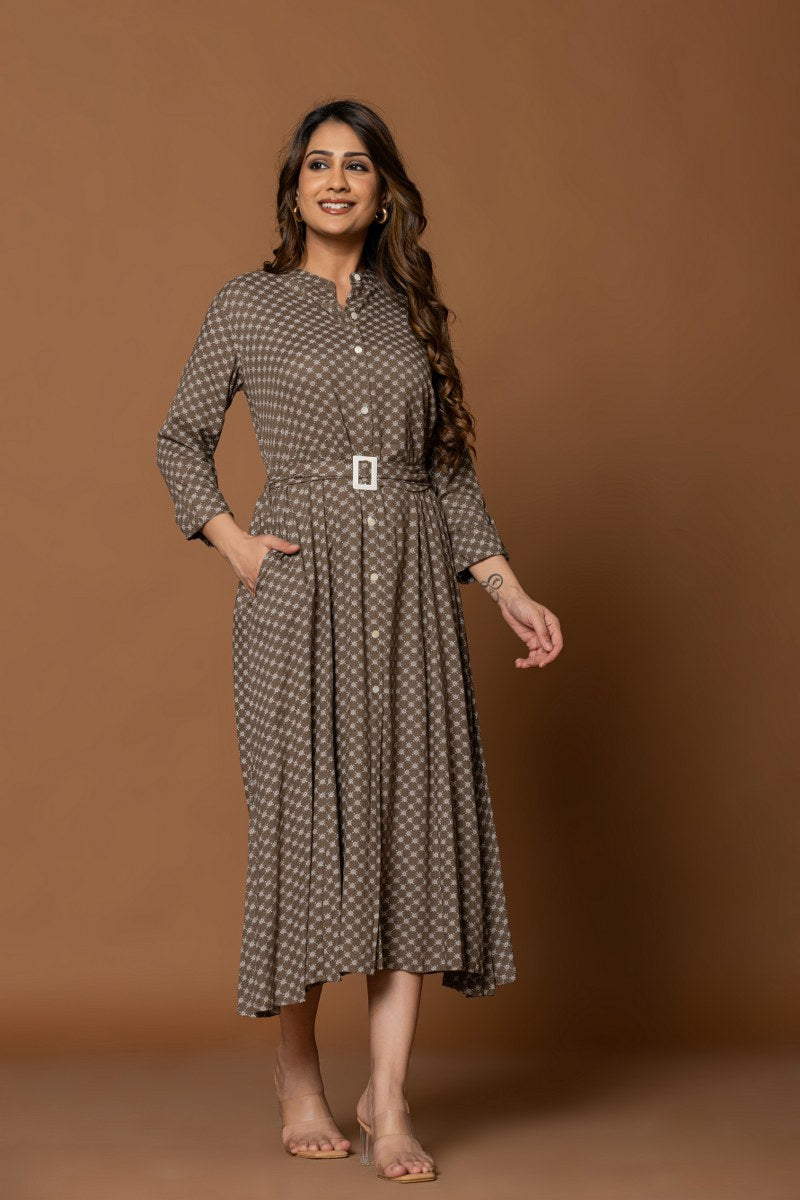 This brown printed belted midi dress is the perfect blend of comfort and style. Featuring a minimal geometric print, a button-down front, and a classy belt with a buckle, this dress offers a flattering A-line silhouette. The round neckline with a slight V-slit and 3/4th sleeves makes it versatile for both casual and semi-formal occasions. Pair it with nude sandals or heels for a chic, elegant look.