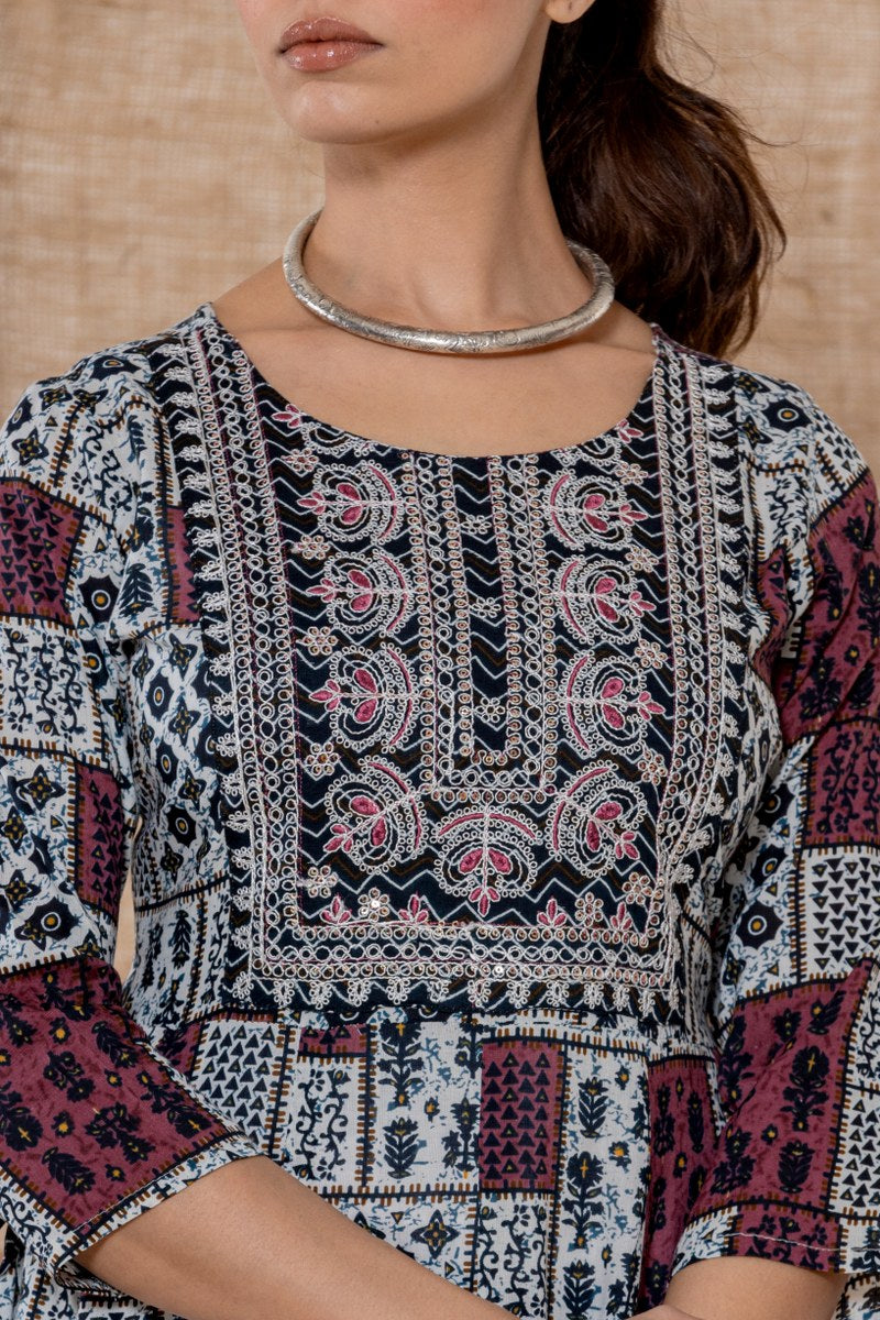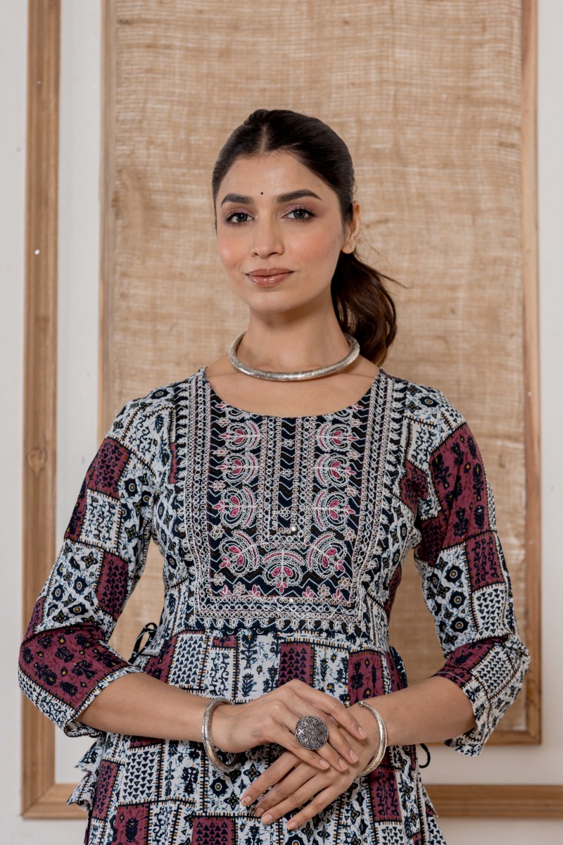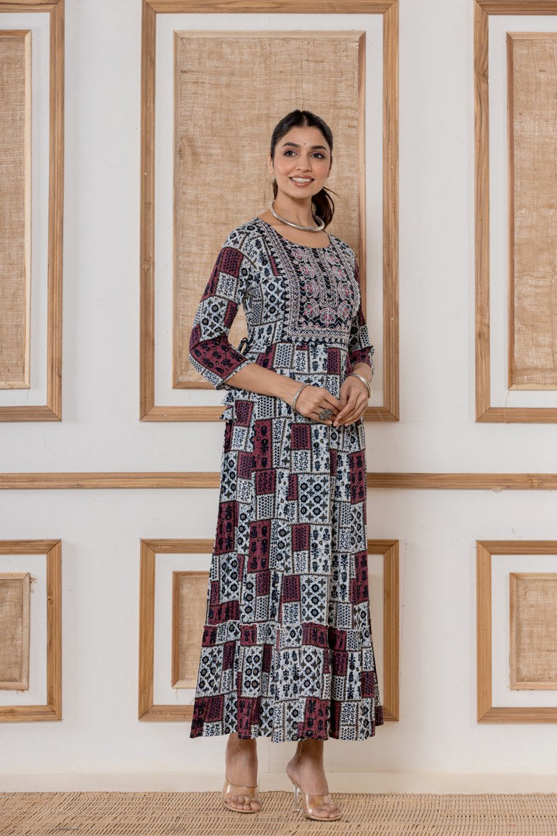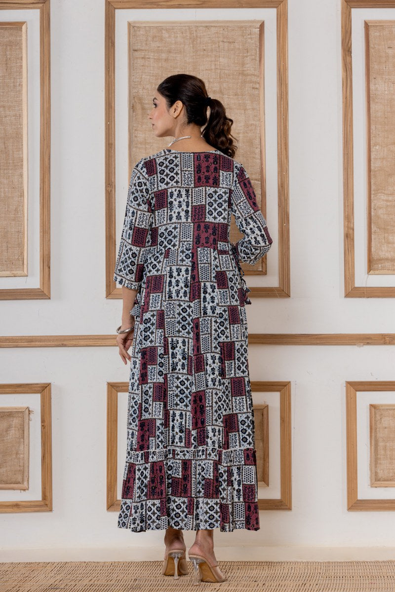 Add a touch of elegance to your wardrobe with this maroon and white printed midi dress. Featuring intricate ethnic-inspired block prints and a flattering fit-and-flare silhouette, this dress is perfect for casual outings, festive occasions, and semi-formal events. The round neckline, 3/4th sleeves, and flowing hem create a sophisticated yet comfortable style. Pair it with heels or flats and traditional jewelry for a complete look.