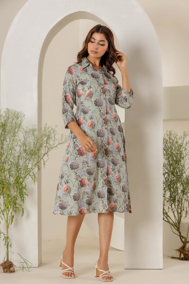 Bring a fresh and elegant vibe to your wardrobe with this sage green floral printed shirt midi dress. Featuring a classic shirt collar, button-down front, and 3/4th sleeves, this dress offers a sophisticated yet comfortable fit. The delicate floral patterns in pink and grey tones add a touch of femininity, making it perfect for brunches, casual outings, or semi-formal events. Style it with strappy heels or flats for a complete look.