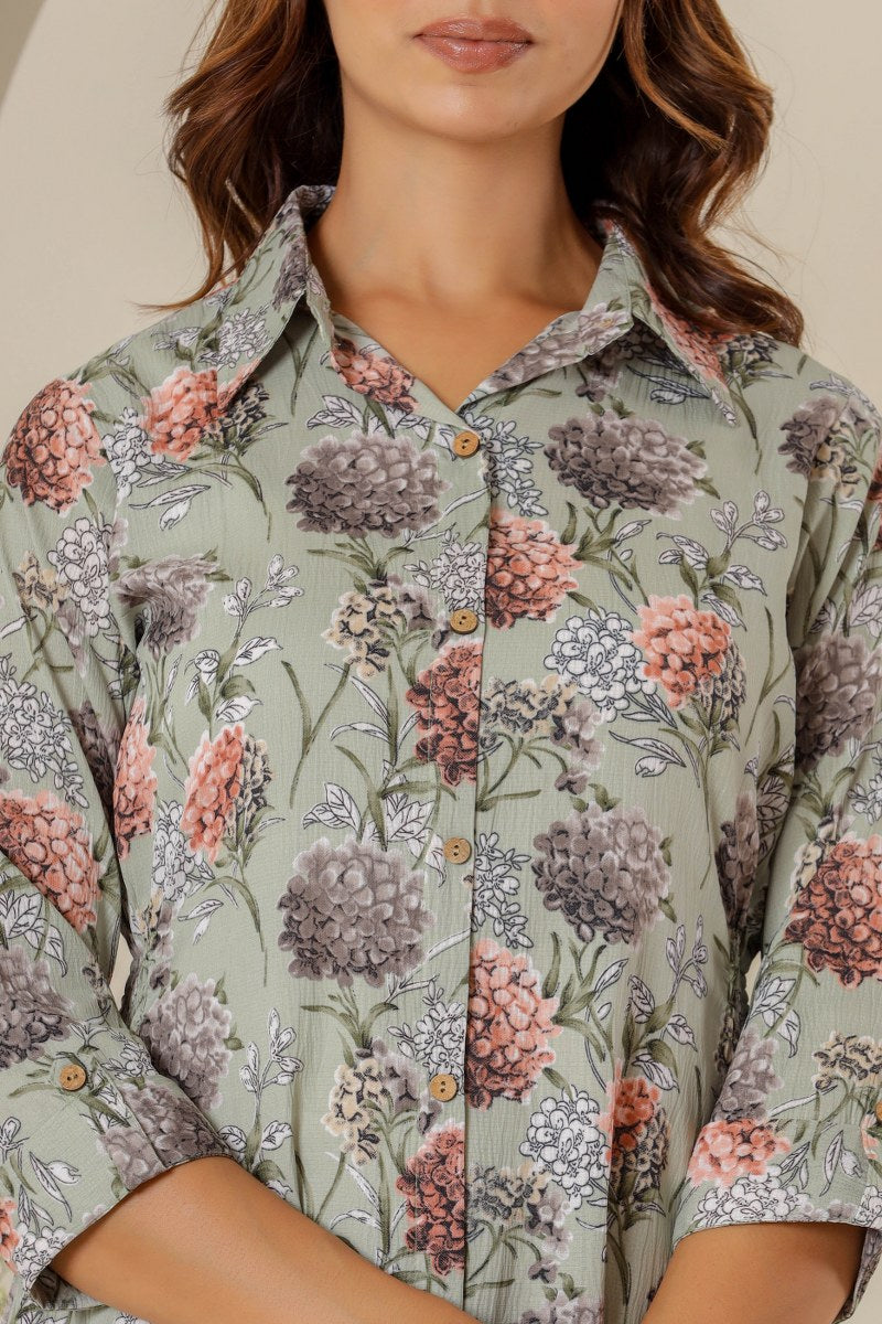 Women's Sage Green Floral Printed Shirt Midi Dress